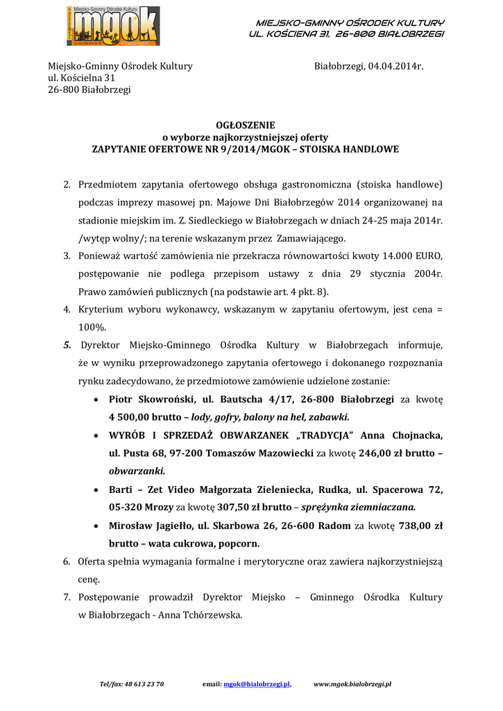 MIEJSKO-GMINNY OŚRODEK KULTURY UL. KOŚCIENA 31, 26-800 BIAŁOBRZEGI Miejsko-Gminny Ośrodek Kultury ul. Kościelna 31 26-800 Białobrzegi Białobrzegi, 04.04.2014r. OGŁOSZENIE o wyborze najkorzystniejszej oferty ZAPYTANIE OFERTOWE NR 9/2014/MGOK – STOISKA HANDLOWE 2. Przedmiotem zapytania ofertowego obsługa gastronomiczna (stoiska handlowe) podczas imprezy masowej pn. Majowe Dni Białobrzegów 2014 organizowanej na stadionie miejskim im. Z. Siedleckiego w Białobrzegach w dniach 24-25 maja 2014r. /wytęp wolny/; na terenie wskazanym przez Zamawiającego. 3. Ponieważ wartość zamówienia nie przekracza równowartości kwoty 14.000 EURO, postępowanie nie podlega przepisom ustawy z dnia 29 stycznia 2004r. Prawo zamówień publicznych (na podstawie art. 4 pkt. 8). 4. Kryterium wyboru wykonawcy, wskazanym w zapytaniu ofertowym, jest cena = 100%. 5. Dyrektor Miejsko-Gminnego Ośrodka Kultury w Białobrzegach informuje, że w wyniku przeprowadzonego zapytania ofertowego i dokonanego rozpoznania rynku zadecydowano, że przedmiotowe zamówienie udzielone zostanie: · Piotr Skowroński, ul. Bautscha 4/17, 26-800 Białobrzegi za kwotę 4 500,00 brutto – lody, gofry, balony na hel, zabawki. · WYRÓB I SPRZEDAŻ OBWARZANEK „TRADYCJA” Anna Chojnacka, ul. Pusta 68, 97-200 Tomaszów Mazowiecki za kwotę 246,00 zł brutto – obwarzanki. · Barti – Zet Video Małgorzata Zieleniecka, Rudka, ul. Spacerowa 72, 05-320 Mrozy za kwotę 307,50 zł brutto – sprężynka ziemniaczana. · Mirosław Jagiełło, ul. Skarbowa 26, 26-600 Radom za kwotę 738,00 zł brutto – wata cukrowa, popcorn. 6. Oferta spełnia wymagania formalne i merytoryczne oraz zawiera najkorzystniejszą cenę. 7. Postępowanie prowadził Dyrektor Miejsko – Gminnego Ośrodka Kultury w Białobrzegach - Anna Tchórzewska. Tel/fax: 48 613 23 70 email: [email protected], www.mgok.bialobrzegi.pl MIEJSKO-GMINNY OŚRODEK KULTURY UL. KOŚCIENA 31, 26-800 BIAŁOBRZEGI 8. Sprawdził pod względem merytorycznym i zatwierdził: Anna Tchórzewska Dyrektor Miejsko-Gminnego Ośrodka Kultury w Białobrzegach Tel./fax: 48 613 23 70 email: [email protected] www.mgok.bialobrzegi.pl 2