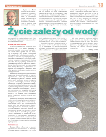 Weterynarz radzi Życie na Ziemi zrodziło się w wodzie. Organizmy zwierzęce, które „wyszły” na ląd dalej w pierwszym etapie swojego życia związane są ze środowiskiem wodnym. I tak u ssaków cały okres ciąży to przeby- ZIELONA LIGA, MARZEC 2014 wewnętrznej równowagi, a jej zaburzenie ma wpływ na takie podstawowe parametry życiowe jak temperatura ciała (u organizmów stałocieplnych), pH krwi i płynów ustrojowych, ciśnienie osmotyczne, objętość płynów ustrojowych, stężenie związków chemicznych w płynach ustrojowych, ciśnienie tętnicze krwi, ciśnienie parcjalne tlenu i dwutlenku węgla we krwi. Czym wyżej zorganizowane zwierzęta, 13 nia tej delikatnej struktury wewnątrzustrojowej, czyli właśnie homeostazy. Lecząc zwierzęta i podając im różne płyny w postaci zastrzyków, wlewów, kroplówek lekarz weterynarii musi wiedzieć nie tylko jaki płyn, o jakim składzie, ale także ile może go podać w określonym czasie. Istnieje także pojęcie „przewodnienia”, które jest także niebezpieczne dla chorego zwierzęcia. Życie zależy od wody Woda jest niezbędna W swojej chemicznej budowie ssaki zawierają ok. 75% wody. Człowiek i zwierzęta potrafią wytrzymać bez jedzenia nawet kilka tygodni, ale bez wody nie przetrwają tak długo. Począwszy od organizmów jednokomórkowych, a kończąc na ssakach, czyli najwyżej sklasyfikowanych organizmach żywych w systematyce, wszyscy potrzebują pożywienia z zewnątrz. Nasze psy i koty, podobnie jak człowiek odżywiają się specjalnie sporządzonymi pokarmami, ale zawsze muszą mieć dostęp do wody. Oczywiście w zależności od wilgotności pokarmu, pory roku, sposobu bycia, zapotrzebowanie na wodę jest różne. Zaburzenia w pobieraniu wody są albo przyczyną nieprawidłowości w żywych organizmach, albo są konsekwencją już istniejących chorób. Dlatego lekarz weterynarii podczas przeprowadzania wywiadu lekarskiego powinien zdobyć informacje zarówno o pobieraniu pokarmu, jak i chęci, ilości pobieranej wody i jej wydalania z organizmu pacjenta. Zarówno stany chorobowe przebiegające z gorączką, wymiotami, czy biegunką, jak i stany emocjonalne spowodowane strachem, zimnem, czy upałem mają zasadniczy wpływ na poziom wody w organizmach zwierząt. Zaburzenia w podaży wody u zwierząt hodowlanych mogą być przyczyną dużych strat gospodarczych. Krowa nie może wyprodukować mleka bez dostarczenia jej wody, która jest podstawowym składnikiem tego produktu. Zwierzęta przebywające na odkrytym pastwisku, którym nie dostarczono wody, są narażone nawet na utratę życia z powodu przegrzania. Co roku natrafiamy na informacje w publikatorach o przypadkach zamknięcia psów w samochodach pozostawionych w nasłonecznionych miejscach w upalne dni. Tutaj także wiele przypadków kończy się tragicznie. Homeostaza Bardzo dobrze rolę wody w żywych organizmach odzwierciedla w fizjologii używane pojęcie homeostazy. To rodzaj pod względem rozwoju, tym mechanizmy kierujące tymi procesami są bardziej skomplikowane, ale też precyzyjniejsze. Człowiek ingerujący w żywy organizm, czy to jako hodowca, żywiący zwierzęta, czy to zootechnik, czy lekarz weterynarii podający medykamenty, musi brać pełną odpowiedzialność za możliwość narusze- Jak więc widzimy, woda na każdym etapie istnienia jest nieodzownym składnikiem wszystkiego, co żyje. Nie dbając o tę zwykłą wodę - czy to lecącą z naszego kranu, czy tę płynącą w strumieniu, działamy na szkodą każdego żywego organizmu. lek. wet. ANDRZEJ ALWEIL Fot. J. Moczulski wanie płodu w wodach płodowych. Etap ten kończący się porodem i opuszczeniem środowiska wodnego.