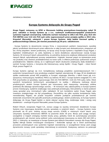 Warszawa, 22 sierpnia 2014 r. INFORMACJA PRASOWA Europa Systems dołączyła do Grupy Paged Grupa Paged, notowany na GPW w Warszawie holding przemysłowo-inwestycyjny nabył 70 proc. udziałów w Europa Systems sp. z o.o., czołowym środkowoeuropejskim producencie systemów logistyki wewnętrznej. Całkowita wartość transakcji to 109,5 mln PLN, przy 19,6 mln PLN EBITDA oraz 13,8 mln PLN zysk netto wypracowanych przez przejętą spółkę w 2013 roku. Krzysztof Marszałek, założyciel i prezes Europa Systems, dalej będzie kierował spółką z podszczecińskiego Żabowa, jak również pozostanie jej 30-proc. udziałowcem. - Europa Systems to dynamicznie rosnąca firma, z nowoczesnym parkiem maszynowym, wysokiej jakości produktami docenianymi przez odbiorców w całej Europie oraz doświadczonym, związanym od lat z firmą zespołem. Jestem przekonany, że łącząc atuty Europa Systems z kapitałem Grupy Paged, z kapitałem intelektualnym na czele, będziemy w stanie dodatkowo zdynamizować rozwój Europa Systems. W minionych latach udowodniliśmy, że potrafimy skutecznie zwiększać efektywność produkcji naszych fabryk, optymalizować procesy zaopatrzenia i logistyki, kreować popyt na wytwarzane przez nas produkty oraz otwierać przedsiębiorstwa na nowe rynki, w efekcie podnosząc zyskowność samych przedsiębiorstw. Głęboko wierzę, że w najbliższych latach skutecznie zwiększymy skalę działalności i wartość Europa Systems, z korzyścią dla Interesariuszy samej Spółki i Grupy Paged – mówi Daniel Mzyk, prezes Paged S.A. Europa Systems zajmuje się m.in. kompleksową realizacją projektów zautomatyzowanych linii i systemów transportowych oraz produkcją urządzeń logistyki wewnętrznej. W ciągu 20 lat działalności spółka zrealizowała ponad 400 projektów w Europie, wspierając klientów z takich branż jak m.in. spożywcza, motoryzacyjna, handlowa, FMCG czy stalowa. W 2013 r. Europa Systems osiągnęła 57,1 mln PLN przychodów ze sprzedaży, wypracowując 19,6 mln PLN EBITDA i 13,8 mln PLN zysku netto. Obok wysokich kompetencji technicznych, pozwalających na szybką i efektywną realizację zleceń produkcyjnych, atutem Europa Systems jest nowoczesny park maszynowy, stanowiący solidną podstawę dla dalszego dynamicznego wzrostu. – W minionym roku zakończyliśmy w Europa Systems proces inwestycyjny, wydatnie zwiększając nasz potencjał produkcyjny. Dziś jesteśmy w stanie podwoić naszą sprzedaż przy minimalnych tylko nakładach. W tym kontekście wybór Grupy Paged, jako inwestora strategicznego nie był przypadkowy. Doceniliśmy nie tylko wysokie kompetencje kadry menedżerskiej Pagedu, ale przede wszystkim unikalne podejście przedsiębiorcze jak również doskonałe zrozumienie dla specyfiki przemysłu produkcyjnego. Jestem przekonany, że Europa Systems dołączając do Grupy Paged będzie w stanie włączyć wyższy bieg, zwiększając skalę i zasięg swej działalności – analizuje Krzysztof Marszałek, prezes Europa Systems. Robert Ditrych, wiceprezes Paged S.A., zwraca uwagę na wysoką rentowność działalności Europa Systems oraz imponującą dynamikę wzrostu sprzedaży w ostatnich latach. – Europa Systems może pochwalić się 45 proc. średnią roczną stopą wzrostu (CAGR) w minionych trzech latach, przy utrzymaniu wysokiej rentowności EBITDA na poziomie około 30 proc. Biorąc pod uwagę rosnące, szczególnie w krajach emerging markets koszty pracy, globalny trend do automatyzacji procesów produkcyjnych, jak również samą wielkość rynku automatyzacji (szacowaną na około 200 mld USD w 2015 r.), wierzymy, że inwestycja w Europa Systems jest dobrym kierunkiem rozwoju dla Grupy Paged. Spółka oferuje bardzo innowacyjne rozwiązania i doskonale wpisuje się w trend automatyzacji procesów produkcyjnych oraz systemów logistyki wewnętrznej, w szczególności biorąc pod uwagę dynamicznie rosnący rynek sprzedaży internetowej (e-commerce). Zważywszy zarówno na potencjał „Paged” S.A. z siedzibą w Warszawie, ul. Żurawia 45, 00-680 WARSZAWA tel.: (22) 440 13 44 | faks: (22) 440 13 46 | E-mail: [email protected] www.paged.pl www.inwestor.paged.pl sąd rejestrowy: Sąd Rejonowy dla m.st. Warszawy XII Wydz. Gospodarczy KRS KRS: 0000015401 NIP: 526-10-09-095 REGON: 010800595 kapitał zakładowy: 30.380.002,- zł, w całości wpłacony rynku, na którym działa Europa Systems jak i potencjał samej spółki, zdolnej umacniać swoją pozycję rynkową, mamy wszelkie podstawy ku temu by sądzić, że w kolejnych latach, przy naszym aktywnym wsparciu, Europa Systems będzie w stanie zdynamizować swój rozwój i osiągać jeszcze lepsze wyniki finansowe. - Nie bez znaczenia, z punktu widzenia Grupy Paged, jest wysoka zdolność Europa Systems do generowania dodatnich przepływów pieniężnych oraz brak zadłużenia finansowego przed transakcją. Jestem przekonany, że akwizycja Europa Systems nie tylko istotnie wzmocni nasz potencjał finansowy, ale również uczyni Grupę Paged jeszcze atrakcyjniejszym partnerem biznesowym oraz celem inwestycyjnym zarówno dla obecnych, jak i nowych Akcjonariuszy – mówi Robert Ditrych. Grupę Kapitałową Paged tworzą podmiot dominujący Paged S.A. oraz grupa spółek zależnych skupionych w 6 głównych segmentach działalności: sklejkowym, meblowym, zarządzania wierzytelnościami, handlowym, nieruchomości oraz pozostałej działalności. W roku 2013 Grupa Paged osiągnęła 686,7 mln PLN skonsolidowanych przychodów ze sprzedaży, wypracowując 105,5 mln PLN EBITDA oraz 58,4 mln PLN zysku netto przypadającego na akcjonariuszy jednostki dominującej. „Paged” S.A. z siedzibą w Warszawie, ul. Żurawia 45, 00-680 WARSZAWA tel.: (22) 440 13 44 | faks: (22) 440 13 46 | E-mail: [email protected] www.paged.pl www.inwestor.paged.pl sąd rejestrowy: Sąd Rejonowy dla m.st. Warszawy XII Wydz. Gospodarczy KRS KRS: 0000015401 NIP: 526-10-09-095 REGON: 010800595 kapitał zakład
