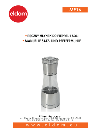 MP16 RĘCZNY MŁYNEK DO PIEPRZU I SOLI MANUELLE SALZ- UND PFEFFERMÜHLE Eldom Sp. z o.o. u l . Pa w ł a C h r o m i k a 5 a , 4 0 - 2 3 8 Ka t o w i c e , P O L A N D tel: 32 255-33-40, fax: 32 253-04-12 w w w . e l d o m . e u BEZPIECZEŃSTWO UŻYTKOWANIA Przed pierwszym użyciem należy uważnie zapoznać się z całością treści niniejszej instrukcji - urządzenia nie wolno zanurzać w wodzie lub spryskiwać wodą - używać tylko do mielenia pieprzu i soli. Mielenie innych przypraw spowoduje utratę gwarancji, - nie należy wystawiać urządzenia na działanie promieni słonecznych, gorących powierzchni i wilgoci - Niniejszy sprzęt może być użytkowany przez dzieci w wieku co najmniej 8 lat i przez osoby o obniżonych możliwościach fizycznych, umysłowych i osoby o braku doświadczenia i znajomości sprzętu, jeżeli zapewniony zostanie nadzór lub instruktaż odnośnie do użytkowania sprzętu w bezpieczny sposób, tak aby związane z tym zagrożenia były zrozumiałe. Dzieci nie powinny bawić się sprzętem. Dzieci bez nadzoru nie powinny wykonywać czyszczenia i konserwacji sprzętu. - urządzenie przeznaczone jest tylko do użytku domowego - nie używać na wolnym powietrzu - nie wolno używać urządzenia jeżeli spadło, lub gdy ma widoczne ślady uszkodzenia - nie należy otwierać i naprawiać urządzenia samemu (grozi to utratą gwarancji) - w przypadku jakichkolwiek problemów technicznych prosimy zwracać się do uprawnionego serwisu - napraw sprzętu może dokonać jedynie autoryzowany punkt serwisowy. Wszelkie modernizacje lub stosowanie nieoryginalnych części zamiennych lub elementów urządzenia jest zabronione i zagraża bezpieczeństwu użytkowania - Firma Eldom Sp. z o. o. nie ponosi odpowiedzialności za ewentualne szkody powstałe w wyniku niewłaściwego używania urządzenia 2 INSTRUKCJA OBSŁUGI RĘCZNY MŁYNEK DO PIEPRZU I SOLI MP16 1 OPIS OGÓLNY 1. Nakrętka blokująca 2. Korpus 3. Pojemnik na pieprz (P) 4. Pojemnik na sól (S) 5. Podstawa 2 B A A. Regulacja grubości mielenia soli B. Regulacja grubości mielenia pieprzu fot. 1 3 4 OBSŁUGA Ręczny młynek MP16 jest przeznaczony do mielenia pieprzu i soli. Mielenie innych przypraw spowoduje utratę gwarancji. MIELENIE PRZYPRAW Aby wsypać przyprawy należy odkręcić i zdjąć nakrętkę blokującą (1), następnie wysunąć korpus (2). 5 Przyprawy należy wsypywać do odpowiednich pojemników: - pieprz do pojemnika (3), oznaczonego wewnątrz literą „P” - sól do pojemnika (4), oznaczonego wewnątrz literą „S” Po wsypaniu przypraw należy założyć dokładnie korpus (2) oraz przykręcić nakrętkę blokującą (1). W celu zmielenia przypraw należy złapać jedną ręką za podstawę (5), drugą ręką obracać korpus górny (2) zgodnie z oznaczeniami na nim: - mielenie pieprzu: obrót zgodnie z ruchem wskazówek zegara - mielenie soli: obrót przeciwnie do ruchu wskazówek zegara W podstawie młynka znajduje się regulacja grubości mielenia (fot 1). - pokrętło A: regulacja mielenia soli - pokrętło B: regulacja mielenia pieprzu Dla ułatwienia żarna wykonano w innych kolorach. Biały kolor przy pokrętle (A), oraz szary przy pokrętle (B). Nie należy przeprowadzać regulacji podczas pracy młynka. Należy unikać zawilgocenia urządzenia. CZYSZCZENIE I KONSERWACJA - urządzenia nie wolno zanurzać w wodzie - obudowę przecierać wilgotną szmatką 3 OCHRONA ŚRODOWISKA - urządzenie jest zbudowane z materiałów, które mogą być poddane ponownemu przetwarzaniu lub recyklingowi, - należy je przekazać do odpowiedniego punktu, który zajmuje się zbieraniem i recyklingiem urządzeń elektrycznych i elektronicznych, WARUNKI GWARANCJI Producent zapewnia dobrą jakość i dobre działanie sprzętu, którego dotyczy niniejsza gwarancja w okresie 24 miesięcy od daty sprzedaży zapisanej w dowodzie zakupu. Wady lub uszkodzenia sprzętu ujawnione w okresie gwarancji, będą naprawiane bezpłatnie na terenie RP w terminie 14 dni roboczych od daty dostarczenia niesprawnego urządzenia do punktu serwisowego wraz z dowodem zakupu. Reklamujący powinien dostarczyć uszkodzony sprzęt wraz z dowodem zakupu do centralnego punktu serwisowego na adres: Eldom Sp. z o.o. 40-238 Katowice, ul. Pawła Chromika 5A. Przesyłka powinna być należycie zabezpieczona (zaleca się użycie oryginalnego opakowania). Urządzenie można wysłać na koszt gwaranta za pośrednictwem Poczty Polskiej jako przesyłkę „PACZKA48” zaznaczając tylko opcję „OPŁATĘ UISZCZA ADRESAT”. Pojęcie "naprawa" nie obejmuje czynności wymienionych w instrukcji obsługi (np. czyszczenie lub konserwacja), do wykonania których zobowiązany jest użytkownik we własnym zakresie. Termin naprawy, w przypadku dostarczenia do centralnego punktu serwisowego wysyłką pocztową lub za innym pośrednictwem ulegnie przedłużeniu o czas niezbędny do dostarczenia i odbioru sprzętu. Gwarancją nie są objęte uszkodzenia powstałe w wyniku niewłaściwego lub niezgodnego z instrukcją jego użytkowania, przechowywania, konserwacji, samowolnego zrywania plomb, wszelkich uszkodzeń mechanicznych oraz na skutek naturalnego, częściowego lub całkowitego zużycia zgodnie z właściwościami lub przeznaczeniem towaru. Gwarancja nie obejmuje żarówek, baterii i akumulatorów. Gwarancja nie wyłącza, nie ogranicza ani nie zawiesza uprawnień kupującego wynikających z przepisów o rękojmi za wady rzeczy sprzedanej. Sprzęt przeznaczony jest wyłącznie dla konsumenta do prywatnego użytku w gospodarstwie domowym, w przypadku innego użytkowania traci gwarancję 4 SICHERHEITSHINWEISE - Vor dem Gebrauch die Bedienungsanweisung genau lesen. - Das Gerät darf nicht im Wasser eingetaucht, oder mit Wasser besprüht werden. - Bitte verwenden Sie das Produkt nur in seiner bestimmungsgemäßen Art und Weise. Das Gerät ist ausschließlich zum Salz- und Pfeffermahlen bestimmt, sonst droht die Garantieverlust. Das Gerät soll nicht auf Wi