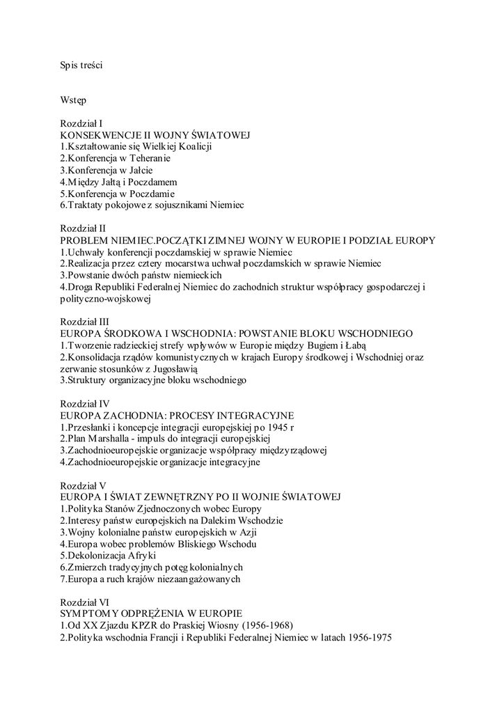 Spis treści Wstęp Rozdział I KONSEKWENCJE II WOJNY ŚWIATOWEJ 1.Kształtowanie się Wielkiej Koalicji 2.Konferencja w Teheranie 3.Konferencja w Jałcie 4.M iędzy Jałtą i Poczdamem 5.Konferencja w Poczdamie 6.Traktaty pokojowe z sojusznikami Niemiec Rozdział II PROBLEM NIEM IEC.POCZĄTKI ZIM NEJ WOJNY W EUROPIE I PODZIAŁ EUROPY 1.Uchwały konferencji poczdamskiej w sprawie Niemiec 2.Realizacja przez cztery mocarstwa uchwał poczdamskich w sprawie Niemiec 3.Powstanie dwóch państw niemieckich 4.Droga Republiki Federalnej Niemiec do zachodnich struktur współpracy gospodarczej i polityczno-wojskowej Rozdział III EUROPA ŚRODKOWA I WSCHODNIA: POWSTANIE BLOKU WSCHODNIEGO 1.Tworzenie radzieckiej strefy wpływów w Europie między Bugiem i Łabą 2.Konsolidacja rządów komunistycznych w krajach Europy środkowej i Wschodniej oraz zerwanie stosunków z Jugosławią 3.Struktury organizacyjne bloku wschodniego Rozdział IV EUROPA ZACHODNIA: PROCESY INTEGRACYJNE 1.Przesłanki i koncepcje integracji europejskiej po 1945 r 2.Plan M arshalla - impuls do integracji europejskiej 3.Zachodnioeuropejskie organizacje współpracy międzyrządowej 4.Zachodnioeuropejskie organizacje integracyjne Rozdział V EUROPA I ŚWIAT ZEWNĘTRZNY PO II WOJNIE ŚWIATOWEJ 1.Polityka Stanów Zjednoczonych wobec Europy 2.Interesy państw europejskich na Dalekim Wschodzie 3.Wojny kolonialne państw europejskich w Azji 4.Europa wobec problemów Bliskiego Wschodu 5.Dekolonizacja Afryki 6.Zmierzch tradycyjnych potęg kolonialnych 7.Europa a ruch krajów niezaangaŜowanych Rozdział VI SYM PTOM Y ODPRĘśENIA W EUROPIE 1.Od XX Zjazdu KPZR do Praskiej Wiosny (1956-1968) 2.Polityka wschodnia Francji i Republiki Federalnej Niemiec w latach 1956-1975 3.Konferencja Bezpieczeństwa i Współpracy w Europie Rozdział VII ROZKŁAD "REALNEGO SOCJALIZM U" I ZMIANY POLITYCZNE W EUROPIE 1.Implikacje Aktu końcowego KBWE w krajach Europy Środkowej i Wschodniej 2.Od jawności i przebudowy do upadku ZSRR 3.Rozwiązanie Rady Wzajemnej Pomocy Gospodarczej i Układu Warszawskiego Rozdział VIII PORZĄDEK M IĘDZYNARODOWY W NOWEJ EUROPIE 1.M iędzynarodowe uwarunkowania zjednoczenia Niemiec 2.Subregionalne struktury współpracy w Europie środkowej i Wschodniej 3.Rada Europy 4.Trójkąt Weimarski: konsultacje w duchu europejskiej jedności Rozdział IX INTEGRACJA EUROPEJSKA U PROGU XXI WIEKU 1.Unia Europejska na rozdroŜu 2.Traktat Amsterdamski o Unii Europejskiej 3.Wspólna waluta euro 4.Traktat o Unii Europejskiej przyjęty w Nicei 5.Projekt traktatu ustanawiającego Konstytucję dla Europy Rozdział X UNIA EUROPEJSKA PO ROZSZERZENIU- NOWE SĄSIEDZTWO I AM BICJE GLOBALNE 1.Rozszerzenie Unii Europejskiej na Wschód 2.Granice Unii Europejskiej oraz współpraca z sąsiadami ze Wschodu i Południa 3.Rozszerzona Unia Europejska wobec problemu nielegalnej imigracji 4.Unia Europejska wobec procesów globalizacji Rozdział XI BEZPIECZEŃSTWO EUROPY NA PRZEŁOM IE XX i XXI WIEKU 1.Sojusz Północnoatlantycki przed nowymi wyzwaniami 2.Od Europejskiej ToŜsamości Bezpieczeństwa i Obrony do Europejskiej Polityki Bezpieczeństwa i Obrony 3.Organizacja Bezpieczeństwa i Współpracy w Europie 4.Wspólnota Niepodległych Państw Rozdział XII STOSUNKI TRANSATLANTYCKIE 1.Ramy formalne współpracy transatlantyckiej 2.Stosunki transatlantyckie w dziedzinie bezpieczeństwa 3.Kwestia Iraku główną przyczyną napięcia w stosunkach transatlantyckich 4.Transatlantyckie stosunki gospodarcze po upadku systemu dwubiegunowego 5.Rola Francji w stosunkach transatlantyckich 6.Wpływ rozszerzenia Unii Europejskiej na stosunki transatlantyckie Rozdział XIII PORY I KONFLIKTY W EUROPIE PO ZAKOŃCZENIU ZIM NEJ WOJNY 1.Wojna w Czeczenii 2.Konflikt wokół Kosowa 3.Konflikt w Irlandii Północnej 4.Walka o niepodległość Baskonii Zakończenie Bibliografia Indeks nazw geograficznych Indeks instytucji, deklaracji i porozumień międzynarodowych Indeks nazwisk