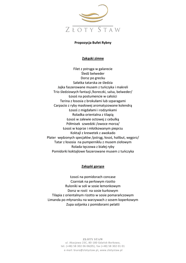 Propozycja Bufet Rybny Zakąski zimne Filet z pstrąga w galarecie Śledź belweder Dorsz po grecku Sałatka tatarska ze śledzia Jajka faszerowane musem z tuńczyka i makreli Trio śledziowych fantazji /koreczki, salsa, belweder/ Łosoś na postumencie w całości Terina z łososia z brokułami lub szparagami Carpacio z ryby masłowej aromatyzowane kolendrą Łosoś z migdałami i rodzynkami Roladka orientalna z tilapią Łosoś w zalewie octowej z cebulką Półmisek szwedzki /owoce morza/ Łosoś w koprze i młotkowanym pieprzu Koktajl z krewetek z awokado Plater wędzonych specjałów /pstrąg, łosoś, halibut, węgorz/ Tatar z łososia na pumperniklu z musem ziołowym Rolada tęczowa z białej ryby Pomidorki koktajlowe faszerowane musem z tuńczyka Zakąski gorące Łosoś na pomidorach concase Czarniak na perłowym rizotto Ruloniki w soli w sosie lemonkowym Dorsz w rosti na sosie kurkowym Tilapia z orientalnym rizotto w sosie pomarańczowym Limanda po młynarsku na warzywach z sosem koperkowym Zupa soljanka z pomidorami pelatti ZŁOTY STAW ul. Akacjowa 23C, 80-180 Gdańsk-Borkowo, tel. (+48) 58 302 06 06(05), fax (+48) 58 302 01 01 e-mail: [email protected] , www.zlotystaw.pl