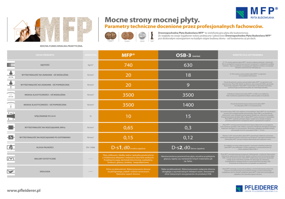 Mocne strony mocnej płyty. Parametry techniczne docenione przez profesjonalnych fachowców. Drewnopochodna Płyta Budowlana MFP® to wielofunkcyjna płyta dla budownictwa. Ze względu na swoje wyjątkowe walory praktyczne i jakościowe Drewnopochodna Płyta Budowlana MFP® jest doskonałym rozwiązaniem na każdym etapie budowy domu - od fundamentu aż po dach. CECHA PRODUKTU JEDNOSTKA MFP® OSB-3 (norma) KORZYŚCI DLA UŻYTKOWNIKA GĘSTOŚĆ kg/m3 740 630 O 17% wyższa gęstość płyty MFP® oznacza większą spoistość i sztywność. Ma to szczególne znaczenie przy pracach związanych z układaniem podłóg i dachów - fugi na podłodze nie pękają pod wpływem kroków a krawędzie okładziny dachowej nie odchylają się. WYTRZYMAŁOŚĆ NA ZGINANIE - OŚ WZDŁUŻNA N/mm2 20 18 O 10% wyższa wytrzymałość płyty MFP® na zginanie we wszystkich kierunkach. WYTRZYMAŁOŚĆ NA ZGINANIE - OŚ POPRZECZNA N/mm2 20 9 Ponad dwukrotnie wyższa wytrzymałość płyty MFP® na zginanie w osi poprzecznej. Płytę OSB układa się dłuższą osią w poprzek belek- generując dużą liczbę odpadów. Płytę MFP® można kłaść w dowolnym kierunku, wykorzystując powierzchnię płyty do ostatniego kawałka. MODUŁ ELASTYCZNOŚCI - OŚ WZDŁUŻNA N/mm2 3500 3500 Jednakowa elastyczność płyty MFP® co OSB w osi wzdłużnej. Brak możliwości popełnienia błędu ułożenia płyty na budowie. MODUŁ ELASTYCZNOŚCI - OŚ POPRZECZNA N/mm2 3500 1400 Ponad dwukrotnie lepsza elastyczność płyty MFP® niż całej płyty OSB-3 w osi poprzecznej. 15 Pęcznienie płyty OSB-3 jest większe na krawędziach. Płyta MFP® po wyschnięciu powraca do swojego kształtu pierwotnego. Płyta OSB-3 nie posiada tej właściwości, więc niezbędna jest jej dalsza obóbka np. szlifowanie kawędzi. W przeciwieństwie do płyty OSB-3, płytę MFP® można stosować w łazienkach. Płyta MFP® szybciej cyrkuluje wilgoć i dzięki temu istnieje mniejsze prawdopodobieństwo wystąpienia pleśni i zagrzybienia na płycie. SPĘCZNIENIE PO 24 H 10 % WYTRZYMAŁOŚĆ NA ROZCIĄGANIE (MPa) N/mm2 0,65 0,3 Płytę MFP® cechuje poonad dwukrotnie lepsza odporność na rozciąganie, czyli trzymanie gwoździ, śrób, kołków i zawiasów. Możliwość dźwigania znacząco większych obciążeń na mocowaniach. Minimalna odległość gwoździa/wkrętu od krawędzi to 8 mm, przy płycie OSB-3 - 10 mm. WYTRZYMAŁOŚĆ NA ROZCIĄGANIE PO GOTOWANIU N/mm 0,15 0,12 Wyższa o 25% wytrzymałość płyty MFP® gwarantuje stabilność mocowań, nawet pod wpływem bardzo zmiennych lub skrajnych warunków klimatycznych. Zaletą płyty MFP® jest jej mniejsza deprecjacja pod wpływem czasu. EN 13986 D-s1, d0 (trudno zapalna) KLASA PALNOŚCI 2 D-s2, d0 (łatwo zapalna) Ze względu na swoją większą gęstość i zawartość niepalnej melaminy, płyta MFP® jest mateiałem „trudno zapalnym”, w przeciwieństwie do „łatwo zapalnej” płyty OSB-3. WALORY ESTETYCZNE Płyty szlifowane. Gładka, ładna i jednolita powierzchnia z możliwością oklejania i malowania (bez farb wodnych). Przyklejanie papy, dachówki bitumicznej, wykładziny, linoleum, glazury, terakoty - bezproblemowe. Nierównomierna powierzchnia płyty utrudnia przyklejenie glazury, tapety czy naniesienie innych materialów jak np. farba. Płyta MFP® posiada lepszą przyczepność (adhezyjność), możliwość bejcowania, malowania, tapetowania (bez farb i klejów wodnych) oraz fornirowania (płyty OSB-3 nie da się fornirować). Płyta MFP® dzięki dużej sztywności doskonale nadaje się do szalunków, zrembki nie odrywają się z betonem. Krawędziełatwo ulegają obróbce w przeciwieństwie do płyty OSB. Doskonała do znakowania w przypadku np opakowań. EKOLOGIA Pełna recyklowalność. Wykorzystywanie drewna recyklingowego, zrębek i wiórów tartacznych. Naturalny zapach drewna. Słaba recyklowalność. Wykorzystywanie wyłącznie drewna okragłego z wycinek leśnych młodych sosen. Stosowanie silnie toksycznych izocyjanianów do produkcji OSB. Płyta MFP® powstaje w procesie produkcji o zminimalizowanej emisji CO2, z drewna recyclingowego oraz przetworzonego surowca tartacznego. Dodatkowy atut to wysoka wydajność płyty MFP® (niska ilość powstających odpadów) oaz naturalny zapach drewna.