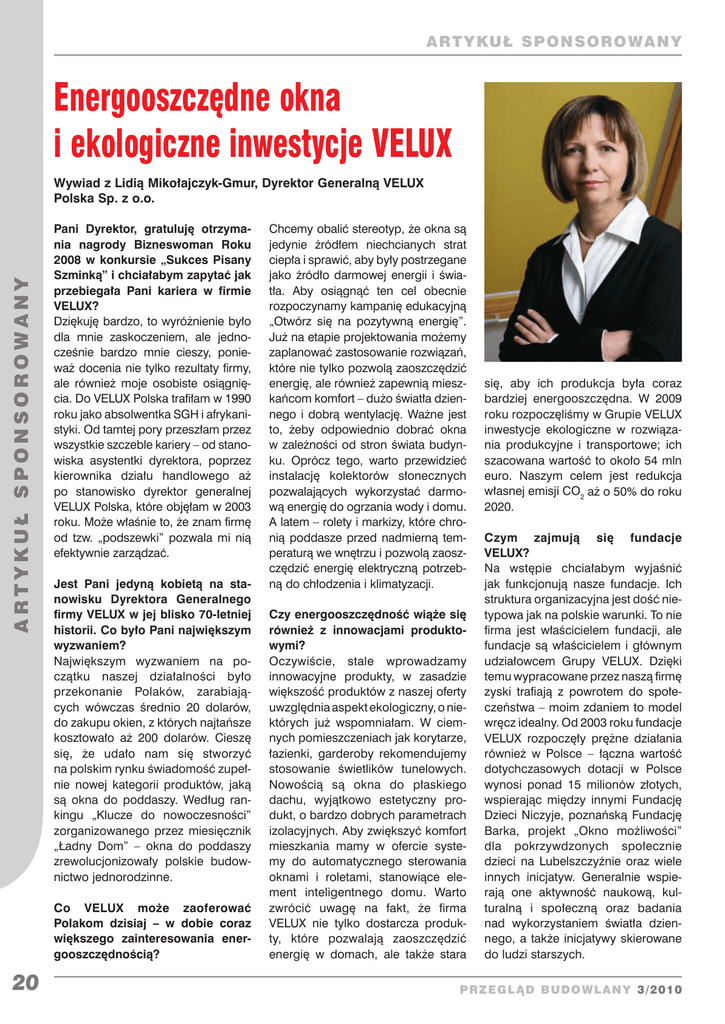 ARTYKUŁ S PON S OROWANY Energooszczędne okna i ekologiczne inwestycje VELUX A R T Y K U Ł S P ON S O R OWANY Wywiad z Lidią Mikołajczyk-Gmur, Dyrektor Generalną VELUX Polska Sp. z o.o. Pani Dyrektor, gratuluję otrzymania nagrody Bizneswoman Roku 2008 w konkursie „Sukces Pisany Szminką” i chciałabym zapytać jak przebiegała Pani kariera w firmie VELUX? Dziękuję bardzo, to wyróżnienie było dla mnie zaskoczeniem, ale jednocześnie bardzo mnie cieszy, ponieważ docenia nie tylko rezultaty firmy, ale również moje osobiste osiągnięcia. Do VELUX Polska trafiłam w 1990 roku jako absolwentka SGH i afrykanistyki. Od tamtej pory przeszłam przez wszystkie szczeble kariery – od stanowiska asystentki dyrektora, poprzez kierownika działu handlowego aż po stanowisko dyrektor generalnej VELUX Polska, które objęłam w 2003 roku. Może właśnie to, że znam firmę od tzw. „podszewki” pozwala mi nią efektywnie zarządzać. Jest Pani jedyną kobietą na stanowisku Dyrektora Generalnego firmy VELUX w jej blisko 70-letniej historii. Co było Pani największym wyzwaniem? Największym wyzwaniem na początku naszej działalności było przekonanie Polaków, zarabiających wówczas średnio 20 dolarów, do zakupu okien, z których najtańsze kosztowało aż 200 dolarów. Cieszę się, że udało nam się stworzyć na polskim rynku świadomość zupełnie nowej kategorii produktów, jaką są okna do poddaszy. Według rankingu „Klucze do nowoczesności” zorganizowanego przez miesięcznik „Ładny Dom” – okna do poddaszy zrewolucjonizowały polskie budownictwo jednorodzinne. Co VELUX może zaoferować Polakom dzisiaj – w dobie coraz większego zainteresowania energooszczędnością? 20 Chcemy obalić stereotyp, że okna są jedynie źródłem niechcianych strat ciepła i sprawić, aby były postrzegane jako źródło darmowej energii i światła. Aby osiągnąć ten cel obecnie rozpoczynamy kampanię edukacyjną „Otwórz się na pozytywną energię”. Już na etapie projektowania możemy zaplanować zastosowanie rozwiązań, które nie tylko pozwolą zaoszczędzić energię, ale również zapewnią mieszkańcom komfort – dużo światła dziennego i dobrą wentylację. Ważne jest to, żeby odpowiednio dobrać okna w zależności od stron świata budynku. Oprócz tego, warto przewidzieć instalację kolektorów słonecznych pozwalających wykorzystać darmową energię do ogrzania wody i domu. A latem – rolety i markizy, które chronią poddasze przed nadmierną temperaturą we wnętrzu i pozwolą zaoszczędzić energię elektryczną potrzebną do chłodzenia i klimatyzacji. Czy energooszczędność wiąże się również z innowacjami produktowymi? Oczywiście, stale wprowadzamy innowacyjne produkty, w zasadzie większość produktów z naszej oferty uwzględnia aspekt ekologiczny, o niektórych już wspomniałam. W ciemnych pomieszczeniach jak korytarze, łazienki, garderoby rekomendujemy stosowanie świetlików tunelowych. Nowością są okna do płaskiego dachu, wyjątkowo estetyczny produkt, o bardzo dobrych parametrach izolacyjnych. Aby zwiększyć komfort mieszkania mamy w ofercie systemy do automatycznego sterowania oknami i roletami, stanowiące element inteligentnego domu. Warto zwrócić uwagę na fakt, że firma VELUX nie tylko dostarcza produkty, które pozwalają zaoszczędzić energię w domach, ale także stara się, aby ich produkcja była coraz bardziej energooszczędna. W 2009 roku rozpoczęliśmy w Grupie VELUX inwestycje ekologiczne w rozwiązania produkcyjne i transportowe; ich szacowana wartość to około 54 mln euro. Naszym celem jest redukcja własnej emisji CO2 aż o 50% do roku 2020. Czym zajmują się fundacje VELUX? Na wstępie chciałabym wyjaśnić jak funkcjonują nasze fundacje. Ich struktura organizacyjna jest dość nietypowa jak na polskie warunki. To nie firma jest właścicielem fundacji, ale fundacje są właścicielem i głównym udziałowcem Grupy VELUX. Dzięki temu wypracowane przez naszą firmę zyski trafiają z powrotem do społeczeństwa – moim zdaniem to model wręcz idealny. Od 2003 roku fundacje VELUX rozpoczęły prężne działania również w Polsce – łączna wartość dotychczasowych dotacji w Polsce wynosi ponad 15 milionów złotych, wspierając między innymi Fundację Dzieci Niczyje, poznańską Fundację Barka, projekt „Okno możliwości” dla pokrzywdzonych społecznie dzieci na Lubelszczyźnie oraz wiele innych inicjatyw. Generalnie wspierają one aktywność naukową, kulturalną i społeczną oraz badania nad wykorzystaniem światła dziennego, a także inicjatywy skierowane do ludzi starszych. PRz eg l Ąd bu d owl any 3/2010