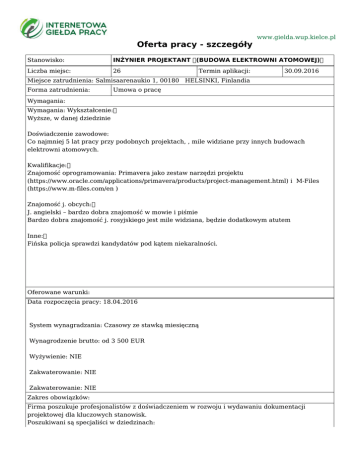 Oferta pracy - szczegóły www.gielda.wup.kielce.pl Stanowisko: INŻYNIER PROJEKTANT (BUDOWA ELEKTROWNI ATOMOWEJ) Liczba miejsc: 26 Termin aplikacji: 30.09.2016 Miejsce zatrudnienia: Salmisaarenaukio 1, 00180 HELSINKI, Finlandia Forma zatrudnienia: Umowa o pracę Wymagania: Wymagania: Wykształcenie: Wyższe, w danej dziedzinie Doświadczenie zawodowe: Co najmniej 5 lat pracy przy podobnych projektach, , mile widziane przy innych budowach elektrowni atomowych. Kwalifikacje: Znajomość oprogramowania: Primavera jako zestaw narzędzi projektu (https://www.oracle.com/applications/primavera/products/project-management.html) i M-Files (https://www.m-files.com/en ) Znajomość j. obcych: J. angielski – bardzo dobra znajomość w mowie i piśmie Bardzo dobra znajomość j. rosyjskiego jest mile widziana, będzie dodatkowym atutem Inne: Fińska policja sprawdzi kandydatów pod kątem niekaralności. Oferowane warunki: Data rozpoczęcia pracy: 18.04.2016 System wynagradzania: Czasowy ze stawką miesięczną Wynagrodzenie brutto: od 3 500 EUR Wyżywienie: NIE Zakwaterowanie: NIE Zakwaterowanie: NIE Zakres obowiązków: Firma poszukuje profesjonalistów z doświadczeniem w rozwoju i wydawaniu dokumentacji projektowej dla kluczowych stanowisk. Poszukiwani są specjaliści w dziedzinach: 1.Wodociągi i kanalizacje 2.HVAC 3.Bezpieczeństwa pożarowego 4. Elektrotechniki 5. Elektrotechniki (systemy niskiego napięcia) 6. Informacji i Automatyki 7. Ochrony fizycznej 8.Inżynierii hydrotechnicznych 9.Inżynierii lądowej 10.Nauka o materiałach 11. Konstrukcji i obróbki mechaniczna, wysp jądrowych i turbinowych 12. Zarządzanie jakością 13. Zarządzanie konfiguracjami 14. Modelowanie informacji 15.Pozwoleń nienuklearnych 16. Wydawania i koordynacji wymagań projektowych (wstępne wymagania techniczne) Firma: RAOS Project Oy Adres: Telefon: Adres email: Adres www: Adres www: Informacje kontaktowe: [email protected] oraz do wiadomości [email protected] W tytule maila proszę wpisać „primary designers” Język aplikacji: angielski Sposób aplikowania: do doradcy EURES z EOG Sposób przekazania dokumentów: drogą elektroniczną - e-mail Wymagane dokumenty: •CV, •list motywacyjny, ww. w j. angielskim •2 referencje wraz z informacją z kim można się kontaktować, •wysokość oczekiwanego wynagrodzenia Uwagi: Identyfikator oferty: 9037562 Instytucja koordynująca ofertę: Wojewódzki Urząd Pracy w Gdańsku Urząd Pracy dokłada wszelkich starań, aby oferty pracy będące w zasobach urzędu, były rzetelne i wiarygodne. Ponieważ wszystkie oferty pracy pochodzą od osób trzecich Urząd Pracy zastrzega, że odpowiedzialność za ewentualne rozbieżności pomiędzy warunkami pracy zaprezentowanymi w niniejszej ofercie a warunkami zaproponowanymi przez potencjalnego pracodawcę ponosi pracodawca.