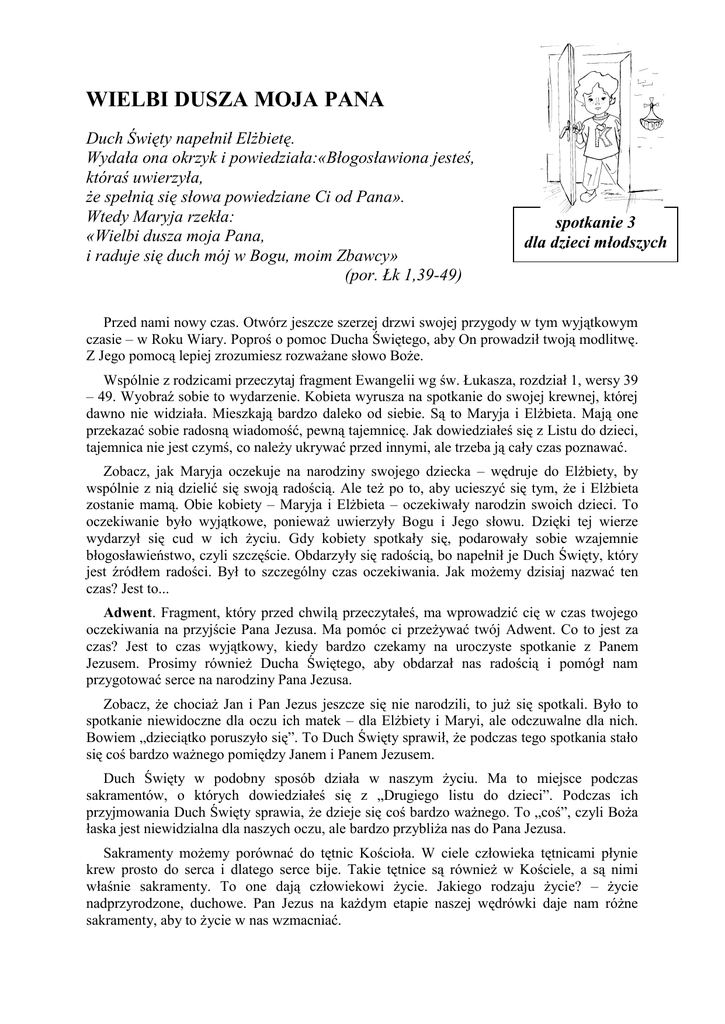 WIELBI DUSZA MOJA PANA Duch Święty napełnił Elżbietę. Wydała ona okrzyk i powiedziała:«Błogosławiona jesteś, któraś uwierzyła, że spełnią się słowa powiedziane Ci od Pana». Wtedy Maryja rzekła: «Wielbi dusza moja Pana, i raduje się duch mój w Bogu, moim Zbawcy» (por. Łk 1,39-49) spotkanie 3 dla dzieci młodszych Przed nami nowy czas. Otwórz jeszcze szerzej drzwi swojej przygody w tym wyjątkowym czasie – w Roku Wiary. Poproś o pomoc Ducha Świętego, aby On prowadził twoją modlitwę. Z Jego pomocą lepiej zrozumiesz rozważane słowo Boże. Wspólnie z rodzicami przeczytaj fragment Ewangelii wg św. Łukasza, rozdział 1, wersy 39 – 49. Wyobraź sobie to wydarzenie. Kobieta wyrusza na spotkanie do swojej krewnej, której dawno nie widziała. Mieszkają bardzo daleko od siebie. Są to Maryja i Elżbieta. Mają one przekazać sobie radosną wiadomość, pewną tajemnicę. Jak dowiedziałeś się z Listu do dzieci, tajemnica nie jest czymś, co należy ukrywać przed innymi, ale trzeba ją cały czas poznawać. Zobacz, jak Maryja oczekuje na narodziny swojego dziecka – wędruje do Elżbiety, by wspólnie z nią dzielić się swoją radością. Ale też po to, aby ucieszyć się tym, że i Elżbieta zostanie mamą. Obie kobiety – Maryja i Elżbieta – oczekiwały narodzin swoich dzieci. To oczekiwanie było wyjątkowe, ponieważ uwierzyły Bogu i Jego słowu. Dzięki tej wierze wydarzył się cud w ich życiu. Gdy kobiety spotkały się, podarowały sobie wzajemnie błogosławieństwo, czyli szczęście. Obdarzyły się radością, bo napełnił je Duch Święty, który jest źródłem radości. Był to szczególny czas oczekiwania. Jak możemy dzisiaj nazwać ten czas? Jest to... Adwent. Fragment, który przed chwilą przeczytałeś, ma wprowadzić cię w czas twojego oczekiwania na przyjście Pana Jezusa. Ma pomóc ci przeżywać twój Adwent. Co to jest za czas? Jest to czas wyjątkowy, kiedy bardzo czekamy na uroczyste spotkanie z Panem Jezusem. Prosimy również Ducha Świętego, aby obdarzał nas radością i pomógł nam przygotować serce na narodziny Pana Jezusa. Zobacz, że chociaż Jan i Pan Jezus jeszcze się nie narodzili, to już się spotkali. Było to spotkanie niewidoczne dla oczu ich matek – dla Elżbiety i Maryi, ale odczuwalne dla nich. Bowiem „dzieciątko poruszyło się”. To Duch Święty sprawił, że podczas tego spotkania stało się coś bardzo ważnego pomiędzy Janem i Panem Jezusem. Duch Święty w podobny sposób działa w naszym życiu. Ma to miejsce podczas sakramentów, o których dowiedziałeś się z „Drugiego listu do dzieci”. Podczas ich przyjmowania Duch Święty sprawia, że dzieje się coś bardzo ważnego. To „coś”, czyli Boża łaska jest niewidzialna dla naszych oczu, ale bardzo przybliża nas do Pana Jezusa. Sakramenty możemy porównać do tętnic Kościoła. W ciele człowieka tętnicami płynie krew prosto do serca i dlatego serce bije. Takie tętnice są również w Kościele, a są nimi właśnie sakramenty. To one dają człowiekowi życie. Jakiego rodzaju życie? – życie nadprzyrodzone, duchowe. Pan Jezus na każdym etapie naszej wędrówki daje nam różne sakramenty, aby to życie w nas wzmacniać. Możemy powiedzieć, że Adwent, to nie tylko czas przed świętami Bożego Narodzenia. Jest to również czas przed przyjęciem sakramentów, czyli czas przygotowania się do nich. Pomyśl, że kiedy będziesz czekał na przyjęcie I Komunii Świętej – to będzie twój Adwent przygotowujący cię do tego sakramentu. Już teraz zapraszam cię do odkrywania piękna Adwentu, czyli czasu oczekiwania na Narodzenie Pana Jezusa. Otwórz jeszcze szerzej drzwi naszej przygody. Co trzeba zrobić? Jak już wiesz, Adwent jest radosnym czasem. Dlatego... Na początku Adwentu: Zrób razem z rodzicami wieniec adwentowy, w którym umieścisz cztery świeczki (każda z nich oznacza kolejną niedzielę adwentu). Połóż go w miejscu przygotowanym przez ciebie na Rok Wiary (patrz spotkanie 1). Podejmij postanowienie codziennej modlitwy adwentowej razem z rodzicami w tym miejscu modlitwy. Razem z rodzicami przygotuj lampion, z którym będziesz chodził na roraty – tak nazywa się msza święta sprawowana w czasie Adwentu ku czci Maryi. W poszczególnych tygodniach Adwentu: W pierwszym tygodniu idź na adorację Najświętszego Sakramentu i pomyśl o swoim postanowieniu. Nie musisz rezygnować z jedzenia słodyczy. Zrób raczej coś, co przybliży cię do Pana Jezusa. Wytnij „drzwi do spotkania 3” i wklej na kartkę do segregatora. Otwórz je i wpisz swoje adwentowe postanowienia. Przeczytaj również „Kartkę trzecią z pamiętnika Tosi i Franka”. Zobacz jak oni przeżywają adwent. W czasie adoracji w drugim tygodniu zastanów się, co to jest sakrament; Wcześniej przeczytaj uważnie „Drugi list do dzieci” i porozmawiaj o nim z rodzicami. Pomyśl o sakramencie, który już przyjąłeś. To Chrzest Święty. Pomyśl również o innych, do których dopiero przystąpisz. Podziękuj Panu Jezusowi za wszystkie sakramenty, szczególnie za te, które już przyjąłeś. Na zewnętrznej stronie drzwi wypisz z pomocą rodziców siedem sakramentów. Podkreśl ten, który już przyjąłeś. Obok wklej zdjęcie pamiątkowe z tego ważnego momentu życia. Na adoracji w trzecim tygodniu pomyśl: czy wiesz, na Kogo czekasz? Czy rozumiesz, po co są Święta Bożego Narodzenia? Dołóż starań, by chodzić w tym tygodniu na roraty. Zabieraj ze sobą lampion, który zrobiłeś. Zobacz, że chociaż na ulicach jest ciemno, to światełko lampionu rozświetla drogę do domu. Takim światłem naszego życia jest Pan Jezus. W segregatorze narysuj tyle serduszek, ile razy byłeś na roratach w tym tygodniu. W czwartą niedzielę adwentu pomyśl, co znaczy słowo „celebrować”. Przeczytaj z pomocą rodziców odpowiedni fragment „Drugiego listu do dzieci”. Pomyśl i powiedz rodzicom, jak ty chcesz prze