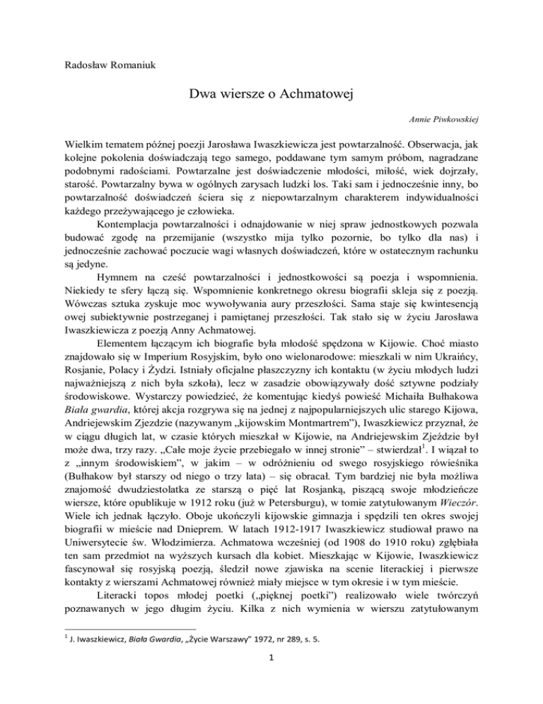 Radosław Romaniuk Dwa wiersze o Achmatowej Annie Piwkowskiej Wielkim tematem późnej poezji Jarosława Iwaszkiewicza jest powtarzalność. Obserwacja, jak kolejne pokolenia doświadczają tego samego, poddawane tym samym próbom, nagradzane podobnymi radościami. Powtarzalne jest doświadczenie młodości, miłość, wiek dojrzały, starość. Powtarzalny bywa w ogólnych zarysach ludzki los. Taki sam i jednocześnie inny, bo powtarzalność doświadczeń ściera się z niepowtarzalnym charakterem indywidualności każdego przeżywającego je człowieka. Kontemplacja powtarzalności i odnajdowanie w niej spraw jednostkowych pozwala budować zgodę na przemijanie (wszystko mija tylko pozornie, bo tylko dla nas) i jednocześnie zachować poczucie wagi własnych doświadczeń, które w ostatecznym rachunku są jedyne. Hymnem na cześć powtarzalności i jednostkowości są poezja i wspomnienia. Niekiedy te sfery łączą się. Wspomnienie konkretnego okresu biografii skleja się z poezją. Wówczas sztuka zyskuje moc wywoływania aury przeszłości. Sama staje się kwintesencją owej subiektywnie postrzeganej i pamiętanej przeszłości. Tak stało się w życiu Jarosława Iwaszkiewicza z poezją Anny Achmatowej. Elementem łączącym ich biografie była młodość spędzona w Kijowie. Choć miasto znajdowało się w Imperium Rosyjskim, było ono wielonarodowe: mieszkali w nim Ukraińcy, Rosjanie, Polacy i Żydzi. Istniały oficjalne płaszczyzny ich kontaktu (w życiu młodych ludzi najważniejszą z nich była szkoła), lecz w zasadzie obowiązywały dość sztywne podziały środowiskowe. Wystarczy powiedzieć, że komentując kiedyś powieść Michaiła Bułhakowa Biała gwardia, której akcja rozgrywa się na jednej z najpopularniejszych ulic starego Kijowa, Andriejewskim Zjezdzie (nazywanym „kijowskim Montmartrem”), Iwaszkiewicz przyznał, że w ciągu długich lat, w czasie których mieszkał w Kijowie, na Andriejewskim Zjeździe był może dwa, trzy razy. „Całe moje życie przebiegało w innej stronie” – stwierdzał1. I wiązał to z „innym środowiskiem”, w jakim – w odróżnieniu od swego rosyjskiego rówieśnika (Bułhakow był starszy od niego o trzy lata) – się obracał. Tym bardziej nie była możliwa znajomość dwudziestolatka ze starszą o pięć lat Rosjanką, piszącą swoje młodzieńcze wiersze, które opublikuje w 1912 roku (już w Petersburgu), w tomie zatytułowanym Wieczór. Wiele ich jednak łączyło. Oboje ukończyli kijowskie gimnazja i spędzili ten okres swojej biografii w mieście nad Dnieprem. W latach 1912-1917 Iwaszkiewicz studiował prawo na Uniwersytecie św. Włodzimierza. Achmatowa wcześniej (od 1908 do 1910 roku) zgłębiała ten sam przedmiot na wyższych kursach dla kobiet. Mieszkając w Kijowie, Iwaszkiewicz fascynował się rosyjską poezją, śledził nowe zjawiska na scenie literackiej i pierwsze kontakty z wierszami Achmatowej również miały miejsce w tym okresie i w tym mieście. Literacki topos młodej poetki („pięknej poetki”) realizowało wiele twórczyń poznawanych w jego długim życiu. Kilka z nich wymienia w wierszu zatytułowanym 1 J. Iwaszkiewicz, Biała Gwardia, „Życie Warszawy” 1972, nr 289, s. 5. 1 Młodość. Rosjanka Bella Achmadulina i polska poetka Wisława Szymborska były „pięknymi poetkami”, kiedy młodość autora dawno już pozostała w sferze wspomnień i literatury. Udowadniały, że wszystko powraca i na świecie pojawiają się znów młode, piękne i utalentowane kobiety, przeżywające w niepowtarzalny sposób swe wspólne wszystkim doświadczenia. Rozgrywające swoją partię z góry przegranej gry. „A dla mnie jedna tylko jest: Achmatowa” – stwierdzał autor Młodości, objaśniając: „Achmatowa to dwadzieścia moich lat”2. Słowa te napisał człowiek osiemdziesięciopięcioletni, trzynaście lat po śmierci rosyjskiej poetki. Na kilka miesięcy przed własną śmiercią, bo wiersz ukazał się w 1980 roku, w pośmiertnie wydanym tomie Muzyka wieczorem. Miały więc one wagę podwójnego wspomnienia. Przywoływały własną przeszłość i „piękną poetkę”, która przeminęła wraz z młodością. Subiektywizm przypominania podkreślają na pół oniryczne obrazy skojarzone z wierszami Achmatowej („Wysoki klon, zielone okna”). Mogą one być reminiscencją kijowskiego pokoju młodego czytelnika wierszy Wieczoru. Jednocześnie – jak poezja przywołująca wspomnienie – podobny widok, zobaczony w starości, ma siłę medium, które przywraca czas. „Wysoki klon” jest bowiem wieczny – jak „piękne poetki”, „młody las”, tytułowa młodość. Jak zieleń, powtarzana w tym wierszu w kontekście młodości i rozkwitu, i w wersji przetworzonej tego koloru: w postaci pluszowego zielonego obicia stolika do gry. Metafora „młodego lasu”, która wiersz zamyka, to kolejny obraz nałożony na tytułowe zjawisko młodości. I gdy zastanowić się nad użytym w jego kontekście słowem „kochać” („Kochacie młody las”), trzeba stwierdzić, że i ono ma przywołać świeżość uczuć i łatwość „kochania” właściwą tej porze ludzkiego życia. Elementy, które stworzyły poezję młodej Achmatowej. Choć autorka Requiem pozostała dla Iwaszkiewicza na zawsze „piękną poetką” i związała się z poetycką aurą młodości – pojawia się w innym jego wierszu w całkowicie odmiennej roli i diametralnie odmiennych zewnętrznych dekoracjach. Jako osoba stara metrykalnie i dojrzała życiowym doświadczeniem. Nie w mieście młodości, lecz w drodze z miejsca, gdzie „wszystko miała za sobą”, do punktu znajdującego się „przed samym końcem”3. Nie „piękna poetka”, lecz kobieta nosząca ciężar losów bliskich: więźniów i samobójców. Wiersz Premio Taormina (bo o nim mowa), napisany w kwietniu 1974 roku, utrwala epizod biografii Achmatowej: wyjazd w 1964 roku na Sycylię po odbiór nagrody literackiej Etna Taormin