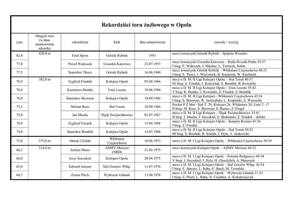 Rekordziści toru żużlowego w Opolu czas Długość toru (w dniu ustanowienia rekordu) 420,0 m rekordzista klub data ustanowienia Emil Spyra Górnik Rybnik 1951 77,8 Paweł Waloszek Gwardia Katowice 22.07.1957 77,5 Stanisław Tkocz Górnik Rybnik 16.06.1960 Zygfryd Friedek Kolejarz Opole 03.04.1966 76,4 Kazimierz Bentke Unia Leszno 19.06.1966 76,0 Stanisław Skowron Kolejarz Opole 18.09.1966 75,2 Marian Rose Stal Toruń 28.09.1966 75,0 Jan Mucha Śląsk Świętochłowice 01.07.1967 74,9 Zygfryd Friedek Kolejarz Opole 15.04.1968 74,8 Stanisław Bombik Kolejarz Opole 14.07.1968 82,8 76,9 73,0 66,3 382,0 m 375,0 m 314,0 m Marek Cieślak Jochen Dinse Włókniarz Częstochowa ADMV Meissen (NRD) 10.06.1973 31.03.1975 66,0 Jerzy Szczakiel Kolejarz Opole 20.04.1975 65,0 Edward Jancarz Stal Gorzów Wlkp. 11.07.1976 64,7 Zenon Plech Wybrzeże Gdańsk 13.08.1978 zawody / wyścig mecz towarzyski Górnik Rybnik – Spójnia Wrocław mecz towarzyski Gwardia Katowice – Ruda Hvezda Praha 35:37 I bieg: P. Waloszek, J. Machac, L. Tomicek, Sobas mecz towarzyski Górnik Rybnik – Włókniarz Częstochowa 48:23 I bieg: S. Tkocz, J. Wieczorek, B. Kacperak, W. Kucharek mecz o D. M. II Ligi Kolejarz Opole – Stal Toruń 40:37 IX bieg: Z. Friedek, J. Kościelak, S. Bombik, B. Kowalski mecz o D. M. II Ligi Kolejarz Opole – Unia Leszno 35:42 V bieg: K. Bentke, J. Kowalski, Z. Friedek, S. Bombik mecz o D. M. II Ligi Kolejarz –Włókniarz Częstochowa 43:34 I bieg: S. Skowron, W. Jastrzębski, L. Krupiński, S. Warzecha Puchar P.Z.Mot. Stal T. 29, Kolejarz 26, Włókniarz 24, Unia T. 17 II bieg: M. Rose, S. Skowron, S. Rurarz, Z. Flegel mecz o D. M. II Ligi Kolejarz – Śląsk Świętochłowice 35:41 II bieg: J. Mucha, J. Szczakiel, E. Brabański, Z. Friedek – defekt mecz o D. M. II Ligi Kolejarz Opole – Karpaty Krosno 41:36 I bieg: Z. Friedek mecz o D. M. II Ligi Kolejarz Opole – Stal Toruń 50:25 III bieg: S. Bombik, B. Szuluk, J. Hyla, A. Jankowski mecz o D. M. I Ligi Kolejarz Opole – Włókniarz Częstochowa 39:39 mecz towarzyski Kolejarz Opole – ADMV Meissen 44:33 mecz o D. M. I Ligi Kolejarz Opole – Polonia Bydgoszcz 44:34 V bieg: J. Szczakiel, J. Hyla, H. Gluecklich, A. Maroszek mecz o D. M. I Ligi Kolejarz Opole – Stal Gorzów Wlkp. 42:54 I bieg: E. Jancarz, L. Raba, F. Stach, M. Towalski mecz o D. M. I Ligi Kolejarz Opole – Wybrzeże Gdańsk 51:55 I bieg: Z. Plech, L. Raba, N. Ciomber, A. Kołodziejczyk 67,5 314,0 (rekordy toru po zmianie nawierzchni) Jacek Goerlitz Kolejarz Opole 10.04.1980 Jacek Goerlitz Kolejarz Opole 10.04.1980 66,2 Jacek Goerlitz Kolejarz Opole 10.04.1980 65,8 Jerzy Kochman Śląsk Świętochłowice 15.05.1980 65,7 Alfred Siekierka Kolejarz Opole 07.06.1980 64,8 Alfred Siekierka Kolejarz Opole 03.05.1981 64,4 Leonard Raba Kolejarz Opole 03.10.1982 63,6 Roland Wieczorek Kolejarz Opole 17.08.1986 63,0 Roland Wieczorek Kolejarz Opole 23.06.1987 62,8 Wojciech Załuski Kolejarz Opole 23.06.1986 Roland Wieczorek Kolejarz Opole 10.04.1988 64,2 Zdzisław Rutecki Polonia Bydgoszcz 28.04.1988 62,8 Jan Krzystyniak Unia Leszno 14.05.1988 62,4 Jan Krzystyniak Unia Leszno 14.05.1988 61,8 Wojciech Załuski Kolejarz Opole 14.05.1989 61,2 Wojciech Załuski Kolejarz Opole 11.06.1989 60,6 Pavel Ondrasik OTŻ Kolejarz Opole 31.03.1997 60,4 Adam Czechowicz KŻ Kolejarz Opole 16.05.2004 67,0 64,8 321,0 m © Henryk Malisz 2010 ćwierćfinał Indywidualnych Mistrzostw Polski I bieg: J. Goerlitz, M. Okoniewski, F. Stach, R. Jany ćwierćfinał Indywidualnych Mistrzostw Polski V bieg: J. Goerlitz, A. Skupień, W. Kaczmarek, A. Marynowski ćwierćfinał Indywidualnych Mistrzostw Polski XIII bieg: J. Goerlitz, H. Jasek, P. Pyszny, J. Puk Drużynowy Puchar Polski: Kolejarz 29, Sparta 27, ROW 21, Śląsk 19 I bieg: J. Kochman, S. Pogorzelski, B. Klimowicz, H. Jasek mecz towarzyski Kolejarz Opole – Tatra Koprivnice 59:19 III bieg: A. Siekierka, M. Witelus, E. Ondrasik, Horhvold mecz o D. M. I Ligi Kolejarz Opole – Falubaz Zielona Góra 50:38 I bieg: A. Siekierka, H. Olszak, A. Krzystyniak, M. Witelus - defekt mecz o D. M. I Ligi Kolejarz Opole – ROW Rybnik 56:34 I bieg: L. Raba, P. Pyszny, H. Bem, W. Załuski - wykluczony mecz o D. M. I Ligi Kolejarz Opole – Wybrzeże Gdańsk 51:39 I bieg: R. Wieczorek, Z. Plech, S. Pogorzelski, P. Żyto mecz o D. M. II Ligi Kolejarz Opole – Włókniarz Częstochowa 56:34 I bieg: R. Wieczorek, J. Kafel, R. Przygódzki, J. Cebula - wykluczony mecz o D. M. II Ligi Kolejarz Opole – Włókniarz Częstochowa 56:34 II bieg: W. Załuski, S. Drabik, D. Bieda, B. Jambor mecz o D. M. I Ligi Kolejarz Opole – ROW Rybnik 34:56 V bieg: R. Wieczorek, A. Skupień, D. Fliegert, W. Gabor mecz o D. M. I Ligi Kolejarz Opole – Polonia Bydgoszcz 45:44 I bieg: Z. Rutecki, J. Cebula, W. Gabor, Krz. Ziarnik mecz o D. M. I Ligi Kolejarz Opole – Unia Leszno 43:47 I bieg: J. Krzystyniak, J. Cebula, B. Jambor, D. Kasprzak mecz o D. M. I Ligi Kolejarz Opole – Unia Leszno 43:47 IV bieg: J. Krzystyniak, R. Wieczorek, D. Kasprzak, W. Gabor mecz o D. M. II Ligi Kolejarz Opole – Śląsk Świętochłowice 56:33 I bieg: W. Załuski, L. Matysiak, K. Bas, W. Gabor - defekt mecz o D. M. II Ligi Kolejarz Opole – Włókniarz Częstochowa 50:39 I bieg: W. Załuski, S. Pogorzelski, S. Drabik, R. Wosz mecz towarzyski OTŻ Kolejarz Opole – PSK Olymp Praha 37:52 XI bieg: P. Ondrasik, A. Rymel, T. Hejtik, S. Dudkiewicz mecz o D. M. II Ligi Kolejarz Opole – T.Ż. Łódź 57:32 III bieg: A. Czechowicz, A. Pawliczek, A. Tomczyk, S. Kasprzak - upadek