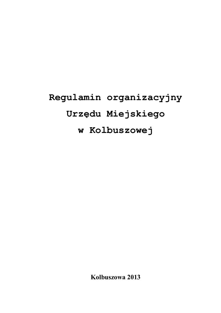 Regulamin organizacyjny Urzędu Miejskiego w Kolbuszowej Kolbuszowa 2013 2 Spis treści A. Zakres działania i zasady funkcjonowania Urzędu Miejskiego w Kolbuszowej. 3 B. Organizacja Urzędu. .............................................................................................. 5 I. Struktura organizacyjna Urzędu............................................................................ 5 II. Zakresy zadań...................................................................................................... 6 1. Burmistrz ......................................................................................................... 6 2. Sekretarz Gminy ……………………………………………………….........7 3. Zastępca Burmistrza…………………………………………………………8 4. Skarbnik Gminy .............................................................................................. 8 5. Referat Organizacji i Spraw Obywatelskich ................................................... 9 6. Referat finansowo – budżetowy. ................................................................... 14 7.Referat Gospodarki Komunalnej i Budownictwa .......................................... 16 8. Referat Inwestycji Gminnych ....................................................................... 17 9. Referat Ochrony Środowiska i Gospodarki Wodnej .................................... 18 10. Referat Pozyskiwania Funduszy i Rozwoju Miasta i Gminy ................... 21 11. Referat Rolnictwa i Gospodarki Gruntami. ............................................... 22 12. Referat Kultury Fizycznej, Rekreacji i Krytej Pływalni …………………23 13. Referat Biuro Rady Miejskiej …………………………………………….24 14. Straż Miejska ……………………………………………………………. 24 15. Urząd Stanu Cywilnego ............................................................................. 25 16. Inspektor d/s. Promocji Gminy .................................................................. 26 17. Inspektor d/s. Informatyki. ......................................................................... 27 18. Inspektor d/s. Oświaty................................................................................ 27 19. Inspektor d/s. Harcerstwa i Młodzieżowej Rady Miejskiej ………………28 20. Audytor Wewnętrzny …………………………………………………….29 21. Radca prawny. ............................................................................................ 29 21.Inspektor d/s. Zamówień Publicznych …………………………………….30 C. Regulamin Kontroli Wewnętrznej Urzędu ......................................................... 31 D. Schemat organizacyjny Urzędu .............................................................................. 33 3 Zakres działania i zasady funkcjonowania Urzędu Miejskiego w Kolbuszowej. A. Urząd Miejski w Kolbuszowej jest jednostką organizacyjną Gminy Kolbuszowa, przy pomocy której Burmistrz wykonuje swoje zadania, funkcjonujący jako jednostka budżetowa. 1. Urząd Miejski w Kolbuszowej, zwany dalej „Urzędem” realizuje zadania własne i zlecone gminie określone ustawami, Statutem Miasta i Gminy Kolbuszowa, uchwałami Rady Miejskiej w Kolbuszowej oraz zadania z zakresu administracji powiatowej przekazane Urzędowi na mocy porozumień. 2. Urzędem kieruje Burmistrz Kolbuszowej, który jest: Zwierzchnikiem służbowym pracowników Urzędu, Zwierzchnikiem służbowym kierowników jednostek organizacyjnych gminy. 3. Przy załatwianiu spraw stosuje się: postanowienia Kodeksu Postępowania Administracyjnego oraz przepisy prawne: z zakresu ustawy o zamówieniach publicznych, odpowiedzialności cywilnej i finansowej dyscypliny finansów publicznych i innych w tym naruszenia przepisów szczególnych obowiązujących urzędników samorządowych. 4. Czynności biurowe i kancelaryjne regulowane są postanowieniami Rozporządzenia Prezesa Rady Ministrów w sprawie instrukcji kancelaryjnej. 5. Siedzibą Urzędu jest miasto Kolbuszowa, ulica Obrońców Pokoju 21. 6. Urząd jest czynny w dniach i godzinach określonych w Regulaminie Pracy Urzędu, zatwierdzonym przez Burmistrza. 7. Pisma i decyzje wychodzące poza siedzibę Urzędu podpisuje Burmistrz lub pozostali członkowie kierownictwa Urzędu, pracownicy do tego upoważnieni, przy czym do wyłącznej kompetencji Burmistrza należy podpisywanie pism skierowanych do Prezydenta RP, Sejmu, Senatu, Ministrów i Kierowników Urzędów Centralnych, Wojewody Podkarpackiego, Marszałka Sejmiku , Starosty oraz Wójtów i Burmistrzów. 8. W skład Urzędu wchodzą referaty i samodzielne stanowiska pracy. 4 9. Pracą referatów kierują kierownicy. 10. Wewnątrz referatów tworzy się komórki organizacyjne. 11. Kierownicy referatów oraz pracownicy zatrudnieni na samodzielnych stanowiskach pracy podlegają bezpośrednio pod Burmistrza. 12. Podziału zadań pomiędzy referaty i samodzielne stanowiska ustala kierownictwo Urzędu. 13. Zadania wspólne referatów oraz pracowników zatrudnionych na samodzielnych stanowiskach pracy: Inicjowanie i podejmowanie przedsięwzięć organizacyjnych w celu zapewnienia właściwej i terminowej realizacji zadań rzeczowych i finansowych określonych przez Burmistrza, Załatwianie spraw wnoszonych przez klientów Urzędu z zakresu działania referatu w tym odpowiedzi na pisma wpływające do referatu, Prowadzenie postępowania administracyjnego i przygotowanie decyzji w indywidualnych sprawach z zakresu administracji publicznej ,należących do właściwości Burmistrza , Przygotowanie projektów odpowiedzi na wystąpienia posłów i senatorów oraz interpelacje zapytania radnych ,wnioski komisji Rady oraz wystąpienia organów osiedli i sołectw , Opracowanie projektów uchwał Rady oraz projektów Zarządzeń Burmistrza, Opracowywanie wniosków do projektów: - studiu
