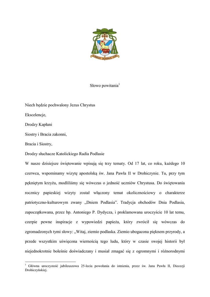 Słowo powitania1 Niech będzie pochwalony Jezus Chrystus Ekscelencje, Drodzy Kapłani Siostry i Bracia zakonni, Bracia i Siostry, Drodzy słuchacze Katolickiego Radia Podlasie W nasze dzisiejsze świętowanie wpisują się trzy tematy. Od 17 lat, co roku, każdego 10 czerwca, wspominamy wizytę apostolską św. Jana Pawła II w Drohiczynie. Tu, przy tym pękniętym krzyżu, modliliśmy się wówczas o jedność uczniów Chrystusa. Do świętowania rocznicy papieskiej wizyty został włączony temat okolicznościowy o charakterze patriotyczno-kulturowym zwany „Dniem Podlasia”. Tradycja obchodów Dnia Podlasia, zapoczątkowana, przez bp. Antoniego P. Dydycza, i proklamowana uroczyście 10 lat temu, czerpie pewne inspiracje z wypowiedzi papieża, który zwrócił się wówczas do zgromadzonych tymi słowy: „Witaj, ziemio podlaska. Ziemio ubogacona pięknem przyrody, a przede wszystkim uświęcona wiernością tego ludu, który w czasie swojej historii był niejednokrotnie boleśnie doświadczany i musiał zmagać się z ogromnymi i różnorodnymi 1 Główna uroczystość jubileuszowa 25-lecia powołania do istnienia, przez św. Jana Pawła II, Diecezji Drohiczyńskiej. przeciwnościami. Zawsze jednak trwał wiernie przy Kościele, i tak jest po dzień dzisiejszy” 2. Słowa te są dla wielu z nas przypomnieniem tamtego spotkania. Mimo upływu czasu i zmian w naszym życiu pozostaje dobre i trwałe doświadczenie tamtych wydarzeń. Trzecim tematem naszego dzisiejszego świętowania jest srebrny jubileusz Diecezji Drohiczyńskiej. 25 lat temu, 5 czerwca 1991 roku, podczas IV wizyty apostolskiej św. Jan Paweł II ogłosił w Białymstoku swą decyzję o ustanowieniu naszej diecezji tymi słowami: (głos papieża Jana Pawła II). „Drodzy Bracia i Siostry! Na zakończenie tej podniosłej liturgii eucharystycznej pragnę jeszcze zwrócić się do Was ze słowem o znaczeniu prawnoadministracyjnym. Mając na względzie racje duszpasterskie ustanawiam dziś (… ) w tym rejonie Polski: Diecezję drohiczyńską – ze stolicą w Drohiczynie – obejmującą teren tej części Diecezji pińskiej, który znajduje się w obecnych granicach Rzeczypospolitej Polskiej. Biskupa Władysława Jędruszuka – dotychczasowego Administratora Apostolskiego – mianuję Biskupem Diecezji drohiczyńskiej. Kościół p/w Przenajświętszej Trójcy w Drohiczynie staje się katedrą Biskupa i Diecezji. Pasterzom i Ludowi Bożemu z serca błogosławię3. Ojcze Święty, św. Janie Pawle II, wyrażamy Ci wdzięczność za dar powołania naszej diecezji. W ostatnią niedzielę, 5 czerwca, przeżywaliśmy dziękczynienie we wszystkich parafiach i wspólnotach zakonnych, wspominając swój chrzest oraz nieskończone miłosierdzie Boga. Symbolicznym i materialnym znakiem naszej wdzięczności za wszystkie dary Boże i dobro ludzkie jest kaplica Jezusa Miłosiernego, wybudowana i poświęcona w Drohiczynie, w miejscu lądowania św. Jana Pawła II. Dzisiaj świętujemy w tym miejscu główne uroczystości jubileuszu naszej diecezji. Jesteśmy wdzięczni Ojcu Świętemu Franciszkowi za nadesłane z okazji jubileuszu powołania naszej diecezji błogosławieństwo i słowa otuchy. 2 3 Przemówienie Jana Pawła II, podczas nabożeństwa Słowa Bożego, Drohiczyn, 10.06.1999 r. Odręczny tekst papieskiej proklamacji: „Metryka narodzin diecezji białostockiej i drohiczyńskiej”. Witam serdecznie i już teraz gorąco dziękuję Jego Ekscelencji ks. abp. Celestino Migliore, nuncjuszowi apostolskiemu w Polsce, za przyjęcie zaproszenia i przewodniczenie uroczystościom oraz za odczytanie przesłania Ojca Świętego. Bardzo Dziękuję ks. bp. Antoniemu P. Dydyczowi, mojemu poprzednikowi i wieloletniemu pasterzowi Diecezji Drohiczyńskiej, za homilię, którą wygłosi w czasie tej Eucharystii. Serdecznie dziękuję Księdzu kardynałowi, Księżom Arcybiskupom i Biskupom za przybycie na jubileusz: Są z nami: Abp Edward Ozorowski – Metropolita Białostocki i nasz metropolita Abp Henryk Hoser – Ordynariusz Diecezji Warszawsko-Praskiej Abp Sebastian Francis Shaw z Lahore w Pakistanie Kazimierz Gurda – Biskup Siedlecki Jerzy Mazur – Biskup Ełcki Janusz Stepnowski – Biskup Łomżyński Henryk Tomasik – Biskup Radomski Bp Artur Miziński – Sekretarz Generalny KEP wraz ze współpracownikami, wśród których jest Rzecznik Episkopatu Polski ks. Paweł Rytel-Andrianik, pochodzący z naszej diecezji Gościem szczególnym jest Antoni Dziemianko – Biskup Piński Witam gorąco i wyrażam wdzięczność za to, że są z nami Biskupi pomocniczy: Bp Tadeusz Bronakowski z Łomży Bp Romuald Kamiński z Ełku Bp Piotr Sawczuk z Siedlec Cieszę się i wyrażam wdzięczność za to, że modlą się z nami biskupi Seniorzy: Bp Antoni Pacyfik Dydycz mój czcigodny poprzednik Bp Józef Wysocki – z Elbląga, pochodzący z naszej diecezji Witam bardzo serdecznie duchowieństwo Kościoła prawosławnego: Ks. Protojereja dr. Doroteusza Sawickiego, Referenta ds. Ekumenicznych Warszawskiej Metropolii Prawosławnej, Delegata J. Em. Wielce Błogosławionego Arcybiskupa Sawy, Prawosławnego Metropolity Warszawskiego i całej Polski; Księdza Mitrata Andrzeja Jakimiuka, dziekana siemiatyckiego i Księdza Mitrata Eugeniusza Zabrockiego, proboszcza parafii w Drohiczynie, pozostałych duchownych i wiernych. Witam gorąco Prześwietne Kapituły, kapłanów, osoby życia konsekrowanego, katechetów i katechetki, - Parlamentarzystów: posłów i senatorów; przedstawicieli władz państwowych i samorządowych wszystkich szczebli: wojewódzkich, powiatowych i gminnych ze starostą siemiatyckim i burmistrzem Drohiczyna, miejscowymi włodarzami; przedstawicieli służb mundurowych: wojska polskiego, policji, straży granicznej, służb celnych, służby więziennej, leśników oraz kombatantów; - Witam druhów strażaków: z państwowych i ochotniczych straży pożarnych; zuchów, harcerki, harcerzy, bractwa i rycerstwo; - Dziękuję za pr