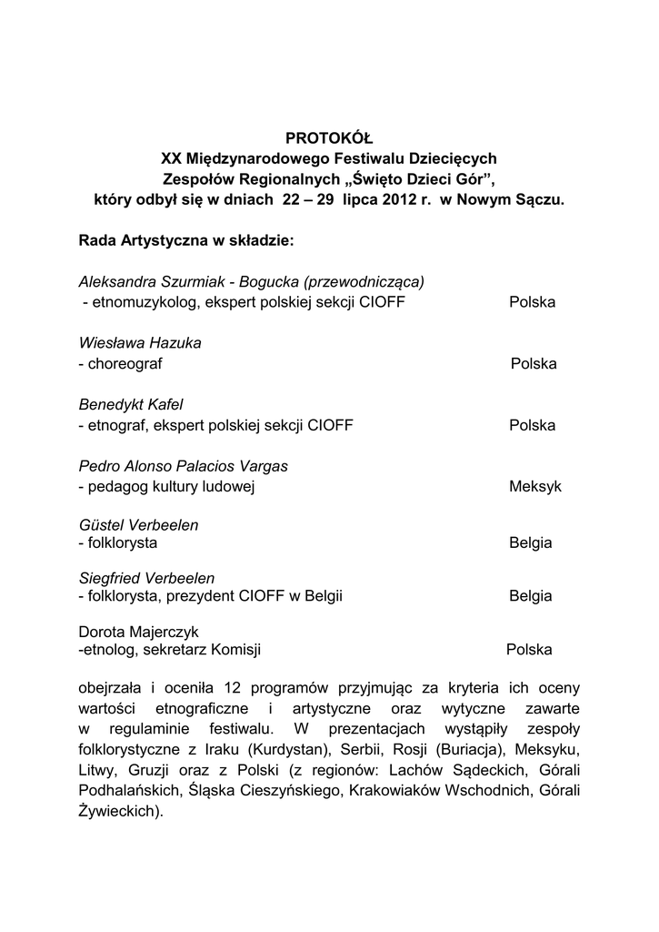 PROTOKÓŁ XX Międzynarodowego Festiwalu Dziecięcych Zespołów Regionalnych „Święto Dzieci Gór”, który odbył się w dniach 22 – 29 lipca 2012 r. w Nowym Sączu. Rada Artystyczna w składzie: Aleksandra Szurmiak - Bogucka (przewodnicząca) - etnomuzykolog, ekspert polskiej sekcji CIOFF Polska Wiesława Hazuka - choreograf Polska Benedykt Kafel - etnograf, ekspert polskiej sekcji CIOFF Polska Pedro Alonso Palacios Vargas - pedagog kultury ludowej Meksyk Güstel Verbeelen - folklorysta Belgia Siegfried Verbeelen - folklorysta, prezydent CIOFF w Belgii Belgia Dorota Majerczyk -etnolog, sekretarz Komisji Polska obejrzała i oceniła 12 programów przyjmując za kryteria ich oceny wartości etnograficzne i artystyczne oraz wytyczne zawarte w regulaminie festiwalu. W prezentacjach wystąpiły zespoły folklorystyczne z Iraku (Kurdystan), Serbii, Rosji (Buriacja), Meksyku, Litwy, Gruzji oraz z Polski (z regionów: Lachów Sądeckich, Górali Podhalańskich, Śląska Cieszyńskiego, Krakowiaków Wschodnich, Górali Żywieckich). 2 Rada Artystyczna, biorąc pod uwagę przedstawione na Festiwalu widowiska i ich odniesienie do tradycyjnych kultur poszczególnych ludów i regionów oraz wyraz artystyczny – postanowiła podkreślić najbardziej charakterystyczne cechy programów (zespoły wymienione w kolejności występowania): 1. Małe Rożnowioki z Rożnowa - Polska, za atmosferę autentycznych, dziecięcych zabaw, bogactwo muzyki i tańca oraz zróżnicowane stroje. 2. Nawroz Group for Dancing & Music- Irak/ Kurdystan, za próbę pokazania folkloru Kurdów irackich, a szczególnie za ekspresję tańca. 3. Zornica z Zakopanego - Polska, za ciekawy pomysł i przebieg widowiska oraz pokaz charakterystycznej gry na instrumentach pasterskich. 4.Cotik Tent - Serbia, za bardzo dobrą technikę taneczną oraz pokaz pięknych strojów z różnych regionów Serbii. 5.Mali Dębowczanie - Polska, za przypomnienie dawnych i ginących zabaw w spontanicznej dziecięcej atmosferze oraz pokaz tradycyjnych tańców regionu. 6.Bulzhamuur – Rosja/Buriacja, za pokaz gry na oryginalnych instrumentach i znakomite przygotowanie ruchowe grupy tanecznej. 7. Majeranki z Rabki Zdroju – Polska, za oryginalny pomysł odtworzenia ginącego zawodu, bardzo dobrą reżyserię, taniec, śpiew i muzykę oraz atmosferę dziecięcych zabaw. 8. Tiatizcalli – Meksyk, za wspaniały pokaz kultury meksykańskiej, piękne i zróżnicowane stroje oraz zestaw tradycyjnych instrumentów. 2 3 9. Mały Gwoździec z Gwoźdźca – Polska, za ukazanie rzadkiego obyczaju wielkanocnego, stworzenie atmosfery świątecznej gościny, dobrą muzykę i dobór właściwych tańców. 10. Grandinele – Litwa, za program prezentujący wysoką technikę taneczną, estetykę strojów i piękny śpiew solowy. 11. Spod Kikuli – Polska, za żywiołowość i właściwą atmosferę zabaw dziecięcych oraz prezentacje bogactwa muzycznego Żywiecczyzny i zróżnicowane stroje. 12. Goristsikhe – Gruzja, za wspaniały pokaz tradycyjnej kultury tanecznej Gruzji na bardzo dobrym poziomie technicznym oraz interesującą i charakterystyczną grę instrumentalną. Rada Artystyczna uważa, że nie wszystkie prezentowane programy odpowiedziały w pełni na wymaganą formułę Festiwalu, która preferuje ukazanie dziecka i jego naturalne spontaniczne zachowanie. Widowiska przygotowane przez zagraniczne zespoły odzwierciedlały folklor taneczny charakterystyczny dla swoich krajów. Wyjątek stanowiła grupa Tiatizcalli z Meksyku, która zaprezentowała udział dziecka w dorocznym święcie Bożego Ciała. Warto podkreślić, że prezentacje od strony wykonawczej były na bardzo wysokim poziomie technicznym. Rada Artystyczna wyraża nadzieję, że w kolejnych edycjach festiwalu pojawią się programy odpowiadające założeniom regulaminowym Festiwalu.W przypadku zespołów z Polski, zachowane zostały prawidłowe kierunki pracy z dziećmi, jednak w niektórych zespołach zabrakło odpowiedniego poziomu wykonawczego pod względem techniki szczególnie tańca i śpiewu. Komisja stwierdza, że część zespołów biorących udział w Festiwalu ŚWIĘTO DZIECI GÓR nie spełniło warunku regulaminu Festiwalu, dotyczącego wymaganego wieku uczestników (7 do 14 lat). Mamy nadzieję, że w kolejnych latach spełniony zostanie wymóg regulaminowy dotyczący towarzyszenia zespołom„żywej muzyki”. 3 4 Kolejne ŚWIĘTO DZIECI GÓR potwierdziło początkowe założenia Festiwalu, polegające na zawieraniu przyjaźni poprzez kamractwo dzieci z różnych stron świata podczas wspólnego, tygodniowego pobytu. Ważnym wydarzeniem, towarzyszącym tegorocznemu Festiwalowi była Międzynarodowa Konferencja „Etnopedagogika a współczesna edukacja dzieci” zorganizowana pod patronatem CIOFF oraz Ogólnopolskie Warsztaty dla Instruktorów Zespołów Regionalnych. Dziękujemy Kierownictwu zespołów i twórcom programów za ich ogromny wkład pracy w przygotowanie prezentacji. Szczególne podziękowania należą się Ministerstwu Kultury i Dziedzictwa Narodowego, Samorządowi Województwa Małopolskiego, Urzędowi Miasta w Nowym Sączu i Samorządom miast festiwalowych za wsparcie finansowe i pomoc organizacyjną. Dyrekcji Małopolskiego Centrum Kultury SOKÓŁ w Nowym Sączu: Antoniemu Malczakowi i Małgorzacie Kalarus oraz wszystkim pracownikom instytucji, serdecznie dziękujemy, za wysiłek włożony w przygotowanie Festiwalu, jego sprawną organizację, która przebiegała w miłej atmosferze. Dziękujemy wiceprezydentowi Światowej Organizacji CIOFF, przewodniczącemu Sekcji Polskiej, dr. Jerzemu Chmielowi za objęcie patronatem ŚWIĘTA DZIECI GÓR . Tradycyjne dziękujemy Panu Józefowi Brodzie za swoisty i ciekawy sposób prezentowania zespołów oraz za sprawne prowadzenie wspólnej zabawy „kamrackich” grup łącznie z dziećmi z widowni. Wyrazy podziękowania kierujemy na ręce wszystkich sponsorów za ich różnorodną formę wsparcia Festiwalu ora