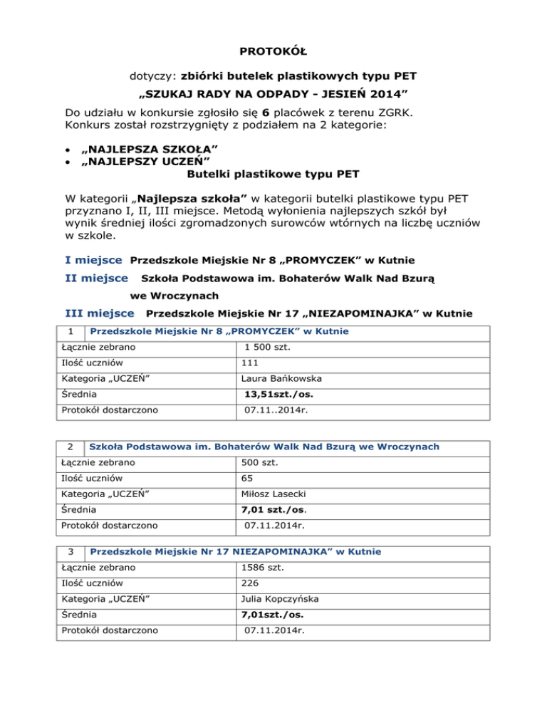 PROTOKÓŁ dotyczy: zbiórki butelek plastikowych typu PET „SZUKAJ RADY NA ODPADY - JESIEŃ 2014” Do udziału w konkursie zgłosiło się 6 placówek z terenu ZGRK. Konkurs został rozstrzygnięty z podziałem na 2 kategorie: „NAJLEPSZA SZKOŁA” „NAJLEPSZY UCZEŃ” Butelki plastikowe typu PET W kategorii „Najlepsza szkoła” w kategorii butelki plastikowe typu PET przyznano I, II, III miejsce. Metodą wyłonienia najlepszych szkół był wynik średniej ilości zgromadzonych surowców wtórnych na liczbę uczniów w szkole. I miejsce Przedszkole Miejskie Nr 8 „PROMYCZEK” w Kutnie II miejsce Szkoła Podstawowa im. Bohaterów Walk Nad Bzurą we Wroczynach III miejsce 1 Przedszkole Miejskie Nr 17 „NIEZAPOMINAJKA” w Kutnie Przedszkole Miejskie Nr 8 „PROMYCZEK” w Kutnie Łącznie zebrano 1 500 szt. Ilość uczniów 111 Kategoria „UCZEŃ” Laura Bańkowska Średnia 13,51szt./os. Protokół dostarczono 07.11..2014r. 2 Szkoła Podstawowa im. Bohaterów Walk Nad Bzurą we Wroczynach Łącznie zebrano 500 szt. Ilość uczniów 65 Kategoria „UCZEŃ” Miłosz Lasecki Średnia 7,01 szt./os. Protokół dostarczono 3 07.11.2014r. Przedszkole Miejskie Nr 17 NIEZAPOMINAJKA” w Kutnie Łącznie zebrano 1586 szt. Ilość uczniów 226 Kategoria „UCZEŃ” Julia Kopczyńska Średnia 7,01szt./os. Protokół dostarczono 07.11.2014r. 4 Specjalny Ośrodek Szkolno Wychowawczy Nr1 im. Marii Konopnickiej w Kutnie Łącznie zebrano 1 000 szt. Ilość uczniów 187 Kategoria „UCZEŃ” Średnia Protokół dostarczono 5 Mariusz Trzciński – Szkoła Specjalna Przysposabiająca do Pracy 5,34szt/os 28.10.2014r. Szkoła Podstawowa Nr 6 im. Marii Skłodowskiej – Curie w Kutnie Łącznie zebrano 1 120 szt. Ilość uczniów 388 Kategoria „UCZEŃ” Wiktoria Radwańska Średnia 2,88szt./os Protokół dostarczono 28.10.2014r. 6 Szkoła Podstawowa im. Kornela Makuszyńskiego w Łaniętach Łącznie zebrano 39 szt. Ilość uczniów 140 Kategoria „UCZEŃ” Lidia Koprowicz Średnia 0,27 szt. /os Protokół dostarczono 07.11.2014r. Dnia 17 grudnia 2014 r. w Kutnowskim Domu Kultury odbyło się uroczyste wręczenie nagród laureatom konkursu. Ogółem uczniowie zebrali ponad 229,8 kg Zbiórka objęła 1117 uczniów. Średnia ilość zebranych butelek – około 0,20 kg/ucznia. Biorąc pod uwagę, iż na 1 kg wchodzą 25 szt. butelek zebrano łącznie 5 745 szt. butelek co daje około 5,14./ucznia.