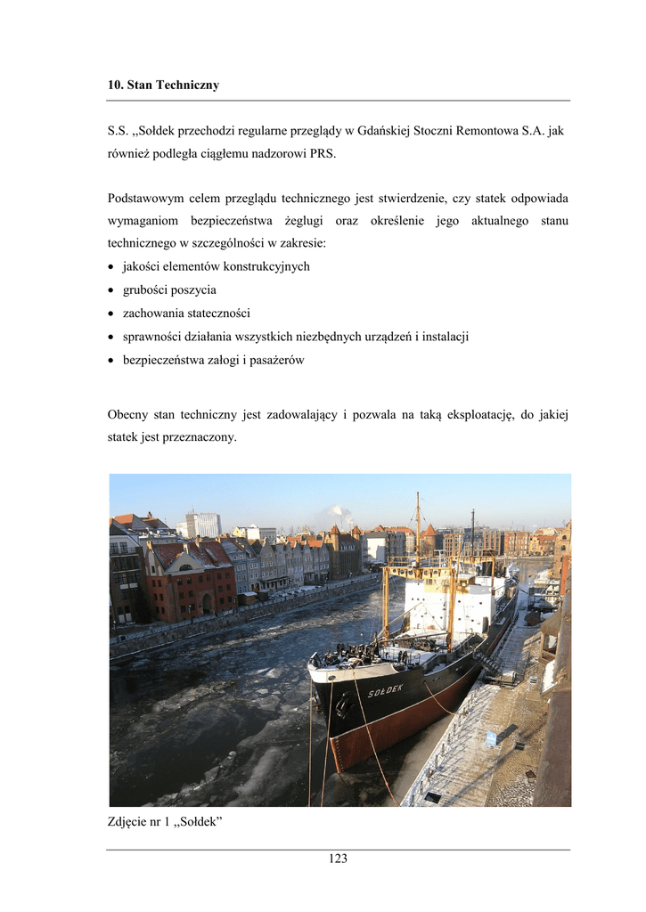 10. Stan Techniczny S.S. ,,Sołdek przechodzi regularne przeglądy w Gdańskiej Stoczni Remontowa S.A. jak również podległa ciągłemu nadzorowi PRS. Podstawowym celem przeglądu technicznego jest stwierdzenie, czy statek odpowiada wymaganiom bezpieczeństwa żeglugi oraz określenie jego aktualnego stanu technicznego w szczególności w zakresie: jakości elementów konstrukcyjnych grubości poszycia zachowania stateczności sprawności działania wszystkich niezbędnych urządzeń i instalacji bezpieczeństwa załogi i pasażerów Obecny stan techniczny jest zadowalający i pozwala na taką eksploatację, do jakiej statek jest przeznaczony. Zdjęcie nr 1 ,,Sołdek” 123 10.1 Typowy Zakres Remontu Statku Specyfika remontu statku muzealnego wynika z wieku statku oraz jego funkcji. Statek – muzeum nie wymaga funkcjonowania wielu systemów okrętowych. W związku z tym remont statku muzealnego możno podzielić na dwa obszary: remont wynikający z wymagań Towarzystwa Klasyfikacyjnego dla utrzymania orzeczenia technicznego o zdatności do pływania, remont polegający na konserwacji i dbałości o te elementy wyposażenia statku, które stanowią o jego muzealnej wartości. Podstawowy zakres remontu wynikający z wymagań Towarzystwa Klasyfikacyjnego: Nadzór Towarzystwa Klasyfikacyjnego obejmuje: kontrole stanu kadłuba, pomiary grubości blach i elementów konstrukcji stalowej spawanie ubytków łbów nitów (odtworzenie) naprawę uszkodzonych miejsc na poszyciu kadłuba poprzez spawanie nakładek bieżącą wymiana anod cynkowych systemu katodowej ochrony przeciwkorozyjnej konserwacje kadłuba poprzez szlakowanie i malowanie natryskowe uzupełnianie wżerów i ubytków na poszyciu poprzez napawanie albo użycie materiału, Thortex Metal Tech EG (Super Metal), który nakłada się na uszkodzone miejsca i który uzupełnia rodzimy materiał danej części, wypełnia braki, zastąpi materiał wytarty czy zużyty, może służyć również, jako warstwa ochronna Wszelkie naprawy wykonuje się poprzez spawanie. Dotyczy to zarówno naprawy uszkodzonych łbów nitów, jak i doraźnych interwencji w celu doszczelnienia kadłuba poprzez spawanie nakładek. Tego typu interwencje zniekształcają oryginalny wygląd kadłuba i jego wartość, jako statku muzealnego – nitowanego. Innym wyjściem, aby zachować historyczny charakter kadłuba, jest usytuowanie statku w specjalnie do tego przystosowanym suchym doku. Wówczas statek nie będzie podlegał oddziaływaniu atmosferycznemu i procesy korozyjne zostaną spowolnione. Starannie wykonana konserwacja kadłuba ma istotne znaczenie dla jego kondycji i 124 decyduje o tym, iż statek ten ciągle pozostaje w bardzo dobrym stanie. Proces konserwacji prowadzony jest w Gdańskiej Stoczni ,,Remontowa" S.A. z dużą starannością i fachowością. Zdjęcie nr 2 ,,Sołdek” Remonty elementów wyposażenia statku decydujących o jego muzealnej wartości: Statek – muzeum Sołdek jest bezustannie remontowany przez swoją załogę. Ze względu na wiek oraz fakt, iż przebywa na wodzie, gdzie wystawiony jest na zmienne oddziaływania atmosferyczne, wymaga ciągłej troski. Niezależnie od remontów bieżących, wykorzystuje się pobyt w stoczni do bardziej intensywnych remontów wyposażenia. Wykonywane są wówczas następujące prace: konserwacja i wymiana pokładów drewnianych utrzymanie w ruchu urządzeń cumowniczych: kluzy, wciągarki przeglądy i remonty wind ładunkowych przeglądy remonty bomów ładunkowych wraz z gniazdami 125 remonty pokryw lukowych i ich armatury, zbloczy i olinowania urządzeń przeładunkowych, kotwic i łańcuchów, relingów. komina, świetlików. nawiewników i wywiewników, szalup i łodzi ratunkowych, wyposażenia sterówki, siłowni i pomieszczeń załogowych itd. Niektóre z wymienionych urządzeń są ciągle sprawne. Najważniejszym celem tych remontów jest zachowanie i odtwarzanie oryginalnego wyglądu poszczególnych elementów wyposażenia. Jest to ważne ze względu na utrzymanie ich muzealnego i historycznego charakteru. Zdjęcie nr 3 ,,Sołdek” 126 10.2 Stan Techniczny Statku 2003/2008 Stan techniczny kadłuba ocenić można na podstawie pomiarów grubości blach wykonanych w 2003 roku i częściowo w 2007 r. (tam, gdzie był możliwy dostęp). Według nich ubytki grubości wynosiły od 20% do 60%. Kadłub statku znajduje się ciągle w dobrym stanie. Jest to rezultat właściwie prowadzonych prac konserwacyjno – malarskich statku oraz dbałości i system katodowej ochrony przeciwkorozyjnej. Weryfikacja tych pomiarów będzie możliwa dopiero, gdy statek znajdzie się na doku. Otrzymane wówczas wyniki zostaną przedstawione Polskiemu Rejestrowi Statków, który wspólnie z armatorem zdecyduje o sposobie naprawy. Z armatorskiego punktu widzenia najlepsza byłaby wymiana blach, ale będzie to uzależnione od funduszy. Jest to operacja kosztowna i trudna, gdyż należy liczyć się z rozszczelnieniami nitów i sąsiednich blach, co może doprowadzić do reakcji łańcuchowej. Należy dodać, że ,,Sołdek”, jako niepływający statek - muzeum został decyzją PRS przeniesiony do grupy statków śródlądowych, dla których minimalna dopuszczalna grubość blach wynosi 6,3 mm. Stwierdzono ubytki grubości min. w grodziach, średnikach, mocnikach, węzłówkach. Powierzchnie zewnętrzne nadwodnej części kadłuba i nadbudówki po 1983 roku były czyszczone i malowane jedynie w miejscach stwierdzanej korozji, co spowodowało, że obecna powłoka malarska jest bardzo gruba, pęka i miejscowo odstaje, pod nią natomiast jest korozja. To wymaga całkowitego oczyszczenia przez szlakowanie i nałożenie nowych powłok malarskich po uprzednim naprawieniu. Powierzchnie wewnętrzne ładowni nr 3 i 4 mają wiele warstw farby, pod którą stwierdzono korozję. W ładowniach nr 1 i 2 powłoki malarskie odpadają płatami i rozpoczyna się intensywna korozja. Pokrywy luków ładowni uległy korozji, szczególnie w