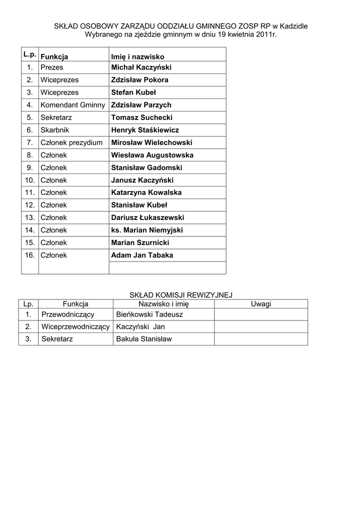 SKŁAD OSOBOWY ZARZĄDU ODDZIAŁU GMINNEGO ZOSP RP w Kadzidle Wybranego na zjeździe gminnym w dniu 19 kwietnia 2011r. L.p. Funkcja 1. Prezes Imię i nazwisko Michał Kaczyński 2. Wiceprezes Zdzisław Pokora 3. Wiceprezes Stefan Kubeł 4. Komendant Gminny Zdzisław Parzych 5. Sekretarz Tomasz Suchecki 6. Skarbnik Henryk Staśkiewicz 7. Członek prezydium Mirosław Wielechowski 8. Członek Wiesława Augustowska 9. Członek Stanisław Gadomski 10. Członek Janusz Kaczyński 11. Członek Katarzyna Kowalska 12. Członek Stanisław Kubeł 13. Członek Dariusz Łukaszewski 14. Członek ks. Marian Niemyjski 15. Członek Marian Szurnicki 16. Członek Adam Jan Tabaka SKŁAD KOMISJI REWIZYJNEJ Nazwisko i imię Bieńkowski Tadeusz Lp. 1. Funkcja Przewodniczący 2. Wiceprzewodniczący Kaczyński Jan 3. Sekretarz Bakuła Stanisław Uwagi LP 1. SKŁAD OSOBOWY ZARZĄDU OSP W KADZIDLE wybranego przez walne zebranie w dniu 2011.02.26 Uwagi Funkcja Nazwisko i imię Prezes Kowalska Katarzyna 2. Wiceprezes-naczelnik Kowalski Łukasz 3. Wiceprezes Gleba Mariusz 4. Z-ca Naczelnika Świderek Tomasz 5. Sekretarz Gleba Arkadiusz 6. Skarbnik Kowalski Piotr 7. Kronikarz Krajza Marcin 8. Gospodarz Kaczyński Janusz 9. Członek Zarządu Świderek Adam SKŁAD KOMISJI REWIZYJNEJ Nazwisko i imię Bieńkowski Tadeusz Uwagi Lp. 1. Funkcja Przewodniczący 2. Wiceprzewodniczący Szyszka Adam 3. Sekretarz LP 1. 2. SKŁAD OSOBOWY ZARZĄDU OSP W KUCZYŃSKICH wybranego przez walne zebranie w dniu 2011.02.15 Funkcja Nazwisko i imię Uwagi Tomasz Suchecki Prezes Tomasz Jechanowski Wiceprezes-naczelnik 3. Wiceprezes Eugeniusz Zera 4. Sekretarz Michał Stepnowski 5. Skarbnik Jerzy Olender 6. Gospodarz Kazimierz Duszak Lp. 1. Funkcja Przewodniczący 2. Wiceprzewodniczący Jarosław Ciuchta Sylwester Deptuła Sekretarz 3. Charucki Grzegorz SKŁAD KOMISJI REWIZYJNEJ Nazwisko i imię Krzysztof Dawid Uwagi LP 1. SKŁAD OSOBOWY ZARZĄDU OSP W WACHU wybranego przez walne zebranie w dniu 2011.03.04 Uwagi Funkcja Nazwisko i imię Prezes Wielechowski Mirosław 2. Wiceprezes-naczelnik Waśkiewicz Zbigniew 3. Wiceprezes Gąska Józef 4. Sekretarz Marzewski Czesław 5. Skarbnik Puławski Henryk 6. Gospodarz Wielechowski Przemysław SKŁAD KOMISJI REWIZYJNEJ Nazwisko i imię Marzewski Czesław Lp. 1. Funkcja Przewodniczący 2. Wiceprzewodniczący Koczkodan Dariusz 3. Sekretarz Uwagi Waśkiewicz Zbigniew SKŁAD OSOBOWY ZARZĄDU OSP W GLEBIE wybranego przez walne zebranie w dniu 2011.02.11 LP 1. Funkcja Prezes Nazwisko i imię Pokora Zdzisław 2. Wiceprezes-naczelnik Olk Jarosław 3. Wiceprezes Tabaka Adam Jan 4. Sekretarz Murach Piotr 5. Skarbnik Tabaka Dorota 6. Kronikarz Pojawa Diana 7. Gospodarz Deptuła Karol Lp. 1. Funkcja Przewodniczący 2. Wiceprzewodniczący Gut Henryk 3. Sekretarz SKŁAD KOMISJI REWIZYJNEJ Nazwisko i imię Giers Zdzisław Tyc Leszek Uwagi Uwagi SKŁAD OSOBOWY ZARZĄDU OSP W DYLEWIE wybranego przez walne zebranie w dniu 2011.02.25 LP 1. Funkcja Prezes Nazwisko i imię Kubeł Stefan 2. Wiceprezes-naczelnik Szurnicki Marian 3. Wiceprezes Szurnicki Jan 4. Z-ca Naczelnika Sadłowski Andrzej 5. Sekretarz Kur Stanisław 6. Skarbnik Wyrębek Andrzej 7. Gospodarz Prusaczyk Wiesław Lp. 1. Funkcja Przewodniczący 2. Wiceprzewodniczący Kaczyński Jan 3. Sekretarz SKŁAD KOMISJI REWIZYJNEJ Nazwisko i imię Majk Kazimierz Uwagi Uwagi Jechanowski Tadeusz SKŁAD OSOBOWY ZARZĄDU OSP W KROBI wybranego przez walne zebranie w dniu 2011.02.07 LP 1. Funkcja Prezes Nazwisko i imię Augustowska Wiesława 2. Wiceprezes-naczelnik Mróz Andrzej 3. Wiceprezes Ropiak Dariusz 4. Sekretarz Gwara Renata 5. Skarbnik Kurpiewska Barbara 6. Gospodarz Pabich Mieczysław SKŁAD KOMISJI REWIZYJNEJ Nazwisko i imię Augustowski Marian Lp. 1. Funkcja Przewodniczący 2. Wiceprzewodniczący Augustowska ElŜbieta 3. Sekretarz Giers Dorota Uwagi Uwagi SKŁAD OSOBOWY ZARZĄDU OSP W JEGLIJOWCU wybranego przez walne zebranie w dniu 2006.03.09 LP 1. Funkcja Prezes Nazwisko i imię Kord Wiesław 2. Wiceprezes-naczelnik Kord Mirosław 3. Wiceprezes Dawid Bogdan 4. Sekretarz Koziatek Kazimierz 5. Skarbnik Suchecki Michał 6. Gospodarz Madrak Grzegorz Lp. 1. Funkcja Przewodniczący SKŁAD KOMISJI REWIZYJNEJ Nazwisko i imię Dawid Sylwester 2. Wiceprzewodniczący Suchecki Waldemar 3. Sekretarz Dawid Stanisław Uwagi Uwagi SKŁAD OSOBOWY ZARZĄDU OSP W STRZAŁKACH wybranego przez walne zebranie w dniu 2011.02.10 LP 1. Funkcja Prezes Nazwisko i imię Staśkiewicz Henryk 2. Wiceprezes-naczelnik Suchecki Sławomir 3. Wiceprezes Bakuła Stanisław 4. Sekretarz Mróz Mirosław 5. Skarbnik Aptacy Stanisław 6. Gospodarz Suchecki Grzegorz Lp. 1. Funkcja Przewodniczący 2. Wiceprzewodniczący Głowacki Stanisław 3. Sekretarz SKŁAD KOMISJI REWIZYJNEJ Nazwisko i imię Niedźwiedzki Stanisław Suchecki Tadeusz Uwagi Uwagi SKŁAD OSOBOWY ZARZĄDU OSP W PIASECZNI wybranego przez walne zebranie w dniu 2010.05.06 LP 1. Funkcja Prezes Nazwisko i imię Przybyłowski Marcin 2. Wiceprezes-naczelnik Giers Grzegorz 3. Wiceprezes Krystian Szymon 4. Sekretarz Krystian Dominik 5. Skarbnik Dawid Daniel 6. Gospodarz Koczkodan Radosław SKŁAD KOMISJI REWIZYJNEJ Nazwisko i imię Romanowski Stanisław Lp. 1. Funkcja Przewodniczący 2. Wiceprzewodniczący Gąska Danuta 3. Sekretarz Trzciński Józef Uwagi Uwagi Stan na dzień 2010.12.31 LP OSP NIP REGON KRS Rok powołania ID MęŜczyzn Honoro czynnych wych 18-60 Ponad 60 1 Kadzidło 758-19-58-204 550750420 0000183336 1912 7259 45 2 Dylewo 758-19-58-196 550750413 0000181626 1926 7256 24 3 Gleba 758-22-29-660 551313755 0000194244 1965 7257 25 4 Wach 758-22-06-535 551311584 0000185760 1985 7261 20 3 5 Jeglijowiec 551313749 0000190845 18 2 6 Strzałki 551313778 0000186468 7 Krobia 140776369 0000208989 8 Kuczyńskie 1965 7258 1129 1952 9 1130 2004 0 1958 7260 758-195-81-67 550750442 0000181741 OSP bez MDP Ogółem 7 4 9 184 15 76 8 37 2 36 5 28 20 1 18 9 1 19 15 w tym MDP Ogółem Kobiet 1 20 8 24 2 20 10 19 20 194 19 20 233 28 264