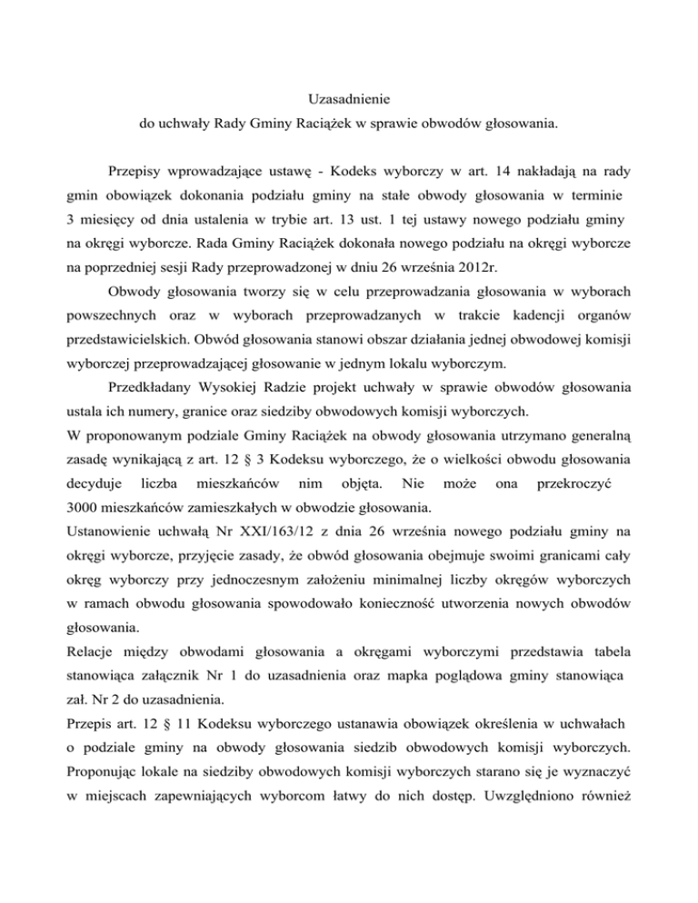 Uzasadnienie do uchwały Rady Gminy Raciążek w sprawie obwodów głosowania. Przepisy wprowadzające ustawę - Kodeks wyborczy w art. 14 nakładają na rady gmin obowiązek dokonania podziału gminy na stałe obwody głosowania w terminie 3 miesięcy od dnia ustalenia w trybie art. 13 ust. 1 tej ustawy nowego podziału gminy na okręgi wyborcze. Rada Gminy Raciążek dokonała nowego podziału na okręgi wyborcze na poprzedniej sesji Rady przeprowadzonej w dniu 26 września 2012r. Obwody głosowania tworzy się w celu przeprowadzania głosowania w wyborach powszechnych oraz w wyborach przeprowadzanych w trakcie kadencji organów przedstawicielskich. Obwód głosowania stanowi obszar działania jednej obwodowej komisji wyborczej przeprowadzającej głosowanie w jednym lokalu wyborczym. Przedkładany Wysokiej Radzie projekt uchwały w sprawie obwodów głosowania ustala ich numery, granice oraz siedziby obwodowych komisji wyborczych. W proponowanym podziale Gminy Raciążek na obwody głosowania utrzymano generalną zasadę wynikającą z art. 12 § 3 Kodeksu wyborczego, że o wielkości obwodu głosowania decyduje liczba mieszkańców nim objęta. Nie może ona przekroczyć 3000 mieszkańców zamieszkałych w obwodzie głosowania. Ustanowienie uchwałą Nr XXI/163/12 z dnia 26 września nowego podziału gminy na okręgi wyborcze, przyjęcie zasady, że obwód głosowania obejmuje swoimi granicami cały okręg wyborczy przy jednoczesnym założeniu minimalnej liczby okręgów wyborczych w ramach obwodu głosowania spowodowało konieczność utworzenia nowych obwodów głosowania. Relacje między obwodami głosowania a okręgami wyborczymi przedstawia tabela stanowiąca załącznik Nr 1 do uzasadnienia oraz mapka poglądowa gminy stanowiąca zał. Nr 2 do uzasadnienia. Przepis art. 12 § 11 Kodeksu wyborczego ustanawia obowiązek określenia w uchwałach o podziale gminy na obwody głosowania siedzib obwodowych komisji wyborczych. Proponując lokale na siedziby obwodowych komisji wyborczych starano się je wyznaczyć w miejscach zapewniających wyborcom łatwy do nich dostęp. Uwzględniono również 2 dyspozycję art. 186 § 1 Kodeksu wyborczego w związku z art. 15a Przepisów wprowadzających ustawę – Kodeks wyborczy zobowiązuje w przyszłości wyznaczenie odpowiedniej liczby siedzib obwodowych komisji wyborczych w budynkach dostosowanych do potrzeb wyborców niepełnosprawnych. Lokale te powinny spełniać kryteria określone w rozporządzeniu Ministra Infrastruktury z dnia 29 lipca 2011 r. w sprawie lokali obwodowych komisji wyborczych dostosowanych do potrzeb wyborców niepełnosprawnych. Przedkładany projekt podziału gminy na obwody głosowania konsultowany był z komisjami rady, podano go do publicznej wiadomości zamieszczając jego treść z uzasadnieniem na stronie internetowej Biuletynu Informacji Publicznej oraz wywieszono informację na tablicy ogłoszeń Urzędu o możliwości zapoznania się z projektem w siedzibie Urzędu. Proponowany podział Gminy Raciążek na obwody głosowania będzie miał zastosowanie do wyborów do Sejmu RP i Senatu RP, Prezydenta RP, do Parlamentu Europejskiego oraz referendów od chwili jego uchwalenia. Dla wyborów organów samorządowych, zgodnie z art. 16 Przepisy wprowadzające ustawę – Kodeks wyborczy przyjęty podział na obwody głosowania będzie miał zastosowanie od kadencji 2014 – 2018.