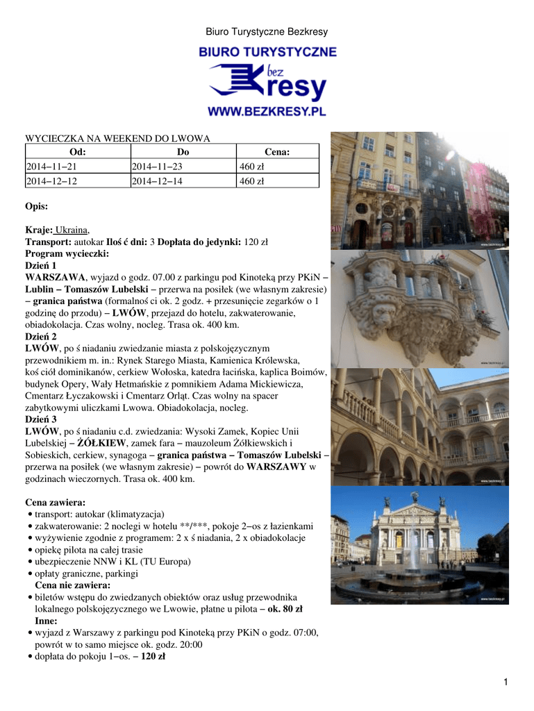 Biuro Turystyczne Bezkresy WYCIECZKA NA WEEKEND DO LWOWA Od: Do 2014−11−21 2014−11−23 2014−12−12 2014−12−14 Cena: 460 zł 460 zł Opis: Kraje: Ukraina, Transport: autokar Ilość dni: 3 Dopłata do jedynki: 120 zł Program wycieczki: Dzień 1 WARSZAWA, wyjazd o godz. 07.00 z parkingu pod Kinoteką przy PKiN − Lublin − Tomaszów Lubelski − przerwa na posiłek (we własnym zakresie) − granica państwa (formalności ok. 2 godz. + przesunięcie zegarków o 1 godzinę do przodu) − LWÓW, przejazd do hotelu, zakwaterowanie, obiadokolacja. Czas wolny, nocleg. Trasa ok. 400 km. Dzień 2 LWÓW, po śniadaniu zwiedzanie miasta z polskojęzycznym przewodnikiem m. in.: Rynek Starego Miasta, Kamienica Królewska, kościół dominikanów, cerkiew Wołoska, katedra łacińska, kaplica Boimów, budynek Opery, Wały Hetmańskie z pomnikiem Adama Mickiewicza, Cmentarz Łyczakowski i Cmentarz Orląt. Czas wolny na spacer zabytkowymi uliczkami Lwowa. Obiadokolacja, nocleg. Dzień 3 LWÓW, po śniadaniu c.d. zwiedzania: Wysoki Zamek, Kopiec Unii Lubelskiej − ŻÓŁKIEW, zamek fara − mauzoleum Żółkiewskich i Sobieskich, cerkiew, synagoga − granica państwa − Tomaszów Lubelski − przerwa na posiłek (we własnym zakresie) − powrót do WARSZAWY w godzinach wieczornych. Trasa ok. 400 km. Cena zawiera: • transport: autokar (klimatyzacja) • zakwaterowanie: 2 noclegi w hotelu **/***, pokoje 2−os z łazienkami • wyżywienie zgodnie z programem: 2 x śniadania, 2 x obiadokolacje • opiekę pilota na całej trasie • ubezpieczenie NNW i KL (TU Europa) • opłaty graniczne, parkingi Cena nie zawiera: • biletów wstępu do zwiedzanych obiektów oraz usług przewodnika lokalnego polskojęzycznego we Lwowie, płatne u pilota − ok. 80 zł Inne: • wyjazd z Warszawy z parkingu pod Kinoteką przy PKiN o godz. 07:00, powrót w to samo miejsce ok. godz. 20:00 • dopłata do pokoju 1−os. − 120 zł 1 Biuro Turystyczne Bezkresy • osoby podróżujące samotnie dokwaterowywane są w miarę możliwości do pokoju 2−3 os. • istnieje możliwość wyjścia na przedstawienie w Operze (koszt ok. 40 zł). Repertuar dostępny na stronie www.opera.lviv.ua. Przedstawienie nie jest punktem programu wycieczki. Biuro może pomóc przy zakupie biletów. Wskazane jest wzięcie odpowiedniego stroju. • łączna trasa przejazdu wynosi ok. 1000 km • min. liczba uczestników − 35 os. • biuro zastrzega sobie prawo do wprowadzania niewielkich zmian w programie Warto wiedzieć: Waluta Obowiązującą waluta na Ukrainie są hrywny (UAH), które można zakupić w kantorach w Polsce. Wymiany złotówek na hrywny można dokonać również na granicy lub we Lwowie, można też zabrać euro lub dolary. Kurs walut: 1 PLN = ok. 2,4 UAH, 1 Euro = ok. 10,5 UAH, 1 USD = ok. 8 UAH. Granica Przy przekroczeniu granicy polsko−ukraińskiej wymagany jest paszport. Transport Przy grupie powyżej 20 osób zamawiany jest autokar na 27, 35 lub 49 miejsc. Przy mniejszej liczbie uczestników wyjazd jest busem. Hotel Hotel we Lwowie, pokoje 2−os. typu standard. Wyżywienie Śniadania, obiadokolacje (serwowane, w hotelu lub w restauracji na mieście). Posiłki przyrządzane zgodnie z miejscowym zwyczajem kulinarnym. W przypadku serwowanych posiłków w cenie jest 1 napój. W trakcie podróży w miarę możliwości planowane będą postoje na posiłki we własnym zakresie. Czas Po przekroczeniu granicy należy przesunąć zegarek o 1 godz. do przodu. Przykładowe ceny Kawa, herbata − od 3 zł, piwo 0,5 l − od 4 zł, woda 0,5 l − od 2 zł, obiad − od 25 zł. Ważne Sugerujemy zabrać wygodne buty oraz kurtkę przeciwdeszczową. Do świątyń prawosławnych należy zabrać odpowiedni strój: nakrycie głowy i długa spódnica (Panie) oraz długie spodnie (Panowie). 2