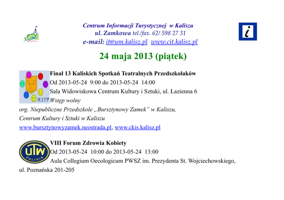 Centrum Informacji Turystycznej w Kaliszu ul. Zamkowa tel./fax. 62/ 598 27 31 e-mail: [email protected] www.cit.kalisz.pl 24 maja 2013 (piątek) Finał 13 Kaliskich Spotkań Teatralnych Przedszkolaków Od 2013-05-24 9:00 do 2013-05-24 14:00 Sala Widowiskowa Centrum Kultury i Sztuki, ul. Łazienna 6 Wstęp wolny org. Niepubliczne Przedszkole „Bursztynowy Zamek” w Kaliszu, Centrum Kultury i Sztuki w Kaliszu www.bursztynowyzamek.neostrada.pl, www.ckis.kalisz.pl VIII Forum Zdrowia Kobiety Od 2013-05-24 10:00 do 2013-05-24 13:00 Aula Collegium Oecologicum PWSZ im. Prezydenta St. Wojciechowskiego, ul. Poznańska 201-205 warsztaty poprowadzą: dr Jolanta Lenartowicz- redaktor naczelna „Życia Uniwersyteckiego”, UM w Poznaniu dr Anna Koprowicz- Radio Szczecin, UM w Szczecinie org. Uniwersytet Trzeciego Wieku „Calisia”,PWSZ im. Prezydenta St. Wojciechowskiego w Kaliszu www.utw.kalisz.pl, www.pwsz.kalisz.pl Spektakl: „Wieczór Trzech Króli, albo co chcecie” Od 2013-05-24 11:00 do 2013-05-24 12:30 Duża Scena Teatru im. W. Bogusławskiego, Plac W. Bogusławskiego 1 reż: Jacek Jabrzyk w rolach głównych: Izabela Beń, Ewa Suchanek, Michał Grzybowski Bilety w cenie: 29 PLN (cena promocyjna) www.teatr.kalisz.pl Konferencja: „Problemy społecznej aktywności w Polsce” Od 2013-05-24 13:00 do 2013-05-24 16:00 Sala Zielona Collegium Novum PWSZ, ul. Nowy Świat 4 prelegenci: Jakub Kulesza, Mikołaj Pancewicz, Arkadiusz Staniszewski, Patryk Hałaczkiewicz, Marcin Chmielowski org. Stowarzyszenie „KoLiber” w Kaliszu, PWSZ im. Prezydenta St. Wojciechowskiego w Kaliszu www.kalisz.koliber.org, www.pwsz.kalisz.pl Puchar Polski w Kolarstwie Torowym Eliminacje do Ogólnopolskiej Olimpiady Młodzieży Od 2013-05-24 15:00 do 2013-05-24 18:00 Tor Kolarski, Wał Matejki 2-4 org. Wielkopolski Związek Kolarski w Kaliszu www.wzkol.pl „Bądź EKO z MDK” Kiermasz książek, zabawek, puzzli, gier Od 2013-05-24 16:00 do 2013-05-24 19:00 Młodzieżowy Dom Kultury im. Wł. Broniewskiego, ul. Fabryczna 13-15 w programie: warsztaty plastyczne, konkursy, pokaz taneczny i inne atrakcje,www.mdk.kalisz.pl Spotkanie z prof. dr hab. Stanisławem Beresiem„Więcej niż słowa- o Rafale Wojaczku” Od 2013-05-24 18:00 do 2013-05-24 19:30 Sala Studio Centrum Kultury i Sztuki, ul. Łazienna 6 recytacja: Maciej Grzybowski prowadzenie: Włodzimierz Garsztka i Maciej Michalski Wstęp wolny org. Centrum Kultury i Sztuki w Kaliszu Kaliskie Towarzystwo Przyjaciół Wrocławia Stowarzyszenie Promocji Sztuki „Łyżka Mleka” www.ckis.kalisz.pl, www.lyzkamleka.eu I urodziny Stowarzyszenia „KoLiber” w Kaliszu Od 2013-05-24 18:00 do 2013-05-24 20:00 Cafe Calisia.pl, al. Wolności 6 w programie: wykład Marcina Chmielowskiego- „Lewicowy a prawicowy libertarianizm na przykładzie Samuela Edwarda Konkina i Hansa Hermanna Hoppe” Wstęp wolny, www.kalisz.koliber.org Spektakl: „Wieczór Trzech Króli, albo co chcecie” Od 2013-05-24 19:00 do 2013-05-24 20:30 Duża Scena Teatru im. W. Bogusławskiego, Plac W. Bogusławskiego 1 reż: Jacek Jabrzyk w rolach głównych: Izabela Beń, Ewa Suchanek, Michał Grzybowski Bilety w cenie: 29 PLN (cena promocyjna) www.teatr.kalisz.pl Impreza: „Wieczór Jazzowy w BeCe” Od 2013-05-24 20:00 do 2013-05-25 03:00 Pub „BeKa”, ul. Piekarska 13 w programie: koncert zespołu Smokestack duet Mateusz Raczyński i Angelika Kowalińska pokaz tańca grupy: Jazz Criminals oraz Sidewalk nauka broadway jazzu Wstęp: 5 PLN www.pubbeka.pl Impreza: „Muzyczne Show” Od 2013-05-24 21:00 do 2013-05-25 05:00 Klub w Kaliskim Parku Wodnym, ul. Sportowa 10 zagrają: DJ Martin i DJ Skovroni Wstęp wolny (selekcja 18+) www.calisia.pl 25 maja 2013 (sobota) Festiwal Wielokulturowości „Główny Rynek” pod Honorowym Patronatem Przewodniczącego Rady Miasta KaliszaGrzegorza Sapińskiego Od 2013-05-25 10:00 do 2013-05-25 19:00 Główny Rynek w Kaliszu prowadzenie: Jacek Jackowicz- aktor Teatru im. W. Bogusławskiego w Kaliszu w programie: godz: 10:00-13:00- wycieczka rowerowa śladami wielokulturowości Kalisza Start: parking „Tesco”, ul. Majkowska 28 godz: 14:00- 19:00- stoiska organizacji pozarządowych godz: 16:00- 19:00- oficjalne otwarcie festiwalu, otwarcie wystawy „Wielokulturowość” w kaliskim Ratuszu, koncerty: The Flash, Zbrodnia Ikara, Cockaine, Anatomia org. Towarzystwo Opieki nad Zabytkami Oddział w Kaliszu www.tonz.com.pl, www.calisia.pl VIII Forum Zdrowia Kobiety Od 2013-05-25 10:00 do 2013-05-25 13:00 Aula Collegium Oecologicum PWSZ im. Prezydenta St. Wojciechowskiego, ul. Poznańska 201-205 warsztaty poprowadzą: dr Jolanta Lenartowicz- redaktor naczelna „Życia Uniwersyteckiego”, UM w Poznaniu dr Anna Koprowicz- Radio Szczecin, UM w Szczecinie org. Uniwersytet Trzeciego Wieku „Calisia”,PWSZ im. Prezydenta St. Wojciechowskiego w Kaliszu www.utw.kalisz.pl, www.pwsz.kalisz.pl Puchar Polski w Kolarstwie Torowym Eliminacje do Ogólnopolskiej Olimpiady Młodzieży Od 2013-05-25 10:00 do 2013-05-25 16:00 Tor Kolarski, Wał Matejki 2-4, org. Wielkopolski Związek Kolarski w Kaliszu, www.wzkol.pl Ogólnopolskie Dni Golfa Od 2013-05-25 10:00 do 2013-05-25 15:00 Golf Park Jantar, ul. Wiankowa 63 org. Pierwszy Kaliski Klub Golfowy www.golf.kalisz.pl Majkowskie Biegi Przełajowe pod patronatem Prezydenta Miasta Kalisza- dr inż. Janusza Pęcherza Indywidualne Mistrzostwa Kalisza Szkół w Biegach Przełajowych XVI Amatorskie Mistrzostwa Kalisza w Biegach Przełajowych XVII Majkowski Bieg Rodzinny XV Otwarte Mistrzostwa Kalisza Nauczycieli w Biegach Przełajowych pod patronatem Wiceprezydenta Miasta Kalisza- Dariusza Grodzińskiego Od 2013-05-25 10:00 do 2013-05-25 15:00 Start: Boisko TKKF Majków, ul. J. Tuwima 2, ulice osiedla Majków org. UKS „Majkowska Dwójka” w Kaliszu, Szkoła Podstawowa nr 2 im. Jana Pawła II w Kaliszu Ognisko TKKF „Majków” w Kaliszu, Kaliski Szkolny Związek Sportowy www.sp2.kalisz.pl, www.kaliskiszs.pl Zwiedzanie miasta zabytkowym A