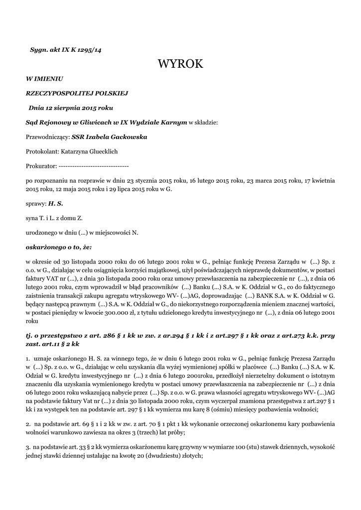 Sygn. akt IX K 1295/14 WYROK W IMIENIU RZECZYPOSPOLITEJ POLSKIEJ Dnia 12 sierpnia 2015 roku Sąd Rejonowy w Gliwicach w IX Wydziale Karnym w składzie: Przewodniczący: SSR Izabela Gackowska Protokolant: Katarzyna Gluecklich Prokurator: ------------------------------po rozpoznaniu na rozprawie w dniu 23 stycznia 2015 roku, 16 lutego 2015 roku, 23 marca 2015 roku, 17 kwietnia 2015 roku, 12 maja 2015 roku i 29 lipca 2015 roku w G. sprawy: H. S. syna T. i L. z domu Z. urodzonego w dniu (...) w miejscowości N. oskarżonego o to, że: w okresie od 30 listopada 2000 roku do 06 lutego 2001 roku w G., pełniąc funkcję Prezesa Zarządu w (...) Sp. z o.o. w G., działając w celu osiągnięcia korzyści majątkowej, użył poświadczających nieprawdę dokumentów, w postaci faktury VAT nr (...), z dnia 30 listopada 2000 roku oraz umowy przewłaszczenia na zabezpieczenie nr (...), z dnia 06 lutego 2001 roku, czym wprowadził w błąd pracowników (...) Banku (...) S.A. w K. Oddział w G., co do faktycznego zaistnienia transakcji zakupu agregatu wtryskowego WV- (...)AG, doprowadzając (...) BANK S.A. w K. Oddział w G. będący następcą prawnym (...) S.A. w K. Oddział w G., do niekorzystnego rozporządzenia mieniem znacznej wartości, w postaci pieniędzy w kwocie 300.000 zł, z tytułu udzielonego kredytu inwestycyjnego nr (...), z dnia 06 lutego 2001 roku tj. o przestępstwo z art. 286 § 1 kk w zw. z ar.294 § 1 kk i z art.297 § 1 kk oraz z art.273 k.k. przy zast. art.11 § 2 kk 1. uznaje oskarżonego H. S. za winnego tego, że w dniu 6 lutego 2001 roku w G., pełniąc funkcję Prezesa Zarządu w (...) Sp. z o.o. w G., działając w celu uzyskania dla wyżej wymienionej spółki w placówce (...) Banku (...) S.A. w K. Odział w G. kredytu inwestycyjnego nr (...) z dnia 6 lutego 2001roku, przedłożył nierzetelny dokument o istotnym znaczeniu dla uzyskania wymienionego kredytu w postaci umowy przewłaszczenia na zabezpieczenie nr (...) z dnia 06 lutego 2001 roku wskazującą nabycie przez (...) Sp. z o.o. w G. prawa własności agregatu wtryskowego WV- (...)AG na podstawie faktury Vat nr (...) z dnia 30 listopada 2000 roku, czym wyczerpał znamiona przestępstwa z art.297 § 1 kk i za występek ten na podstawie art. 297 § 1 kk wymierza mu karę 8 (ośmiu) miesięcy pozbawienia wolności; 2. na podstawie art. 69 § 1 i 2 kk w zw. z art. 70 § 1 pkt 1 kk wykonanie orzeczonej oskarżonemu kary pozbawienia wolności warunkowo zawiesza na okres 3 (trzech) lat próby; 3. na podstawie art. 33 § 2 kk wymierza oskarżonemu karę grzywny w wymiarze 100 (stu) stawek dziennych, wysokość jednej stawki dziennej ustalając na kwotę 20 (dwudziestu) złotych; 4. na podstawie art.63 § 1 k.k. zalicza oskarżonemu na poczet orzeczonej kary grzywny okres zatrzymania w dniach od 19 maja 2004 roku do dnia 20 maja 2004 roku, uznając karę grzywny za wykonaną w wymiarze 4 (czterech) stawek dziennych, albowiem jeden dzień rzeczywistego pozbawienia wolności równoważny jest dwóm stawkom dziennym grzywny; 5. na podstawie art. 627 kpk i art. 2 ust. 1 pkt 3 i art. 3 ust. 1 ustawy z dnia 23 czerwca 1973 r. o opłatach w sprawach karnych (Dz.U. z 1983 r. nr 49 poz. 223 ze zm.) zasądza od oskarżonego na rzecz Skarbu Państwa wydatki w kwocie 70 (siedemdziesiąt) złotych oraz obciąża go opłatą w kwocie 580 (pięćset osiemdziesiąt) złotych. na oryginale właściwy podpis za zgodność z oryginałem Sygn. akt IX K 1295/14 UZASADNIENIE H. S. stanął pod zarzutem tego, że w okresie od 30 listopada 2000 roku do 06 lutego 2001 roku w G., pełniąc funkcję Prezesa Zarządu w (...) Sp. z o.o. w G., działając w celu osiągnięcia korzyści majątkowej, użył poświadczających nieprawdę dokumentów, w postaci faktury VAT nr (...), z dnia 30 listopada 2000 roku oraz umowy przewłaszczenia na zabezpieczenie nr (...), z dnia 06 lutego 2001 roku, czym wprowadził w błąd pracowników (...) Banku (...) S.A. w K. Oddział w G., co do faktycznego zaistnienia transakcji zakupu agregatu wtryskowego WV- (...)AG, doprowadzając (...) BANK S.A. w K. Oddział w G. będący następcą prawnym (...) S.A. w K. Oddział w G., do niekorzystnego rozporządzenia mieniem znacznej wartości, w postaci pieniędzy w kwocie 300.000 zł, z tytułu udzielonego kredytu inwestycyjnego nr (...), z dnia 06 lutego 2001 roku, tj. o przestępstwo z art. 286 § 1 kk w zw. z ar.294 § 1 kk i z art.297 § 1 kk oraz z art.273 k.k. przy zast. art.11 § 2 kk. Sąd Apelacyjny w Katowicach wyrokiem z dnia 14 sierpnia 2014r. sygn. akt II AKa 196/14 uchylił wyrok Sądu Okręgowego w Gliwicach sygn. akt IV K 127/12 z dnia 13 marca 2014r. w części uniewinniającej H. S. od popełnienia czynu opisanego w punkcie II tego orzeczenia tj.z art.286 § 1 k.k. w zw. z art.294 § 1 k.k. i art.297 § 1 k.k. w oraz art.273 k.k. w zw. z art.11 § 2 k.k. W uzasadnieniu wyroku Sąd Apelacyjny w Katowicach podzielił argumentację Sądu Okręgowego, która legła u podstaw uniewinnienia oskarżonego H. S. od czynu wyczerpującego znamiona występku 286 § 1 k.k. w zw. z art.294 § 1 k.k. oraz art.273 k.k. w zw. z art.11 § 2 k.k., natomiast uchylił częściowo powyższy wyrok w zakresie ponownego rozpoznania sprawy, dokonania ustaleń faktycznych w sprawie w zakresie odnoszącym się do realizacji przez oskarżonego H. S. znamion określonych w art.297 § 1 k.k.. (vide k.2266-2267). Tym samym zgodnie z zaleceniem Sądu Apelacyjnego w Katowicach Sąd Rejonowy badał i analizował zachowanie oskarżonego w aspekcie realizacji ustawowych znamion występku z art.297 § 1 k.k. Sąd Rejonowy ustalił następujący stan faktyczny: H. S. pełnił funkcję prezesa jednoosobowego zarządu w (...) Sp. z o.o. w G. ul. (...) (dalej (...) Sp. z o.o.). Oskarżony postanowił poszerzyć zakres działalności spółki poprzez produkcję elementów gumowych do zawieszeń samochodowych i w tym celu postanowił zakupić agregat wtryskowy, poprosił o pomoc w znalezieniu takieg