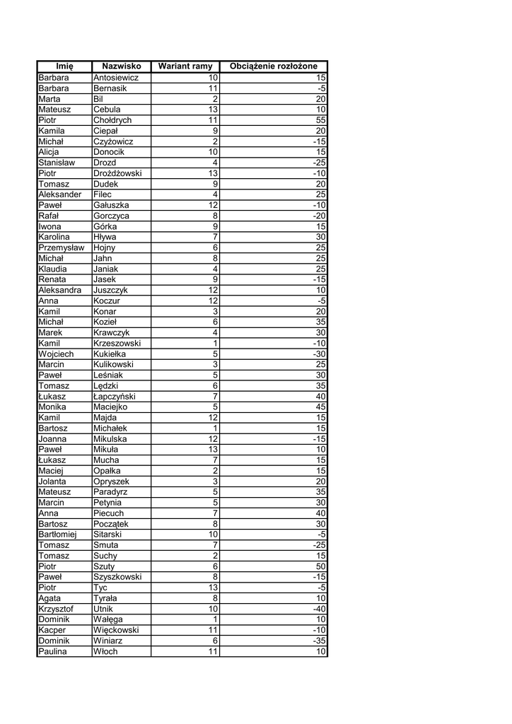 Imię Nazwisko Wariant ramy Obciążenie rozłożone Barbara