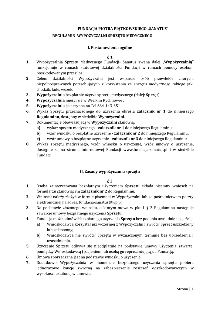 FUNDACJA PIOTRA PIĄTKOWSKIEGO „SANATUS” REGULAMIN WYPOŻYCZALNI SPRZĘTU MEDYCZNEGO I. Postanowienia ogólne 1. 2. 3. 4. 5. 6. 7. 8. §1 Wypożyczalnia Sprzętu Medycznego Fundacji- Sanatus zwana dalej „Wypożyczalnią” funkcjonuje w ramach statutowej działalności Fundacji w ramach pomocy osobom poszkodowanym przez los. Celem działalności Wypożyczalni jest wsparcie osób przewlekle chorych, niepełnosprawnych potrzebujących z korzystania ze sprzętu medycznego takiego jak: chodzik, kule, wózek. Wypożyczalnia bezpłatnie użycza sprzętu medycznego (dalej: Sprzęt). Wypożyczalnia mieści się w Wielkim Rychnowie . Wypożyczalnia jest czynna na Tel 664-143-351 Wykaz Sprzętu przeznaczonego do użyczenia określa załącznik nr 1 do niniejszego Regulaminu, dostępny w siedzibie Wypożyczalni. Dokumentację obowiązującą w Wypożyczalni stanowią: a) wykaz sprzętu medycznego - załącznik nr 1 do niniejszego Regulaminu; b) wzór wniosku o bezpłatne użyczenie - załącznik nr 2 do niniejszego Regulaminu; c) wzór umowy o bezpłatne użyczenie - załącznik nr 3 do niniejszego Regulaminu; Wykaz sprzętu medycznego, wzór wniosku o użyczenie, wzór umowy o użyczenie, dostępne są na stronie internetowej Fundacji www.fundacja-sanatus.pl i w siedzibie Fundacji. II. Zasady wypożyczania sprzętu 1. 2. 3. 4. 5. 6. 7. §2 Osoba zainteresowana bezpłatnym użyczeniem Sprzętu składa pisemny wniosek na formularzu stanowiącym załącznik nr 2 do Regulaminu. Wniosek należy złożyć w formie pisemnej w Wypożyczalni lub za pośrednictwem poczty elektronicznej na adres: [email protected] Na podstawie złożonego wniosku, o którym mowa w pkt 1 § 2 Regulaminu następuje zawarcie umowy bezpłatnego użyczenia Sprzętu. Fundacja może odmówić bezpłatnego użyczenia Sprzętu bez podania uzasadnienia, jeżeli; a) Wnioskodawca korzystał już wcześniej z Wypożyczalni i zwrócił Sprzęt uszkodzony lub zniszczony; b) Wnioskodawca nie zwrócił Sprzętu w wyznaczonym terminie bez uprzedzenia i uzasadnienia. Użyczenie Sprzętu odbywa się nieodpłatnie na podstawie umowy użyczenia zawartej pomiędzy Wnioskodawcą (pacjentem lub osobą go reprezentującą), a Fundacją. Umowa sporządzana jest na podstawie wniosku o użyczenie. Dodatkowo Wypożyczalnia w momencie bezpłatnego użyczenia sprzętu pobiera jednorazowo kaucję zwrotną na zabezpieczenie roszczeń odszkodowawczych w wysokości ustalonej w umowie. Strona | 1 8. 9. 10. Biorący w użyczenie zobowiązany jest do zwrotu Sprzętu w terminie 7 dni liczonych od daty upływu okresu określonego w umowie. W każdym przypadku przekroczenia terminu zwrotu Sprzętu Wypożyczalnia zatrzymuje wpłaconą kaucję zwrotną i może odebrać Sprzęt na koszt i ryzyko biorącego w użyczenie. W każdym przypadku niezwrócenia Sprzętu lub uniemożliwienia odbioru Sprzętu stosuje się odpowiednio zapisy § 3 Regulaminu. Jeżeli biorący w użyczenie chce przedłużyć okres umowy zobowiązany jest zawiadomić o tym fakcie Fundację nie później niż do ostatniego dnia terminu określonego w umowie, wskazać okres na jaki ma zostać przedłużona umowa, przez co umowa zostanie automatycznie przedłużona o wskazany okres. III. Zasady Odpowiedzialności 1. 2. 3. 4. 5. 6. 7. §3 Po zakończeniu użyczenia biorący w użyczenie zobowiązany jest zwrócić Sprzęt do Wypożyczalni w stanie niepogorszonym. W razie uszkodzenia, zniszczenia lub utraty Sprzętu wpłacona kaucja zwrotna podlega zarachowaniu na poczet kosztów naprawy lub zakupu Sprzętu. W przypadku gdy kaucja zwrotna nie jest wystarczająca na pokrycie kosztów naprawy lub zakupu Sprzętu, biorący w użyczenie zobowiązany jest do wyrównania brakującej kwoty w terminie 7 dni liczonych od dnia doręczenia wezwania do zapłaty. Biorący w użyczenie ponosi odpowiedzialność materialną za zniszczony Sprzęt do wysokości wartości Sprzętu określonej w umowie. Podpisanie umowy jest równoznaczne z akceptacją ustalonej wartości Sprzętu. W przypadku uszkodzenia Sprzętu pobrana kaucja zwrotna jest przeznaczona na jego naprawę. W przypadku stwierdzenia, że Sprzęt jest wykorzystywany niezgodnie z przeznaczeniem, jego właściwościami lub instrukcją obsługi, w sposób zagrażający utratą, zniszczeniem lub uszkodzeniem, bądź też w razie powierzenia Sprzętu osobie trzeciej bez uprzedniej zgody Fundacji, Fundacja może rozwiązać umowę bez wypowiedzenia ze skutkiem natychmiastowym i zażądać zwrotu Sprzętu. Zmiana użytkownika Sprzętu może nastąpić tylko za zgodą Fundacji. Fundacja oświadcza, że Sprzęt jest w pełni sprawny technicznie bez gwarancji oraz że nie prowadzi serwisu Sprzętu. Nie respektowanie przez biorących w użyczenie Regulaminu stanowi podstawę do rozwiązania umowy bez wypowiedzenia ze skutkiem natychmiastowym i do odebrania Sprzętu. IV. Postanowienia końcowe 1. 2. §4 Wypożyczalnia ma prawo na zasadach określonych w odrębnych przepisach gromadzić i przetwarzać dane osobowe biorących w użyczenie, którzy wyrażają na to pisemną zgodę. W sprawach nieuregulowanych w niniejszym Regulaminie, załącznikach do niego oraz w umowach wszelkie decyzje wiążące podejmuje Prezes Fundacji-Sanatus. Strona | 2
