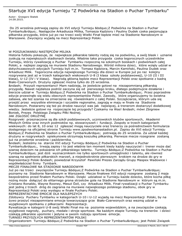 Strona Gminy Łapanów Startuje XVI edycja Turnieju "Z Podwórka na Stadion o Puchar Tymbarku" Autor: Grzegorz Statek 14.09.2015. Do 25 września potrwają zapisy do XVI edycji Turnieju „Z Podwórka na Stadion o Puchar Tymbarku”. Następców Arkadiusza Milika, Tomasza Kędziory i Pauliny Dudek czeka pasjonująca piłkarska przygoda, która już po raz trzeci swój Wielki Finał będzie mieć na Stadionie Narodowym w Warszawie. Zwycięzcy wyjadą na mecz Reprezentacji Polski. W POSZUKIWANIU NASTĘPCÓW MILIKA Historia futbolu pokazuje, że największe piłkarskie talenty rodzą się na podwórku, a swój blask i uznanie zyskują na największych stadionach świata. Właśnie taka przygoda czeka tegorocznych uczestników Turnieju, którzy rywalizację o Puchar Tymbarku rozpoczną na szkolnych boiskach i podwórkach całej Polski, a najlepsi zagrają na murawie Stadionu Narodowego. Wśród miliona dzieci, które wzięły udział w dotychczasowych edycjach Turnieju byli m.in. Tomasz Kędziora, Marcin Kamiński, Paulina Dudek oraz Arkadiusz Milik. Tegoroczna edycja największego Turnieju dla dzieci w Europie już po raz kolejny rozgrywana jest aż w trzech kategoriach wiekowych U-8 (I klasa szkoły podstawowej), U-10 (II i III klasa), U-12 (IV i V klasa). Nagrodą główną będzie mecz Reprezentacji Polski oraz spotkanie z kadrą Biało-Czerwonych. Drużyny zgłaszać można tylko do 25 września. – Przyszli reprezentanci! Mam nadzieję, że jesteście gotowi na niezapomnianą piłkarską przygodę. Nawet najdalsza podróż zaczyna się od pierwszego kroku, dlatego podejmujcie działanie i bierzcie udział w Turnieju „Z Podwórka na Stadion o Puchar Tymbarku”. Przez poprzednie edycje przewinęło się wielu obecnych reprezentantów Polski. Zawody, które organizujemy to świetna zabawa, ale też szansa na zmierzenie się rówieśnikami z całej Polski. Szczęściarze, którym uda się przejść przez wszystkie eliminacje i szczeble regionalne, zagrają w maju w finale na Stadionie Narodowym. Postaramy się też po drodze nauczyć was jak najwięcej, a trenerom dostarczyć dodatkowej wiedzy. Jesteście gotowi na rozpoczęcie tej przygody? Czekamy na Was! – mówi Zbigniew Boniek, Prezes Polskiego Związku Piłki Nożnej. JAK ZGŁOSIĆ DRUŻYNĘ Rozgrywki przeznaczone są dla szkół podstawowych, uczniowskich klubów sportowych, Akademii Młodych Orłów oraz innych podmiotów np. stowarzyszeń i fundacji. Zespoły w trzech kategoriach wiekowych: do lat 8, 10 oraz 12 zgłaszać mogą nauczyciele oraz trenerzy za pośrednictwem formularza dostępnego na oficjalnej stronie Turnieju www.zpodworkanastadion.pl. Zapisy do XVI edycji Turnieju „Z Podwórka na Stadion o Puchar Tymbarku” potrwają do 25 września. Za udział każdej drużyny w rozgrywkach opiekunowie otrzymają koszulkę piłkarską. Pierwsze mecze rozegrane zostaną już na przełomie września i października. – Jesteśmy na starcie XVI edycji Turnieju „Z Podwórka na Stadion o Puchar Tymbarku”, trwają zapisy i to jest właśnie ten moment kiedy każdy nauczyciel i trener może dać szansę dzieciom na pokazanie ich piłkarskiego talentu. Turnieju „Z Podwórka na Stadion o Puchar Tymbarku” jest dziś wyznacznikiem nie tylko sportowych umiejętności i talentu, ale również szansą na spełnienie piłkarskich marzeń, a niejednokrotnie pierwszym krokiem na drodze do gry w Reprezentacji Polski – powiedział Krzysztof Pawiński Prezes Zarządu Grupy Maspex Wadowice i współwłaściciel firmy Tymbark. MECZE FINAŁOWE NA STADIONIE NARODOWYM Już po raz trzeci zwycięzców Turnieju „Z Podwórka na Stadion o Puchar Tymbarku” poznamy na Stadionie Narodowym w Warszawie. Mecze finałowe XVI edycji rozegrane zostaną 2 maja bezpośrednio przed finałem Pucharu Polski. Dzięki udziałowi w Turnieju każde dziecko, które kocha piłkę nożną może dołączyć do elitarnego grona strzelców gola na Stadionie Narodowym w którym są m.in. Cristiano Ronaldo, Wayne Rooney, Mesut Özil, czy Arkadiusz Milik. Finał rywalizacji o Puchar Tymbarku jest jedną z trzech dróg do zagrania na murawie największego polskiego stadionu, obok gry w Reprezentacji Polski oraz występu w finale Pucharu Polski. REPREZENTACYJNE EMOCJE DLA NAJLEPSZYCH Zdobywcy Pucharu Tymbarku w kategoriach U-10 i U-12 wyjadą na mecz Reprezentacji Polski, by na żywo przeżyć niezapomniane emocje towarzyszące grze Biało-Czerwonych oraz wezmą udział w wyjątkowym spotkaniu z piłkarzami Reprezentacji. Rywalizacja w kategorii U-8 swój Wielki Finał ma na poziomie wojewódzkim, a na zwycięzców czekają wyjątkowe nagrody, puchary, medale i stroje sportowe. Na każdym etapie Turnieju na trenerów i dzieci czekają piłkarskie upominki i jedyne w swoim rodzaju sportowe emocje. TURNIEJ PRZYSZŁYCH REPREZENTANTÓW POLSKI Organizatorem Turnieju „Z Podwórka na Stadion o Puchar Tymbarku” jest Polski Związek http://www.lapanow.pl Kreator PDF Utworzono 4 March, 2017, 08:00 Strona Gminy Łapanów Piłki Nożnej, a sponsorem głównym od dziewięciu lat firma Tymbark. Główne cele Turnieju to popularyzacja aktywności sportowej wśród uczniów szkół podstawowych, wyłanianie piłkarskich talentów oraz spełnianie dziecięcych marzeń. Podczas swojej 15-letniej historii Turniej był początkiem piłkarskiej przygody dla wielu obecnych reprezentantów Polski różnych kategorii wiekowych: Arkadiusza Milika, Marcina Kamińskiego, Piotra Zielińskiego, Bartosza Salamona, Tomasza Kędziory, Bartosza Bereszyńskiego, Gracjana Horoszkiewicza, Igora Łasickiego, Karola Żwira, Filipa Jagiełło, Michała Bartkowiaka, oraz Pauliny Dudek. Patronat honorowy nad Turniejem objęli: UEFA Grassroots, Ministerstwo Sportu i Turystyki oraz Ministerstwo Edukacji Narodowej. Szczegółowe informacje o Turnieju znajdują się na stronach: www.zpodworkanastadion.pl oraz www.pzpn.pl Dodatkowych informacji udzielają: Ewa Szumowska – osoba odpowiedzialna za Turniej z