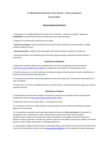 13. Ogólnopolska Konferencja „Pomoc dzieciom – ofiarom przestępstw” 24-25.10.2016 r. REGULAMIN REJESTRACJI 1. Rejestracja na 13. Ogólnopolską Konferencję „Pomoc dzieciom – ofiarom przestępstw” odbywa się WYŁĄCZNIE za pośrednictwem platformy edukacyjnej www.edukacja.fdds.pl. 2. Zgłoszenia na konferencje przyjmowane są w trybie: - rejestracji zamkniętej – przeznaczonej dla osób, których udział w konferencji jest finansowany, według odrębnie ustalonych zasad; - rejestracji otwartej – odpłatnej, dla pozostałych osób zainteresowanych udziałem w konferencji. 3. Niezarejestrowanie się za pośrednictwem formularza zgłoszeniowego uniemożliwia wzięcie udziału w konferencji. REJESTRACJA ZAMKNIĘTA 4. Rejestracja zamknięta odbywa się za pośrednictwem formularza dostępnego online pod adresem http://www.edukacja.fdds.pl/?link=15647 po zalogowaniu się na platformie i wprowadzeniu kodu. 5. Osoby rejestrujące się w trybie rejestracji zamkniętej posługują się kodem grupy lub kodem indywidualnym otrzymanym od pracodawcy lub organizatora. 6. Po pozytywnej weryfikacji otrzymanego zgłoszenia osoba rejestrująca się na konferencji zostaje wpisana na listę uczestników. 7. Osoby, które nie zostały zakwalifikowane lub nie wzięły udziału w rejestracji zamkniętej, mogą wziąć udział w rejestracji otwartej. REJESTRACJA OTWARTA 8. Profesjonaliści zainteresowani udziałem w konferencji rejestrują się wysyłając formularz zgłoszeniowy dostępny pod adresem http://www.edukacja.fdds.pl/?link=15647. 9. Rejestracja otwarta trwa od lipca 2016 r., do wyczerpania miejsc. 10. Po wysłaniu formularza w ciągu 24 godzin osoba zgłaszająca otrzyma mailem potwierdzenie przyjęcia zgłoszenia na konferencję. 11. Po zapełnieniu wszystkich miejsc zgłaszający będą rejestrowani na liście rezerwowej. W zależności od dostępności miejsc na konferencji, osoby zarejestrowane na liście rezerwowej zostaną mailowo poinformowane o wpisaniu lub niewpisaniu na listę uczestników. W przypadku otrzymania informacji o wpisaniu na listę uczestników, niezwłocznie powinna zostać uiszczona opłata rejestracyjna, zgodnie z procedura opisaną w części „Opłaty rejestracyjne” niniejszego regulaminu. 12. W przypadku rezygnacji lub niemożności osobistego udziału, osoba zainteresowana powinna poinformować o tym fakcie organizatorów, pisząc na adres [email protected]. Jeśli w zastępstwie osoby rezygnującej, w konferencji będzie miała uczestniczyć inna osoba, w informacji o rezygnacji prosimy o podanie jej imienia i nazwiska oraz kontaktowego adresu mailowego. Osoba ta powinna zarejestrować się na konferencję wysyłając formularz zgłoszeniowy dostępny pod adresem http://www.edukacja.fdds.pl/?link=15647. OPŁATY REJESTRACYJNE 13. Opłata rejestracyjna za udział w konferencji wynosi 350 złotych brutto (tj. 284,55 zł netto + VAT 23%). Opłata jest bezzwrotna. 14. Na 30 dni przed konferencją (tj. 24 września 2016 r.) uruchomione zostaną płatności, o czym osoby, które zgłosiły swój udział w konferencji zostaną powiadomione drogą mailową z prośbą o dokonanie bezzwłocznie wpłaty na konto Fundacji: Bank Pekao S.A., Warszawa 29 1240 6218 1111 0000 4616 9293 z tytułem operacji: opłata rejestracyjna na konferencję za… (imię i nazwisko uczestnika) UWAGA! Opłata musi zostać przesłana na ww. numer konta. Jest to ważne, ponieważ FDDS posiada również inne konta i istotne jest by pieniądze wpłynęły na właściwe. 15. Opłaty przesyłane przed uruchomieniem płatności (przed 24 września 2016 r.) będą zwracane na konto wpłacającego. 16. Uiszczenie opłaty rejestracyjnej jest warunkiem uczestnictwa w konferencji. Nieuregulowanie należności w ciągu 7 dni kalendarzowych od daty uruchomienia płatności lub otrzymania informacji, skutkować będzie wykreśleniem z listy osób zarejestrowanych do udziału w konferencji. Liczy się data zaksięgowania wpłaty na koncie. 17. Każda opłata rejestracyjna potwierdzona zostanie fakturą. Niezbędne jest podanie danych do faktury przez osoby rejestrujące się do udziału w konferencji podczas uzupełniania formularza zgłoszenia. UWAGA! Prosimy o podawanie właściwych danych do wystawienia faktury – po wniesieniu opłaty nie będzie możliwości zmiany danych nabywcy. 18. W przypadku płatników zwolnionych z VATu (zgodnie z art. 43 ust. 1 pkt 29 lit. C Ustawy z dnia 11 marca 2004 roku o podatku od towarów i usług – tj. Dz. U. 2004 nr 54 poz. 535 z późniejszymi zmianami) osoba zainteresowana otrzymaniem faktury VAT zw. zobowiązana jest dostarczyć stosowne Oświadczenie przed dokonaniem wpłaty mailem (skan) na adres [email protected] oraz pocztą tradycyjną (oryginał) na adres biura FDDS: Ul. Katowicka 31, 03-932 Warszawa – z dopiskiem: Anna Burczak. Oświadczenie takie powinno zawierać: imię i nazwisko uczestnika/uczestników, tytuł konferencji wraz z datą oraz podstawę zwolnienia z podatku VAT przy opłacie rejestracyjnej, a także pieczęć płatnika oraz podpis osoby uprawnionej do reprezentacji podmiotu. Przykładowy wzór oświadczenia stanowi załącznik do niniejszego Regulaminu (załącznik 1). 19. Potwierdzeniem otrzymania wpłaty przez organizatora jest informacja przesłana na adres mailowy uczestnika oraz wystawiona na płatnika faktura. Faktura będzie wysyłana pocztą tradycyjną na wskazany adres. 20. Potwierdzenie otrzymania wpłaty jest jednoznaczne z wpisaniem na listę uczestników konferencji. POZOSTAŁE USTALENIA 21. Dane osobowe zbierane w procesie rejestracji przetwarzane są przez Fundację Dajemy Dzieciom Siłę (FDDS) z siedzibą przy ul. Walecznych 59 w Warszawie (03-926) w celu rekrutacji i organizacji konferencji oraz sprawozdawczości z jej przeprowadzenia, zgodnie z Ustawą z dnia 29.08.1997 r. o ochronie danych osobowych. Niewyrażenie zgody na przetwarzanie podanych danych uniemożliwi udział w rekrutacji. Osobie, której dane