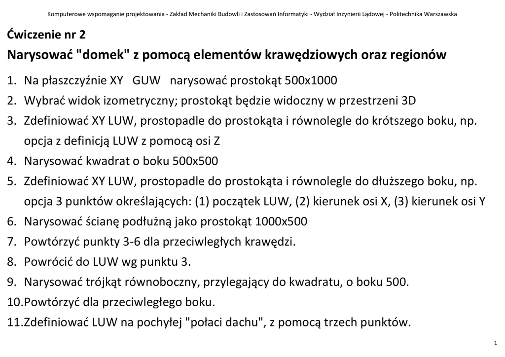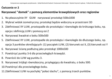 Komputerowe wspomaganie projektowania - Zakład Mechaniki Budowli i Zastosowań Informatyki - Wydział Inżynierii Lądowej - Politechnika Warszawska Ćwiczenie nr 2 Narysować "domek" z pomocą elementów krawędziowych oraz regionów 1. Na płaszczyźnie XY GUW narysować prostokąt 500x1000 2. Wybrać widok izometryczny; prostokąt będzie widoczny w przestrzeni 3D 3. Zdefiniować XY LUW, prostopadle do prostokąta i równolegle do krótszego boku, np. opcja z definicją LUW z pomocą osi Z 4. Narysować kwadrat o boku 500x500 5. Zdefiniować XY LUW, prostopadle do prostokąta i równolegle do dłuższego boku, np. opcja 3 punktów określających: (1) początek LUW, (2) kierunek osi X, (3) kierunek osi Y 6. Narysować ścianę podłużną jako prostokąt 1000x500 7. Powtórzyć punkty 3-6 dla przeciwległych krawędzi. 8. Powrócić do LUW wg punktu 3. 9. Narysować trójkąt równoboczny, przylegający do kwadratu, o boku 500. 10.Powtórzyć dla przeciwległego boku. 11.Zdefiniować LUW na pochyłej "połaci dachu", z pomocą trzech punktów. 1 Komputerowe wspomaganie projektowania - Zakład Mechaniki Budowli i Zastosowań Informatyki - Wydział Inżynierii Lądowej - Politechnika Warszawska 12.Narysować prostokąt połaci dachu ograniczony dwoma trójkątami, dłuższą ścianą (prostokątną) i kalenicą. 13.Powtórzyć punkty 11 i 12 dla drugiej połaci. 14.Narysować kreskowanie wzorem dachówki lub podobnym na połaci dachu. 15.Narysować dwa okna o wymiarach 200x200, na środku kwadratowych ścian; dolna krawędź w odległości 100 od dołu ściany. 16.Narysować drzwi 100x300 na środku jednej z ścian prostokątnych. 17.Zastosować polecenie REGION do zmiany: wszystkich ścian oraz okien i drzwi w obszary 2D. 18.Zastosować polecenie RÓŻNICA do regionów: ściana kwadratowa i okno kwadratowe. 19.Zastosować polecenie RÓŻNICA do regionów: ściana prostokątna i drzwi. 20.Na ścianie, na prawo od drzwi umieścić "Mój dom - imię i nazwisko". 21.Na jednej z połaci dachowych, wzdłuż przekątnej napisać "DOM". 2 Komputerowe wspomaganie projektowania - Zakład Mechaniki Budowli i Zastosowań Informatyki - Wydział Inżynierii Lądowej - Politechnika Warszawska WSKAZÓWKI • uważnie przeczytać całość opisu ćwiczenia • przygotować szkic odręczny, przedstawiający ogólną zasadę budowy domku • na szkicu oznaczyć poszczególne LUW-y, niezbędne do narysowania elementów 2D na płaszczyznach konstrukcyjnych XY • zastosować osie konstrukcyjne wyznaczające podstawowe wymiary modelu • zastosować warstwy, dla elementów (np. ściany, dach) jak i dla opisów lub kreskowań 3