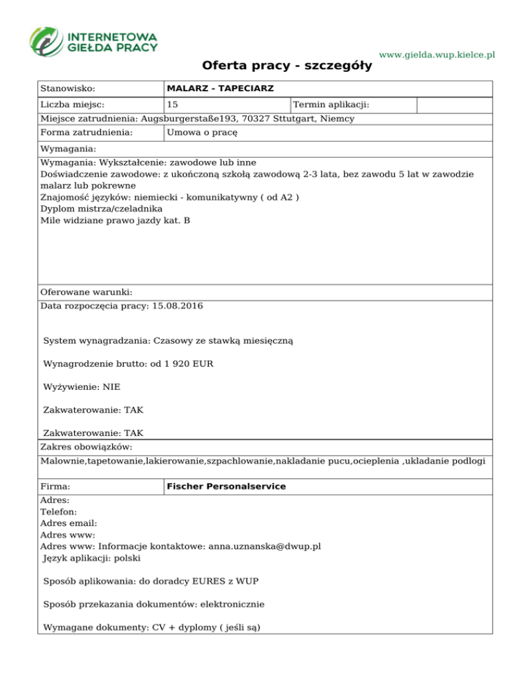 Oferta pracy - szczegóły Stanowisko: MALARZ - TAPECIARZ Liczba miejsc: 15 www.gielda.wup.kielce.pl Termin aplikacji: Miejsce zatrudnienia: Augsburgerstaße193, 70327 Sttutgart, Niemcy Forma zatrudnienia: Umowa o pracę Wymagania: Wymagania: Wykształcenie: zawodowe lub inne Doświadczenie zawodowe: z ukończoną szkołą zawodową 2-3 lata, bez zawodu 5 lat w zawodzie malarz lub pokrewne Znajomość języków: niemiecki - komunikatywny ( od A2 ) Dyplom mistrza/czeladnika Mile widziane prawo jazdy kat. B Oferowane warunki: Data rozpoczęcia pracy: 15.08.2016 System wynagradzania: Czasowy ze stawką miesięczną Wynagrodzenie brutto: od 1 920 EUR Wyżywienie: NIE Zakwaterowanie: TAK Zakwaterowanie: TAK Zakres obowiązków: Malownie,tapetowanie,lakierowanie,szpachlowanie,nakladanie pucu,ocieplenia ,ukladanie podlogi Firma: Fischer Personalservice Adres: Telefon: Adres email: Adres www: Adres www: Informacje kontaktowe: [email protected] Język aplikacji: polski Sposób aplikowania: do doradcy EURES z WUP Sposób przekazania dokumentów: elektronicznie Wymagane dokumenty: CV + dyplomy ( jeśli są) Uwagi: Identyfikator oferty: 10000-1133139078-S Instytucja koordynująca ofertę: Dolnośląski Wojewódzki Urząd Pracy Filia we Wrocławiu Urząd Pracy dokłada wszelkich starań, aby oferty pracy będące w zasobach urzędu, były rzetelne i wiarygodne. Ponieważ wszystkie oferty pracy pochodzą od osób trzecich Urząd Pracy zastrzega, że odpowiedzialność za ewentualne rozbieżności pomiędzy warunkami pracy zaprezentowanymi w niniejszej ofercie a warunkami zaproponowanymi przez potencjalnego pracodawcę ponosi pracodawca.