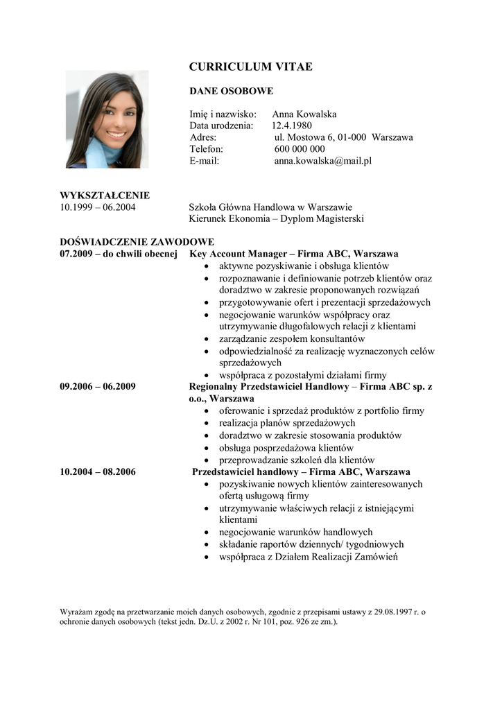 CURRICULUM VITAE DANE OSOBOWE Imię i nazwisko: Data urodzenia: Adres: Telefon: E-mail: WYKSZTAŁCENIE 10.1999 – 06.2004 Anna Kowalska 12.4.1980 ul. Mostowa 6, 01-000 Warszawa 600 000 000 [email protected] Szkoła Główna Handlowa w Warszawie Kierunek Ekonomia – Dyplom Magisterski DOŚWIADCZENIE ZAWODOWE 07.2009 – do chwili obecnej Key Account Manager – Firma ABC, Warszawa aktywne pozyskiwanie i obsługa klientów rozpoznawanie i definiowanie potrzeb klientów oraz doradztwo w zakresie proponowanych rozwiązań przygotowywanie ofert i prezentacji sprzedażowych negocjowanie warunków współpracy oraz utrzymywanie długofalowych relacji z klientami zarządzanie zespołem konsultantów odpowiedzialność za realizację wyznaczonych celów sprzedażowych współpraca z pozostałymi działami firmy 09.2006 – 06.2009 Regionalny Przedstawiciel Handlowy – Firma ABC sp. z o.o., Warszawa oferowanie i sprzedaż produktów z portfolio firmy realizacja planów sprzedażowych doradztwo w zakresie stosowania produktów obsługa posprzedażowa klientów przeprowadzanie szkoleń dla klientów 10.2004 – 08.2006 Przedstawiciel handlowy – Firma ABC, Warszawa pozyskiwanie nowych klientów zainteresowanych ofertą usługową firmy utrzymywanie właściwych relacji z istniejącymi klientami negocjowanie warunków handlowych składanie raportów dziennych/ tygodniowych współpraca z Działem Realizacji Zamówień Wyrażam zgodę na przetwarzanie moich danych osobowych, zgodnie z przepisami ustawy z 29.08.1997 r. o ochronie danych osobowych (tekst jedn. Dz.U. z 2002 r. Nr 101, poz. 926 ze zm.). KURSY I SZKOLENIA Szkolenie „Marketing perswazyjny” Szkolenie „Techniki efektywnej sprzedaży” Kurs „Zarządzanie Wartością Klienta” ZNAJOMOŚĆ JĘZYKÓW OBCYCH Angielski – poziom zaawansowany Niemiecki – poziom podstawowy UMIEJĘTNOŚCI Prawo jazdy kat. B Obsługa komputera: MS Office (Word, Exel, Power Point) DODATKOWE INFORMACJE Cechy osobowościowe: kreatywność, dobra organizacja pracy, umiejętność pracy w zespole, umiejętność analitycznego myślenia, komunikatywność Zainteresowania: moda, fitness, film polski Wyrażam zgodę na przetwarzanie moich danych osobowych, zgodnie z przepisami ustawy z 29.08.1997 r. o ochronie danych osobowych (tekst jedn. Dz.U. z 2002 r. Nr 101, poz. 926 ze zm.).