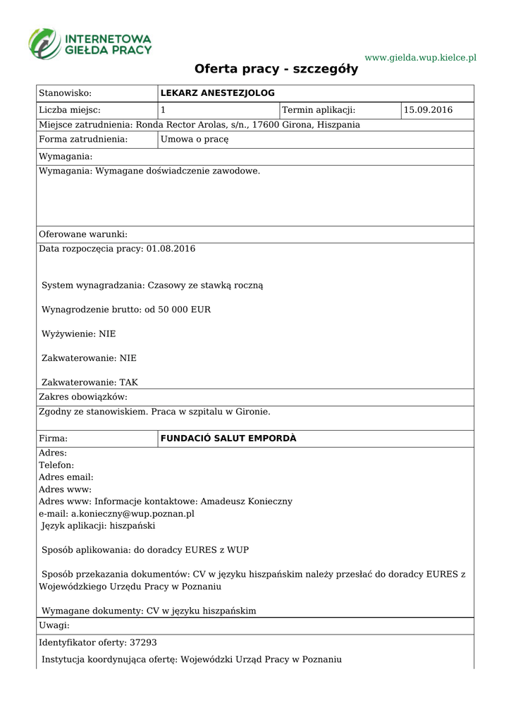 Oferta pracy - szczegóły Stanowisko: LEKARZ ANESTEZJOLOG Liczba miejsc: 1 Termin aplikacji: www.gielda.wup.kielce.pl 15.09.2016 Miejsce zatrudnienia: Ronda Rector Arolas, s/n., 17600 Girona, Hiszpania Forma zatrudnienia: Umowa o pracę Wymagania: Wymagania: Wymagane doświadczenie zawodowe. Oferowane warunki: Data rozpoczęcia pracy: 01.08.2016 System wynagradzania: Czasowy ze stawką roczną Wynagrodzenie brutto: od 50 000 EUR Wyżywienie: NIE Zakwaterowanie: NIE Zakwaterowanie: TAK Zakres obowiązków: Zgodny ze stanowiskiem. Praca w szpitalu w Gironie. Firma: FUNDACIÓ SALUT EMPORDÀ Adres: Telefon: Adres email: Adres www: Adres www: Informacje kontaktowe: Amadeusz Konieczny e-mail: [email protected] Język aplikacji: hiszpański Sposób aplikowania: do doradcy EURES z WUP Sposób przekazania dokumentów: CV w języku hiszpańskim należy przesłać do doradcy EURES z Wojewódzkiego Urzędu Pracy w Poznaniu Wymagane dokumenty: CV w języku hiszpańskim Uwagi: Identyfikator oferty: 37293 Instytucja koordynująca ofertę: Wojewódzki Urząd Pracy w Poznaniu Urząd Pracy dokłada wszelkich starań, aby oferty pracy będące w zasobach urzędu, były rzetelne i wiarygodne. Ponieważ wszystkie oferty pracy pochodzą od osób trzecich Urząd Pracy zastrzega, że odpowiedzialność za ewentualne rozbieżności pomiędzy warunkami pracy zaprezentowanymi w niniejszej ofercie a warunkami zaproponowanymi przez potencjalnego pracodawcę ponosi pracodawca.