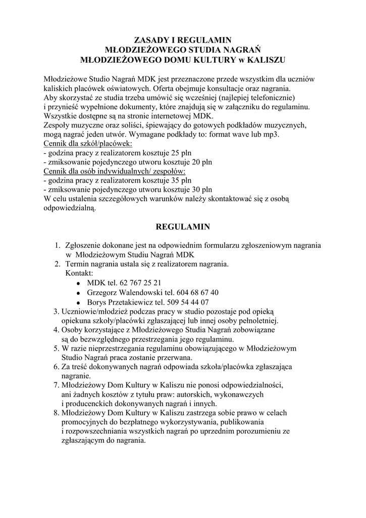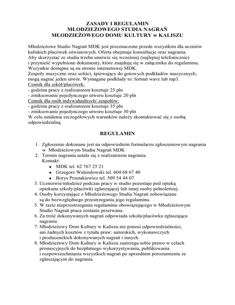 ZASADY I REGULAMIN MŁODZIEŻOWEGO STUDIA NAGRAŃ MŁODZIEŻOWEGO DOMU KULTURY w KALISZU Młodzieżowe Studio Nagrań MDK jest przeznaczone przede wszystkim dla uczniów kaliskich placówek oświatowych. Oferta obejmuje konsultacje oraz nagrania. Aby skorzystać ze studia trzeba umówić się wcześniej (najlepiej telefonicznie) i przynieść wypełnione dokumenty, które znajdują się w załączniku do regulaminu. Wszystkie dostępne są na stronie internetowej MDK. Zespoły muzyczne oraz soliści, śpiewający do gotowych podkładów muzycznych, mogą nagrać jeden utwór. Wymagane podkłady to: format wave lub mp3. Cennik dla szkół/placówek: - godzina pracy z realizatorem kosztuje 25 pln - zmiksowanie pojedynczego utworu kosztuje 20 pln Cennik dla osób indywidualnych/ zespołów: - godzina pracy z realizatorem kosztuje 35 pln - zmiksowanie pojedynczego utworu kosztuje 30 pln W celu ustalenia szczegółowych warunków należy skontaktować się z osobą odpowiedzialną. REGULAMIN 1. Zgłoszenie dokonane jest na odpowiednim formularzu zgłoszeniowym nagrania w Młodzieżowym Studiu Nagrań MDK 2. Termin nagrania ustala się z realizatorem nagrania. Kontakt: MDK tel. 62 767 25 21 Grzegorz Walendowski tel. 604 68 67 40 Borys Przetakiewicz tel. 509 54 44 07 3. Uczniowie/młodzież podczas pracy w studio pozostaje pod opieką opiekuna szkoły/placówki zgłaszającej lub innej osoby pełnoletniej. 4. Osoby korzystające z Młodzieżowego Studia Nagrań zobowiązane są do bezwzględnego przestrzegania jego regulaminu. 5. W razie nieprzestrzegania regulaminu obowiązującego w Młodzieżowym Studio Nagrań praca zostanie przerwana. 6. Za treść dokonywanych nagrań odpowiada szkoła/placówka zgłaszająca nagranie. 7. Młodzieżowy Dom Kultury w Kaliszu nie ponosi odpowiedzialności, ani żadnych kosztów z tytułu praw: autorskich, wykonawczych i producenckich dokonywanych nagrań i innych. 8. Młodzieżowy Dom Kultury w Kaliszu zastrzega sobie prawo w celach promocyjnych do bezpłatnego wykorzystywania, publikowania i rozpowszechniania wszystkich nagrań po uprzednim porozumieniu ze zgłaszającym do nagrania.