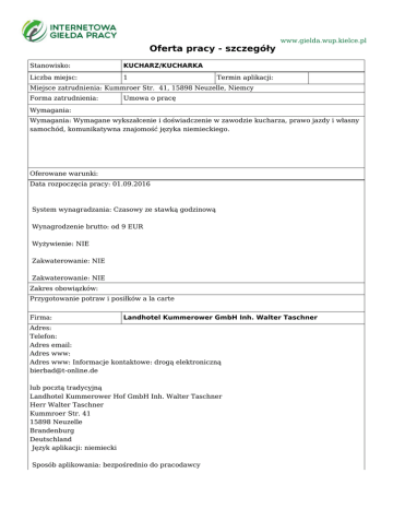 Oferta pracy - szczegóły Stanowisko: KUCHARZ/KUCHARKA Liczba miejsc: 1 www.gielda.wup.kielce.pl Termin aplikacji: Miejsce zatrudnienia: Kummroer Str. 41, 15898 Neuzelle, Niemcy Forma zatrudnienia: Umowa o pracę Wymagania: Wymagania: Wymagane wykszałcenie i doświadczenie w zawodzie kucharza, prawo jazdy i własny samochód, komunikatywna znajomość języka niemieckiego. Oferowane warunki: Data rozpoczęcia pracy: 01.09.2016 System wynagradzania: Czasowy ze stawką godzinową Wynagrodzenie brutto: od 9 EUR Wyżywienie: NIE Zakwaterowanie: NIE Zakwaterowanie: NIE Zakres obowiązków: Przygotowanie potraw i posiłków a la carte Firma: Landhotel Kummerower GmbH Inh. Walter Taschner Adres: Telefon: Adres email: Adres www: Adres www: Informacje kontaktowe: drogą elektroniczną [email protected] lub pocztą tradycyjną Landhotel Kummerower Hof GmbH Inh. Walter Taschner Herr Walter Taschner Kummroer Str. 41 15898 Neuzelle Brandenburg Deutschland Język aplikacji: niemiecki Sposób aplikowania: bezpośrednio do pracodawcy Sposób przekazania dokumentów: drogą elektroniczną [email protected] lub pocztą tradycyjną Landhotel Kummerower Hof GmbH Inh. Walter Taschner Herr Walter Taschner Kummroer Str. 41 15898 Neuzelle Brandenburg Deutschland Wymagane dokumenty: Życiorus, dokumenty potwierdzające wykształcenie i doświadczenie zawodowe. Uwagi: Identyfikator oferty: 10000-1143622488-S Instytucja koordynująca ofertę: Wojewódzki Urząd Pracy w Zielonej Górze Urząd Pracy dokłada wszelkich starań, aby oferty pracy będące w zasobach urzędu, były rzetelne i wiarygodne. Ponieważ wszystkie oferty pracy pochodzą od osób trzecich Urząd Pracy zastrzega, że odpowiedzialność za ewentualne rozbieżności pomiędzy warunkami pracy zaprezentowanymi w niniejszej ofercie a warunkami zaproponowanymi przez potencjalnego pracodawcę ponosi pracodawca.