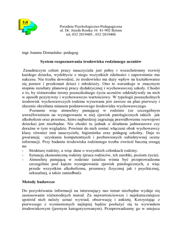 Poradnia Psychologiczno-Pedagogiczna ul. Dr. Józefa Rostka 16 41-902 Bytom tel; 032 2819405 , 032 2819406 mgr Joanna Domańska- pedagog System rozpoznawania środowiska rodzinnego uczniów Zasadniczym celem pracy nauczyciela jest pełny i wszechstronny rozwój każdego dziecka, wydobycie z niego wszystkich zdolności i zapewnienie mu sukcesu. Nie trzeba dowodzić, że środowisko ma duży wpływ na kształtowanie się postaw i przekonań dzieci i młodzieży. Ono to warunkuje w znacznym stopniu rezultaty planowej pracy dydaktycznej i wychowawczej szkoły. Chodzi o to, by różnorodne tereny pozaszkolnego życia uczniów oddziaływały na nich w sposób pozytywny i wychowawczo wartościowy. W typologii pozaszkolnych środowisk wychowawczych rodzina wysuwana jest zawsze na plan pierwszy i słusznie określana mianem podstawowego środowiska wychowawczego. Poznanie więc atmosfery panującej w rodzinie (ze szczególnym uwrażliwieniem na występowanie w niej zjawisk patologicznych takich jak alkoholizm oraz przemoc, które najbardziej zagrażają prawidłowemu rozwojowi dziecka) jest niezbędne. Nie chodzi tu jednak o działania jednorazowe czy doraźne w tym względzie. Powinni do nich zostać włączeni obok wychowawcy klasy również inni nauczyciele, higienistka oraz pedagog szkolny. Daje to gwarancję uzyskania kompetentnych i pozbawionych subiektywnej oceny informacji. Przy badaniu środowiska rodzinnego trzeba zwrócić baczną uwagę na: - Strukturę rodziny, a więc dane o wszystkich członkach rodziny. - Sytuację ekonomiczną rodziny (praca rodziców, ich zarobki, poziom życia). - Atmosferę panującą w rodzinie (analiza winna być przeprowadzona szczególnie pod kątem występowania zjawisk patologicznych, a więc przede wszystkim alkoholizmu, przemocy fizycznej jak i psychicznej, seksualnej, a także zaniedbań). Metody badawcze Do pozyskiwania informacji na interesujący nas temat niezbędne wydaje się zastosowanie różnorodnych metod. Za najwartościowsze i najskuteczniejsze spośród nich należy uznać wywiad, obserwację i ankietę. Korzystając z pierwszego z wymienionych najlepiej będzie posłużyć się tu wywiadem środowiskowym (jawnym kategoryzowanym). Przeprowadzamy go w miejscu zamieszkania rozmówcy, łączymy go z obserwacją mieszkania i rzeczy respondenta, włączamy w wywiad większą liczbę członków jego rodziny. Dzięki bezpośredniemu kontaktowi osoba przeprowadzająca wywiad może obserwować reakcje badanego, a więc wnioskować do pewnego stopnia o prawdziwości uzyskiwanych informacji. Drugą z nich, obserwację, przeprowadzić można bądź to w formie luźnej (swobodnej) bądź pogłębionej - celowej. Pierwszą z nich, polegającą na swobodnym zbieraniu danych w trakcie wszelkiego kontaktu między nauczycielem a uczniem, stosuje w praktyce każdy wychowawca. Nie jest ona nakierowana na określony z góry cel lecz raczej na ustawiczne rejestrowanie bodźców, których dostarczają wychowankowie, w przeciwieństwie do obserwacji pogłębionej nastawionej na z góry określony cel. W miarę potrzeb, stosując inne kryteria i mając także inne cele, możemy skorzystać z obserwacji ciągłej, a więc postrzeganiu określonego przedmiotu lub procesu na przestrzeni dłuższego okresu czasu, albo z obserwacja próbek czasowych polegającej na planowym postrzeganiu wybranego przedmiotu lub zdarzenia w krótszym określonym z góry odcinku czasu. Niepodobna zapomnieć i o możliwości, a w niektórych wypadkach konieczności, zastosowania obserwacji całościowej, która powinna dać pełny obraz danej rzeczywistości, bądź częściowej dostarczającej dane wycinka rzeczywistości. Przy naszych analizach należy mieć świadomość, że w jednym przypadku przeprowadzamy obserwację jawną, gdy obserwator występuje oficjalnie jako badacz, w innych sytuacjach obserwację ukrytą, gdy zataja się przed badanymi, że są przedmiotem obserwacji. Ankieta natomiast polega na zdobywaniu informacji poprzez pytanie wybranych osób za pośrednictwem drukowanej listy pytań, która zwana jest kwestionariuszem. Może ona być anonimowa lub imienna. Dla rozpoznania środowiska rodzinnego uczniów, z myślą o niesieniu im potem pomocy, musimy skorzystać, rzecz oczywista, z tej drugiej. Ale wymienione wyżej metody zaliczane do podstawowych winny być uzupełnione metodami pomocniczymi. Wśród nich na pierwszym miejscu wymienić trzeba rozmowę, a więc odpowiednio ukierunkowany proces interakcji polegający na swobodnej wymianie ustnych wypowiedzi między osobą przeprowadzającą rozmowę a osobą badaną lub informującą o badanej osobie, który umożliwia dotarcie do sfery nieobserwowalnych faktów i przeżyć uczniów w potocznym życiu szkolnym. Nie można też zapominać o analizie dokumentów z wykorzystaniem możliwie pełnej ich gamy, czyli dokumenty pisane, cyfrowe i obrazowe, a ze względu na ich pochodzenie – dokumenty zastane i tworzone intencjonalnie, a także dokumenty oficjalne (urzędowe), wytwory własne uczniów i nauczycieli. One bowiem ubogacają nasze informacje o sytuacji rodzinnej. Sposób przeprowadzania badań i ich etapy Działania rozpoznawcze należy rozpocząć już we wrześniu, na progu roku szkolnego. Pierwszym ich etapem powinno być zebranie najbardziej podstawowych danych metodą ankiety na temat środowiska rodzinnego uczniów przy zastosowaniu kwestionariusza ankiety imiennej przeznaczonej dla rodziców podczas pierwszego zebrania rodzicielskiego. Należy pamiętać, by przed jej rozdaniem podać rodzicom cel badań, zapewnić o dyskrecji oraz poinformować o sposobie wykorzystania uzyskanych danych. Pozwoli to bowiem w pewnym stopniu przełamać niechęć do udzielania odpowiedzi, czy też zapobiec podawaniu nieprawdziwych informacji. Wypełnione kwestionariusze opracowuje wychowawca, a następnie konsultuje otrzymane dane z pedagogiem szkolnym. W drugim etapie przeprowadzone powinny być przez pedagoga szkolnego w 
