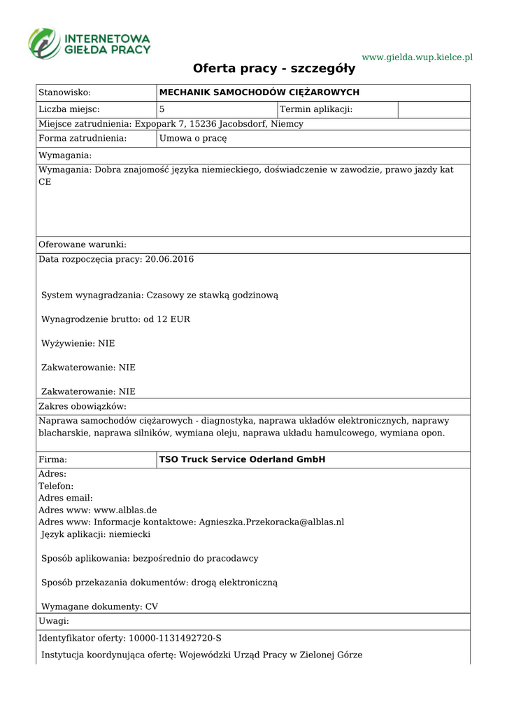 Oferta pracy - szczegóły Stanowisko: MECHANIK SAMOCHODÓW CIĘŻAROWYCH Liczba miejsc: 5 www.gielda.wup.kielce.pl Termin aplikacji: Miejsce zatrudnienia: Expopark 7, 15236 Jacobsdorf, Niemcy Forma zatrudnienia: Umowa o pracę Wymagania: Wymagania: Dobra znajomość języka niemieckiego, doświadczenie w zawodzie, prawo jazdy kat CE Oferowane warunki: Data rozpoczęcia pracy: 20.06.2016 System wynagradzania: Czasowy ze stawką godzinową Wynagrodzenie brutto: od 12 EUR Wyżywienie: NIE Zakwaterowanie: NIE Zakwaterowanie: NIE Zakres obowiązków: Naprawa samochodów ciężarowych - diagnostyka, naprawa układów elektronicznych, naprawy blacharskie, naprawa silników, wymiana oleju, naprawa układu hamulcowego, wymiana opon. Firma: TSO Truck Service Oderland GmbH Adres: Telefon: Adres email: Adres www: www.alblas.de Adres www: Informacje kontaktowe: [email protected] Język aplikacji: niemiecki Sposób aplikowania: bezpośrednio do pracodawcy Sposób przekazania dokumentów: drogą elektroniczną Wymagane dokumenty: CV Uwagi: Identyfikator oferty: 10000-1131492720-S Instytucja koordynująca ofertę: Wojewódzki Urząd Pracy w Zielonej Górze Urząd Pracy dokłada wszelkich starań, aby oferty pracy będące w zasobach urzędu, były rzetelne i wiarygodne. Ponieważ wszystkie oferty pracy pochodzą od osób trzecich Urząd Pracy zastrzega, że odpowiedzialność za ewentualne rozbieżności pomiędzy warunkami pracy zaprezentowanymi w niniejszej ofercie a warunkami zaproponowanymi przez potencjalnego pracodawcę ponosi pracodawca.