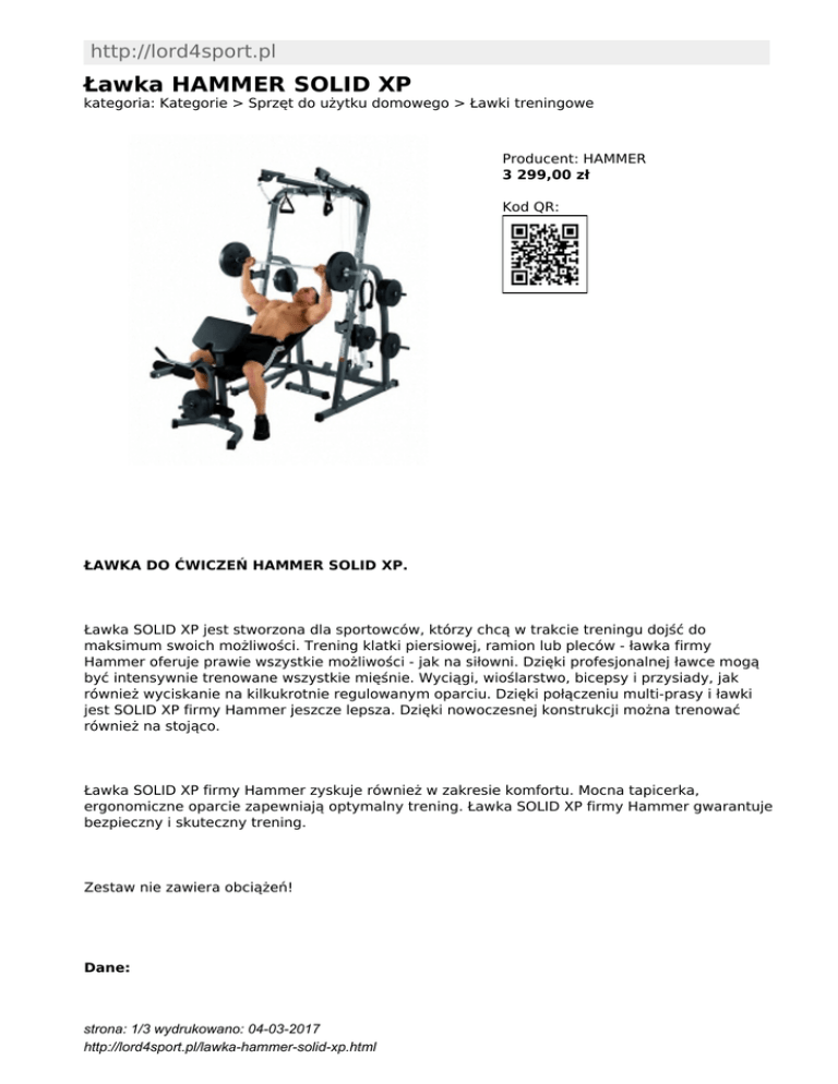 http://lord4sport.pl Ławka HAMMER SOLID XP kategoria: Kategorie > Sprzęt do użytku domowego > Ławki treningowe Producent: HAMMER 3 299,00 zł Kod QR: ŁAWKA DO ĆWICZEŃ HAMMER SOLID XP. Ławka SOLID XP jest stworzona dla sportowców, którzy chcą w trakcie treningu dojść do maksimum swoich możliwości. Trening klatki piersiowej, ramion lub pleców - ławka firmy Hammer oferuje prawie wszystkie możliwości - jak na siłowni. Dzięki profesjonalnej ławce mogą być intensywnie trenowane wszystkie mięśnie. Wyciągi, wioślarstwo, bicepsy i przysiady, jak również wyciskanie na kilkukrotnie regulowanym oparciu. Dzięki połączeniu multi-prasy i ławki jest SOLID XP firmy Hammer jeszcze lepsza. Dzięki nowoczesnej konstrukcji można trenować również na stojąco. Ławka SOLID XP firmy Hammer zyskuje również w zakresie komfortu. Mocna tapicerka, ergonomiczne oparcie zapewniają optymalny trening. Ławka SOLID XP firmy Hammer gwarantuje bezpieczny i skuteczny trening. Zestaw nie zawiera obciążeń! Dane: strona: 1/3 wydrukowano: 04-03-2017 http://lord4sport.pl/lawka-hammer-solid-xp.html Profesjonalna ławka z regulacją oparcia na płasko i pod kątem Przystawka do intensywnego treningu przedramion, bicepsów Wygodny dobrze wyprofilowany modlitewnik Wyciąg górny z dwoma prowadnicami Linki do ćwiczenia tricepsów wysokiej jakości Regulacja wysokości położenia sztangi Solidna stalowa konstrukcja o profilu 50 x 50 mm, odporna na zarysowania Wymiary i wagi: Max. obciążenie ławki: 180 kg Max. obciążenie przystawka do nóg : 40 kg Max. obciążenie wyciągu górnego : 60kg Wymiary ławki: 215 x 73 x 100 cm Wymiary bramy: 143 x 158 x 216 cm Wymiar ławki + brama : 240 x 158 x 216 cm Waga zestawu : 88 kg Ławka nie zawiera obciążeń Ćwiczenia: Motylki Plecy Wyciskanie na klatkę Przystawka na nogi Przystawka na ręce Wiosłowanie Przysiady ze sztangą Triceps Ramiona I wiele innych... Dodatkowe informacje: Gwarancja 36 miesięcy Nr katalogowy: 4513 Paragon lub faktura vat UWAGA!!! Klienci, którzy zamierzają odwiedzić nasze salony w celu przetestowania prosimy o strona: 2/3 wydrukowano: 04-03-2017 http://lord4sport.pl/lawka-hammer-solid-xp.html to,żeby przed przyjazdem sprawdzić telefonicznie czy dany model znajduje się aktualnie na ekspozycji danego salonu. strona: 3/3 wydrukowano: 04-03-2017 http://lord4sport.pl/lawka-hammer-solid-xp.html