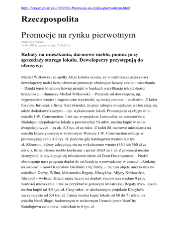 http://beta.rp.pl/artykul/969698-Promocje-na-rynku-pierwotnym.html Rzeczpospolita Promocje na rynku pierwotnym Aneta Gawrońska, 14.01.2013, dostęp w dniu 7.08.2015 Rabaty na mieszkania, darmowe meble, pomoc przy sprzedaży starego lokalu. Deweloperzy przystępują do ofensywy. Michał Witkowski ze spółki Atlas Estates ocenia, że w najbliższej przyszłości deweloperzy nadal będą oferować promocje obniżające koszty zakupu mieszkania. – Dzięki temu klientom łatwiej przejść w bankach weryfikację ich zdolności kredytowej – tłumaczy Michał Witkowski. – Prezenty od dewelopera, np. wyposażenie wnętrz i zagraniczne wycieczki, są mniej cenione – podkreśla. Z kolei Ewelina Juroszek z firmy Atal twierdzi, że przy zakupie mieszkania ważne stają się także dodatkowe korzyści – np. wykańczanie lokali. Promocjami są objęte m.in. osiedla J.W. Construction. I tak np. w projekcie Lewandów na warszawskiej Białołęce trzypokojowe lokale o powierzchni 54 mkw. można kupić w cenie dwupokojowych – za ok. 5,3 tys. zł za mkw. Z kolei 88-metrowe mieszkania na osiedlu Bursztynowym w stołecznym Wawrze J.W. Construction oferuje w promocyjnej cenie 4,9 tys. zł, podczas gdy katalogowa wynosi 6,4 tys. zł. Klientom, którzy zdecydują się na wykończenie wnętrz (450 lub 560 zł za mkw.), firma oferuje meble kuchenne i sprzęt AGD za 1 zł. Z promocji można skorzystać, kiedy kupuje się mieszkanie także od Dom Development. – Nadal obowiązuje nasz program dopłat do rat kredytu wprowadzony w czasach „Rodziny na swoim" – mówi Radosław Bieliński z tej firmy. – Są nim objęte mieszkania na osiedlach Derby, Wilno, Miasteczko Regaty, Klasyków, Młyny Królewskie, Akropol – wylicza. Klient może liczyć na dopłaty stanowiące średnio 8 proc. wartości mieszkania. I tak na przykład w gotowym Miasteczku Regaty mkw. lokalu można kupić od 4,9 tys. zł. Ceny mkw. w ukończonym projekcie Klasyków zaczynają się od 5,4 tys. zł. Taniej można kupić lokale od 68 do 71 mkw. na osiedlu NeoVillage, budowanym w stołecznym Ursusie przez NeoCity. Katalogowa cena mkw. mieszkań to 6 tys. zł. Promocyjna jest o 1 tys. zł niższa. Także spółka Atlas Estates przygotowała promocje na nowy rok. Taniej – od 6,7 tys. zł do 7,4 tys. zł za mkw. – można kupić np. osiem dwupokojowych mieszkań o powierzchni od 45 do 58 mkw. w projekcie Apartamenty przy Krasińskiego realizowanym na warszawskim Żoliborzu. Katalogowa ceny to 7,2–7,8 tys. zł za mkw. Promocje ma też spółka Atal, budująca mieszkania w wielu miastach. Na warszawskim osiedlu Atal Marina w zależności od systemu płatności (np. 90/10, 25/75) ceny mkw. zaczynają się od 5,9 tys. zł. Za mkw. wykończonego lokalu trzeba dopłacić od 200 do 400 zł. Firma obniża też ceny miejsc postojowych w garażu podziemnym – z 28 do 22 tys. zł. Mniej, bo 20, a nie 25 tys. zł, zapłacą za garaż kupujący mieszkania we wrocławskim projekcie Atala – Agrestowa Aleja. W tej inwestycji ceny mkw. lokali zaczynają się od 5,9 tys. zł. Można też zlecić deweloperowi wykończenie mieszkania. Bonusy czekają także na klientów kupujących mieszkania w krakowskiej inwestycji Bronowice Residence. Mkw. wykończonego lokalu kosztuje 100 zł mniej. Stawki za mkw. mieszkania w standardzie deweloperskim zaczynają się w tej inwestycji od 5,9 tys. zł. Wykończenie kosztuje od 200 do 400 zł za mkw. Z promocji można skorzystać, kupując mieszkania także na osiedlach Atala w Łodzi i Katowicach. Małgorzata Ostrowska, dyrektor pionu handlowego w J.W. Construction Holding, ocenia, że choć z końcem ub.r. został wygaszony program dopłat do kredytów, to ceny mieszkań nadal pozostaną atrakcyjne. – Nie przewidujemy jednak dalszych obniżek. Brakuje już marginesu na zysk dla dewelopera, więc kolejne zniżki musiałyby się wiązać ze spadkiem jakości mieszkań – przekonuje Małgorzata Ostrowska. – Już dziś obserwujemy manewry niektórych firm, które tną koszty materiałów – dodaje.Radosław Bieliński zwraca zaś uwagę, że na rynku – także mieszkań używanych – mamy sporą nadpodaż lokali. – W wielu przypadkach decydująca będzie więc cena, co oznacza, że raczej nie należy się spodziewać podwyżek – ocenia Radosław Bieliński. Z kolei Ewelina Juroszek prognozuje, że wygaszenie programu „RnS" odczują przede wszystkim deweloperzy, którzy oferują tańsze inwestycje w gorszych lokalizacjach. – Dobre projekty zawsze znajdą nabywców, dla których oprócz ceny liczy się także jakość i adres inwestycji – mówi Ewelina Juroszek. Jej zdaniem niewykluczone, że część deweloperów, którzy obniżali ceny na potrzeby „RnS", teraz je podniesie. – Na pewno nie osiągną jednak takiego poziomu jak przed „RnS" – zastrzega Ewelina Juroszek. I dodaje, że pierwszy kwartał na rynku nieruchomości najprawdopodobniej będzie trochę spokojniejszy. – Wiele transakcji ze względu na kończący się program dopłat zostało zamkniętych w listopadzie i grudniu ub.r. Zastoju na rynku jednak nie przewidujemy – mówi przedstawicielka Atala. Rafał Zdebski, dyrektor handlowy w spółce Inpro, która buduje mieszkania w Trójmieście, twierdzi z kolei, że ceny mieszkań osiągnęły już niski, dopasowany do oczekiwań rynku poziom. – Dlatego też na pierwsze miesiące 2013 r. nie przygotowaliśmy specjalnych promocji. Spodziewamy się, że w połowie roku w Trójmieście dojdzie do niewielkich podwyżek cen nieruchomości. Rozpoczęte będą bowiem nowe inwestycje – tłumaczy Rafał Zdebski.Zdaniem Sławomira Horbaczewskiego, wiceprezesa spółki Marvipol, poprawę na rynku przyniesie drugi albo trzeci kwartał br. – Trend obniżania cen mieszkań będzie się utrzymywał, ale dotyczy to głównie tych deweloperów, którzy źle przygotowali ofertę i koncentrują się teraz na wyprzedaży nadwyżek lokali – uważa Sławomir Horbaczewski. Jego zdaniem firmy