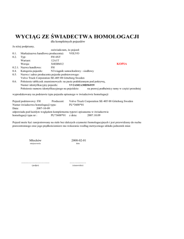 WYCIĄG ZE ŚWIADECTWA HOMOLOGACJI dla kompletnych pojazdów Ja niżej podpisany, zaświadczam, że pojazd: Marka(nazwa handlowa producenta): VOLVO Typ: FH 4XT Wariant: 12A1T Wersja: X4EBM12 KOPIA 0.2.1. Nazwa handlowa: FH 0.4. Kategoria pojazdu: N3/ciągnik samochodowy - siodłowy 0.5. Nazwa i adres producenta pojazdu podstawowego: Volvo Truck Corporation SE-405 08 Göteborg Sweden 0.6. Położenie tabliczek znamionowych: na pasie podokiennym pod pokrywą, YV2AS02A38B504939 Numer identyfikacyjny pojazdu: Położenie numeru identyfikacyjnego na pojeździe: na prawej podłużnicy ramy w części przedniej 0.1. 0.2. wyprodukowany na podstawie typu pojazdu opisanego w świadectwie homologacji Pojazd podstawowy: FH Producent: Volvo Truck Corporation SE-405 08 Göteborg Sweden Numer świadectwa homologacji typu: PL*3608*01 Data: 2007-10-09 odpowiada pod każdym względem kompletnemu typowi opisanemu w świadectwie homologacji typu nr : PL*3608*01 z dnia: 2007.10.09 Pojazd może być zarejestrowany na stałe bez dalszych czynności homologacyjnych i jest przewidzany do ruchu prawostronnego oraz jego prędkościomierz ma wskazania według metrycznego układu jednostek miar. Młochów 2008-02-01 miejscowośc data .................................... ..................... (podpis) (stanowisko) (Wartości i jednostki podane poniżej sa wzięte z dokumentacji homologacyjnej. W razie badania zgodnosci produkcji z typem homologowanym należy je sprawdzić według metod podanych w odpowiednich przepisach dotyczących homologacji typu, uwzg. tolerancje podane w tych przepisach). 1. Liczba osi: 2 2. Osie napędzane: oraz kół: 3. Rozstaw osi: 4.1. Przemieszczenie do przodu siodłowego urządzenia sprzęgającego (min. i maks. w przypadku regulacji): 575 mm 5. Rozstaw kół osi 1: 1991-2110 mm 6.1. Długość: 6.3. Odległośc pomiędzy przodem pojazdu i srodkiem urządzenia sprzęgajacego:nie określono 6.5. Długośc powierzchni ładunkowej: nie dotyczy 7.1. Szerokość: 2550 mm 8. Wysokość: 3530 mm 10.2. Powierzchnia pionowego rzutu pojazdu na podłoże: 11. Zwis tylny:nie określono 12.1. Masa pojazdu gotowego do jazdy: 14.1. Maksymalna masa całkowita pojazdu: 14.2. Rozdział tej masy na poszczególne osie: 6 1 3800 mm 2. 1831-2106 mm 5885 mm m2 7730 kg 20000 kg 1.7100 kg 14.4. nie określono 2.11500 kg Maksymalna masa przypadająca na każdą z osi/grupy osi (wynikającą z ich nośności): 1.7100 kg 2.13000 kg 15. 17. Położenie osi podnoszonych lub obciążalnych (o zmiennym obciążeniu): Maksymalna masa całkowita ciągnięta przez pojazd samochodowy w przypadku: 17.1. Przyczepy: nie dotyczy 17.2. Naczepy: 61000 kg w odniesieniu do wydajności kompresora 17.3. Przyczepy z osią centralną: nie dotyczy 17.4 Maksymalna masa całkowita przyczepy bez hamulca: nie dotyczy 18. Maksymalna masa całkowita zespołu pojazdów: 44000 kg 19.1. Maksymalne obciążenie pionowe na urządzeniu sprzęgającym: 20. Producent silnika: Volvo Powertrain Corporation 21. Kod fabryczny silnika: D13 22. Zasada działania silnika: czterosuwowy z zapłonem samoczynnym 22.1 Bezpośredni wtrysk paliwa: tak 23. Liczba i układ cylindrów: 6,rzędowy 24. Pojemność skokowa silnika: 12777 cm 25. Paliwo: olej napędowy 26. Maksymalna moc silnika: 27. Sprzęgło (rodzaj): mechaniczne, 28. Skrzynia biegów (rodzaj): mechaniczna, 29. Przełożenia na biegach: 1: 11,13; 2:8,92; 3:7,16; 4: 5,74; 5: 4,68; 6:3,75; 7:2,97; 8:2,38;9:1,91; 10:1,53; 11:1,25; 12: 1,00 30. Przełożenie przekładni głównej: 32. Opony i koła: Oś 1:315/70 R22,5 , 33.1. Oś (osie) napędowa (e) mające zawieszenie pneumatyczne lub równoważne do pneumatycznego: PNEUMATYCZNE 34. Układ kierowniczy, sposób wspomagania: mechaniczny, wspomaganie hydrauliczne 35. Zwięzły opis układu hamulcowego: elektronicznie ster. pneumat. układ ham. z hamulcami tarczowymi na wszystkich osiach z układem ABS 36. Ciśnienie w przewodzie zasilającym układ hamulcowy przyczepy: nie określono 37. Rodzaj nadwozia: nie dotyczy 38. Kolor pojazdu (wyłacznie dla N1): nie dotyczy 39. Pojemność zbiornika (wyłącznie dla auto-cystern): nie dotyczy 40. Maksymalny moment podnoszenia: nie dotyczy 41. Liczba i rozmieszczenie drzwi: 2, jedne lewe, jedne prawe 42.1 Liczba i położenie siedzeń: 2, z przodu w rzędzie 43.1 Znak homologacji urządzenia sprzęgającego, o ile jest zamocowane: e1 00-0116 44. Prędkość maksymalna: ogranicznik 90 km/h 45. Poziom hałasu, według regulaminu nr 51 EKG ONZ ze wskazaniem ostatnich poprawek oraz, jeśli przepis nie dotyczy KOPIA tech. 20 000 kg 3 -1 324 kW przy prędkości obrotowej 1800 min 2,85 Oś 2: 315/70R22,5 ma kilka poziomów wymagań-rzeczywiście spełnianego poziomu: R51.02, 70/157-1999/101 na postoju: 83-88 dB(A) przy prędkości obrotowej 1350 obr-1;podczas jazdy: 79,5 dB(A) 46.1. Toksycznośc spalin: Według regulaminu nr 24 i 49 EKG ONZ ze wskazaniem ostatnich poprawek oraz, jeśli przepis ma kilka poziomów wymagań-rzeczywiście spełnianego poziomu: 1. Typ badania: ESC/ELR CO: 0,29; HC: 0,00; NOX: 1,65 CH+NOx: nie dotyczy Dymienie (skorygowany współczynnik absorpcji (m-1): 0.15 Cząstki stałe: 0,025 2. typ badania (w razie potrzeby): nie dotyczy CO: ----- ; NOx: ----- ; NMCH: ----- TCH: ----46.2 Cząstki stałe: ----- Emisja CO2/zużycie paliwa (tylko N1) Numer przepisu podstawowego i najnowszych poprawek zastosowanych w trakcie homologacji: nie dotyczy 47. Warunki miejskie Warunki pozamiejskie Emisja CO2 ..........g/km ..........g/km zużycie paliwa ...l/100km/m3/100km ...l/100km/m3/100km Wartość uśredniona ..........g/km ...l/100km/m3/100km Moc podatkowa lub numer(y) kodu(dów) krajowego(wych) Belgia:........................... Czechy:...........................Dania:........................... Niemcy:........................... Estonia:...........................Grecja:........................... Hiszpania:........................... Francja:...........................Irlandia:........................... W