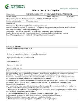 Oferta pracy - szczegóły www.gielda.wup.kielce.pl Stanowisko: KIEROWNIK BUDOWY (BUDOWA ELEKTROWNI ATOMOWEJ) Liczba miejsc: 1 Termin aplikacji: 30.09.2016 Miejsce zatrudnienia: Salmisaarenaukio 1, 00180 HELSINKI, Finlandia Forma zatrudnienia: Umowa o pracę Wymagania: Wymagania: Wykształcenie:Wyższe, w danej dziedzinie Doświadczenie zawodowe: Co najmniej 10 lat pracy przy podobnych projektach, mile widziane przy innych budowach elektrowni atomowych. Znajomość j. obcych:J. angielski – bardzo dobra znajomość w mowie i piśmie Bardzo dobra znajomość j. rosyjskiego jest mile widziana, będzie dodatkowym atutem Inne:Fińska policja sprawdzi kandydatów pod kątem niekaralności. Oferowane warunki: Data rozpoczęcia pracy: 30.08.2016 System wynagradzania: Czasowy ze stawką miesięczną Wynagrodzenie brutto: od 5 000 EUR Wyżywienie: NIE Zakwaterowanie: NIE Zakwaterowanie: NIE Zakres obowiązków: Firma poszukuje kierownika budowy do pracy bezpośrednio przy budowie elektrowni jądrowej Hanhikivi-1 w Pyhäjoki. Konieczność wdrożenia bezpośredniej kontroli nad pracami budowlano-montażowymi, przygotowywanie raportów, współpraca z klientem i kontrahentami na budowie elektrowni, w tym działania podejmowane zgodnie z obowiązującym fińskim ustawodawstwem to podstawowy zakres prac. Ponadto do obowiązków kierownika będzie należeć nadzór nad umowami zgodnie z wymaganiami ustawodawstwa fińskiego obowiązującymi na budowie oraz planowanie i koordynacja działań związanych z rozruchem budowy. Dodatkowo: 1. Bezpośrednia koordynacja prac budowlano-montażowych. 2. Koordynacja, zarządzanie i nadzór nad pracami budowlano-montażowymi wykonywanymi przez kontrahentów, bezpośrednia współpraca z przedstawicielami klientów, w celu zapewnienia wysokiej jakości pracy i dotrzymania terminów, a także do prowadzenia ewidencji wydajności pracy. 3. Planowanie, koordynacja i optymalizacja prac budowlanych 4. Monitorowanie i ocena postępu robót zgodnie z harmonogram prac. 5. Organizacja struktury zarządzania projektem bezpośrednio na budowie w oparciu o obowiązujące dokumenty projektowe i wymaganiami umowy EPC. 6. Organizacja nadzoru nad przestrzeganiem przepisów prawnych w dziedzinie bezpieczeństwa i higieny pracy w Finlandii w odniesieniu do firm i podwykonawców, przez cały okres realizacji projektu. 7. Sporządzanie i przekazywanie sprawozdań z postępów w realizacji projektu, planowanych i nieplanowanych inspekcji, planów i zgłoszeń dotyczących optymalizacji pracy. 8. Współpraca z lokalnymi władzami miejskimi. 9. Organizacja prac mających na celu badanie wypadków i innych zdarzeń na budowie. 10. Pozostałe wymagania zostaną omówione bezpośrednio z kandydatem podczas dalszego etapu rekrutacji. Firma: RAOS Project Oy II Adres: Telefon: Adres email: Adres www: Adres www: Informacje kontaktowe: [email protected] oraz do wiadomości [email protected] W tytule maila proszę wpisać „site manager” Język aplikacji: angielski Sposób aplikowania: do doradcy EURES z EOG Sposób przekazania dokumentów: drogą elektroniczną Wymagane dokumenty: •CV, •list motywacyjny, ww. w j. angielskim •2 referencje wraz z informacją z kim można się kontaktować, •wysokość oczekiwanego wynagrodzenia Uwagi: Identyfikator oferty: 8963982 Instytucja koordynująca ofertę: Wojewódzki Urząd Pracy w Gdańsku Urząd Pracy dokłada wszelkich starań, aby oferty pracy będące w zasobach urzędu, były rzetelne i wiarygodne. Ponieważ wszystkie oferty pracy pochodzą od osób trzecich Urząd Pracy zastrzega, że odpowiedzialność za ewentualne rozbieżności pomiędzy warunkami pracy zaprezentowanymi w niniejszej ofercie a warunkami zaproponowanymi przez potencjalnego pracodawcę ponosi pracodawca.