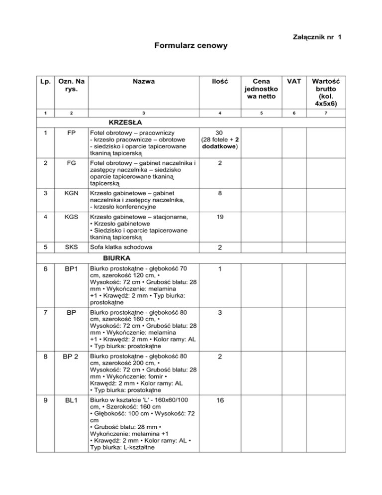 Załącznik nr 1 Formularz cenowy Lp. Ozn. Na rys. Nazwa Ilość Cena jednostko wa netto VAT Wartość brutto (kol. 4x5x6) 1 2 3 4 5 6 7 KRZESŁA 1 FP Fotel obrotowy – pracowniczy - krzesło pracownicze – obrotowe - siedzisko i oparcie tapicerowane tkaniną tapicerską 30 (28 fotele + 2 dodatkowe) 2 FG Fotel obrotowy – gabinet naczelnika i zastępcy naczelnika – siedzisko oparcie tapicerowane tkaniną tapicerską 2 3 KGN Krzesło gabinetowe – gabinet naczelnika i zastępcy naczelnika, - krzesło konferencyjne 8 4 KGS Krzesło gabinetowe – stacjonarne, • Krzesło gabinetowe • Siedzisko i oparcie tapicerowane tkaniną tapicerską 19 5 SKS Sofa klatka schodowa 2 BIURKA 6 BP1 Biurko prostokątne - głębokość 70 cm, szerokość 120 cm, • Wysokość: 72 cm • Grubość blatu: 28 mm • Wykończenie: melamina +1 • Krawędź: 2 mm • Typ biurka: prostokątne 1 7 BP Biurko prostokątne - głębokość 80 cm, szerokość 160 cm, • Wysokość: 72 cm • Grubość blatu: 28 mm • Wykończenie: melamina +1 • Krawędź: 2 mm • Kolor ramy: AL • Typ biurka: prostokątne 3 8 BP 2 Biurko prostokątne - głębokość 80 cm, szerokość 200 cm, • Wysokość: 72 cm • Grubość blatu: 28 mm • Wykończenie: fornir • Krawędź: 2 mm • Kolor ramy: AL • Typ biurka: prostokątne 2 9 BL1 Biurko w kształcie 'L' - 160x60/100 cm, • Szerokość: 160 cm • Głębokość: 100 cm • Wysokość: 72 cm • Grubość blatu: 28 mm • Wykończenie: melamina +1 • Krawędź: 2 mm • Kolor ramy: AL • Typ biurka: L-kształtne 16 10 BL2 Biurko w kształcie 'L' - 180x60/100 cm , • Szerokość: 180 cm • Głębokość: 100 cm • Wysokość: 72 cm • Grubość blatu: 28 mm • Wykończenie: melamina +1 • Krawędź: 2 mm • Kolor ramy: AL • Typ biurka: L-kształtne 8 DOSTAWKI 11 DB1 Dostawka do biurek w kształcie 'L' – 60x60 cm, • Szerokość: 60 cm • Głębokość: 60 cm • Wysokość: 72 cm • Grubość blatu: 28 mm • Wykończenie: melamina +1 • Krawędź: 2 mm • Kolor ramy: AL 4 12 DB2 Dostawka do biurek w kształcie 'L' – 80x60 cm, • Szerokość: 80 cm • Głębokość: 60 cm • Wysokość: 72 cm • Grubość blatu: 28 mm • Wykończenie: melamina +1 • Krawędź: 2 mm • Kolor ramy: AL 8 13 DB3 Dostawka do biurek prostokątnych o głębokości 60 cm - szerokość 60 cm, • • Wysokość: 72 cm • Grubość blatu: 28 mm • Wykończenie: melamina +1 • Krawędź: 2 mm • Kolor ramy: AL 3 14 DB6 Dostawka do biurek w kształcie 'L' – 100x60 cm, • Szerokość: 100 cm • Głębokość: 60 cm • Wysokość: 72 cm • Grubość blatu: 28 mm • Wykończenie: melamina +1 • Krawędź: 2 mm • Kolor ramy: AL 6 15 DB7 Dostawka do biurek w kształcie 'L' – 120x60 cm, • Szerokość: 120 cm • Głębokość: 60 cm • Wysokość: 72 cm • Grubość blatu: 28 mm • Wykończenie: melamina +1 • Krawędź: 2 mm • Kolor ramy: AL 2 16 DB8 Dostawka do biurek w kształcie 'L' – 120x80 cm, • Szerokość: 120 cm • Głębokość: 80 cm • Wysokość: 72 cm • Grubość blatu: 28 mm • Wykończenie: melamina +1 • Krawędź: 2 mm • Kolor ramy: AL 2 KONTENERY 17 KM Kontener mobilny piórnik + 3 szuflady 60 cm, • Szerokość: 43 cm • Głębokość: 60 cm • Wysokość: 59,5 cm • Wykończenie: melamina +1 • Krawędź: 2 mm • Kolor ramy: AL 29 18 CD Szafka mobilna „Caddy”, • Szerokość: 48 cm • Głębokość: 48 cm • Wysokość: 103 cm • Wykończenie: melamina +1 • Krawędź: 2 mm • Kolor ramy: AL 10 STOŁY 19 SK Stół konferencyjny o wymiarach 140x80 cm, • Szerokość: 140 cm • Głębokość: 80 cm • Wysokość: 72 cm • Grubość blatu: 28 mm • Wykończenie: melamina +1 • Krawędź: 2 mm • Kolor ramy: AL 2 20 SK1 Stolik kwadratowy o wysokości 72 cm, • Szerokość: 80 cm • Głębokość: 80 cm • Wysokość: 72 cm • Grubość blatu: 28 mm • Wykończenie: melamina +1 • Krawędź: 2 mm • Kolor ramy: AL 2 SZAFY 21 SzU Szafa ubraniowa – wysokość 189,5x44,5x80 cm, • Szerokość: 80 cm • Głębokość: 44,5 cm • Wysokość: 189,5 cm • Wykończenie: melamina +1 • Krawędź: 2 mm • Kolor ramy: AL 13 22 SZ Szafa z drzwiami płytowymi uchylnymi – wysokość 189,5x44,5x80 cm, • Szerokość: 80 cm • Głębokość: 44,5 cm • Wysokość: 189,5 cm • Wykończenie: melamina +1 • Krawędź: 2 mm • Kolor ramy: AL 32 23 SZN Szafa z drzwiami płytowymi uchylnymi – wysokość 114,5x44,5x80 cm, • Szerokość: 80 cm • Głębokość: 44,5 cm • Wysokość: 114,5 cm • Wykończenie: melamina +1 • Krawędź: 2 mm • Kolor ramy: AL 5 24 RD Regał na dokumenty – wysokość 189,5x44,5x80 cm , • Szerokość: 80 cm• Głębokość: 44,5 cm • Wysokość: 189,5 cm• Wykończenie: melamina +1 • Krawędź: 2 mm• Kolor ramy: AL 12 25 SM Szafa stalowa z zamkiem – wysokość 200x43,5x100 , • Szerokość: 100 cm • Głębokość: 43,5 cm 12 • Wysokość: 200 cm • Wykończenie: blacha 1,5 mm • Szafa na dokumenty SZAFY I REGAŁY MAGAZYNOWE 26 - Regał archiwum dwustronny 4 półki wym. 97x180x66 cm 16 27 - Regał archiwum jednostronny 4 półki 97x180x35 cm 14 28 - Regał archiwum jednostronny 5 półek 97x190x35 cm 2 WYPOSAŻENIE POMOCNICZE 29 WSP Wieszak ścienny z półką na ubrania 120x60x20 cm 3 30 PD Półka na drukarkę 60x35 cm 2 31 Wk Wieszak na komputer 29 32 - Półka na klawiaturę 59x34 cm 29 33 - Panel frontowy górny dwustronnie tapicerowany szer. 180 cm, wys. 56,5 cm 3 34 - Panel frontowy górny dwustronnie tapicerowany szer. 160 cm, wys. 56,5 cm 6 35 - Panel frontowy górny dwustronnie tapicerowany szer. 200 cm, wys. 56,5 cm 1 OGÓŁEM