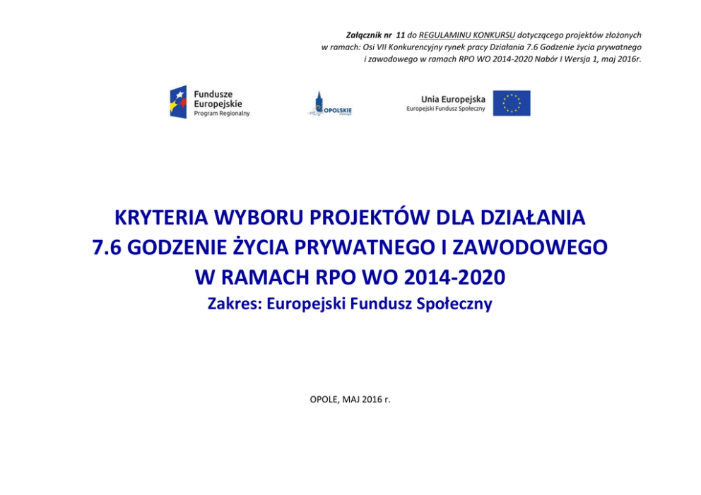 Załącznik nr 11 do REGULAMINU KONKURSU dotyczącego projektów złożonych w ramach: Osi VII Konkurencyjny rynek pracy Działania 7.6 Godzenie życia prywatnego i zawodowego w ramach RPO WO 2014-2020 2014 Nabór I Wersja 1, maj 2016r. KRYTERIA WYBORU PROJEKTÓW DLA DZIAŁANIA 7.6 GODZENIE ŻYCIA PRYWATNEGO I ZAWODOWEGO W RAMACH RPO WO 2014-2020 2014 Zakres: Europejski Fundusz Społeczny OPOLE, MAJ 2016 r. Załącznik nr 11 do REGULAMINU KONKURSU dotyczącego projektów złożonych w ramach: Osi VII Konkurencyjny rynek pracy Działania 7.6 Godzenie życia prywatnego i zawodowego w ramach RPO WO 2014-2020 Nabór I Wersja 1, maj 2016r. Oś priorytetowa Działanie VII Konkurencyjny rynek pracy 7.6 Godzenie życia prywatnego i zawodowego Kryteria formalne (TAK/NIE) 1 LP Nazwa kryterium Źródło informacji 1 2 3 Charakter kryterium W/B Definicja 4 5 1. Wnioskodawca uprawniony do składania wniosku. Wniosek o dofinansowanie Bezwzględny Rodzaj potencjalnych beneficjentów określony w "Szczegółowym opisie osi priorytetowych RPO WO 2014-2020", ogłoszeniu o naborze wniosków oraz regulaminie konkursu. 2. Roczny obrót Wnioskodawcy i/lub Partnera (o ile budżet projektu uwzględnia wydatki Partnera) jest równy lub wyższy od wydatków w projekcie. Wniosek o dofinansowanie Bezwzględny Kryterium weryfikowane na podstawie zapisów wniosku o dofinansowanie, wypełnionego na podstawie instrukcji. 3. Typ projektu możliwy do realizacji w ramach działania / poddziałania, zakresu konkursu/ wykazu projektów zidentyfikowanych (stanowiącego załącznik do SZOOP)1. Wniosek o dofinansowanie Bezwzględny 4. Wniosek wypełniony poprawnie, zgodnie z wymogami Instytucji Zarządzającej RPO WO 2014-2020. Wniosek o dofinansowanie Bezwzględny 5. Wniosek spełnia warunki finansowe (m.in. wartość kwotowa, wysokość procentowa wnioskowanego dofinansowania, całkowita wartość projektu, koszty pośrednie, kwoty ryczałtowe). Wniosek o dofinansowanie Bezwzględny 6. Wnioskodawca wybrał wszystkie wskaźniki horyzontalne. Wniosek o dofinansowanie Bezwzględny Wybrać właściwe. Rodzaje dopuszczalnych projektów określone w "Szczegółowym opisie osi priorytetowych RPO WO 2014-2020",ogłoszeniu o naborze wniosków oraz regulaminie konkursu (w przypadku projektu pozakonkursowego zgodnie z pismem wzywającym do złożenia wniosku projektowego). Zgodnie z ”Instrukcją wypełniania wniosku o dofinansowanie projektu ze środków Europejskiego Funduszu Społecznego w ramach RPO WO 2014-2020”, treścią ogłoszenia o naborze wniosków, regulaminem konkursu lub pismem wzywającym do złożenia wniosku . Zgodnie z warunkami dla działania/poddziałania/rodzaju projektu określonymi w "Szczegółowym opisie osi priorytetowych RPO WO 2014-2020", w Regulaminie Konkursu oraz ogłoszeniu o naborze wniosków o dofinansowanie. Wnioskowana intensywność pomocy publicznej jest zgodna z poziomem dozwolonym dla regionu*. Wnioskodawca wybiera wszystkie wskaźniki horyzontalne. Dla wskaźników, których realizację zakłada w ramach projektu określa wartość docelową większą od zera. Dla pozostałych wpisuje zero. Załącznik nr 11 do REGULAMINU KONKURSU dotyczącego projektów złożonych w ramach: Osi VII Konkurencyjny rynek pracy Działania 7.6 Godzenie życia prywatnego i zawodowego w ramach RPO WO 2014-2020 Nabór I Wersja 1, maj 2016r. Kryteria formalne (TAK/NIE) Charakter kryterium W/B Definicja Wniosek o dofinansowanie Bezwzględny Wnioskodawca określa wartość docelową większą od zera przynajmniej dla jednego wskaźnika obligatoryjnego lub pomocniczego w projekcie. Wniosek o dofinansowanie Bezwzględny Kryterium weryfikowane na podstawie zapisów wniosku o dofinansowanie (oświadczenie), wypełnionego na podstawie instrukcji. Wniosek o dofinansowanie Bezwzględny Zgodnie z Wytycznymi w zakresie trybów wyboru projektów na lata 2014-2020. LP Nazwa kryterium Źródło informacji 1 2 3 7. 8. 9. Wnioskodawca określił wartość docelową większą od zera przynajmniej dla jednego wskaźnika w projekcie. Wnioskodawca oraz partnerzy (jeśli dotyczy) nie podlegają wykluczeniu z ubiegania się o dofinansowanie na podstawie: - art. 207 ust. 4 ustawy z dnia 27 sierpnia 2009 r. o finansach publicznych, - art. 12 ustawy z dnia 15 czerwca 2012 r. o skutkach powierzania wykonywania pracy cudzoziemcom przebywającym wbrew przepisom na terytorium Rzeczypospolitej Polskiej, - art. 9 ustawy z dnia 28 października 2002 r. o odpowiedzialności podmiotów zbiorowych za czyny zabronione pod groźbą kary. Kryterium dot. projektów pozakonkursowych. Do dofinansowania nie może zostać wybrany projekt, który został usunięty z wykazu projektów zidentyfikowanych, stanowiącego załącznik do SZOOP. *Uwaga dotycząca wszystkich kryteriów: pojęcie „region” jest równoznaczne z województwem opolskim 4 5 Załącznik nr 11 do REGULAMINU KONKURSU dotyczącego projektów złożonych w ramach: Osi VII Konkurencyjny rynek pracy Działania 7.6 Godzenie życia prywatnego i zawodowego w ramach RPO WO 2014-2020 Nabór I Wersja 1, maj 2016r. Kryteria merytoryczne – uniwersalne (TAK/NIE) Charakter kryterium W/B Definicja 4 5 Wniosek o dofinansowanie Bezwzględny Sprawdza się, czy wybrane wskaźniki obligatoryjne i pomocnicze w sposób kompleksowy opisują zakres rzeczowy i charakter projektu, a także czy mierzą założone w nim cele/ grupy docelowe. Wniosek o dofinansowanie Bezwzględny LP Nazwa kryterium Źródło informacji 1 2 3 1. Wybrane wskaźniki są adekwatne do określonego na poziomie projektu celu/ typu projektu/ grupy docelowej. 2. Założone wartości docelowe wskaźników większe od zera są realne do osiągnięcia. 1. 2. 3. Zgodność z prawodawstwem unijnym oraz właściwymi zasadami unijnymi, w tym: - zasada równości kobiet i mężczyzn w oparciu o standard minimum, - zasada równości szans i niedyskryminacji w tym dostępności dla osób z niepełnosprawnościami oraz - zasada zrównoważonego rozwoju