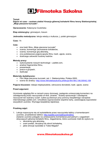Temat: Dajcie mi czas – szukam siebie! Kreacja głównej bohaterki filmu Iwony Siekierzyńskiej „Moje pieczone kurczaki”. Opracowanie: Katarzyna Czubińska Etap edukacyjny: gimnazjum, liceum Jednostka metodyczna: lekcja wiedzy o kulturze, j. polski gimnazjum Czas: 1h Cele: • • • • • zna treść filmu „Moje pieczone kurczaki” ocenia, komentuje zachowanie bohaterów, ocenia, komentuje grę aktorską, zna podstawowe pojęcia języka filmu: kadr, ujęcie, scena, dostrzega celowość budowy kadrów. Metody pracy: • wykorzystanie nowych technologii – padlet.com, • analiza fragmentów filmu, • prezentacja, • praca w grupach, • dyskusja Materiały dydaktyczne: • Film Moje pieczone kurczaki, reż. I. Siekierzyńska, Polska 2002, • scena do analizy: http://www.filmotekaszkolna.pl/lekcja-film-film,106,50042,159 Pojęcia kluczowe: relacje międzyludzkie, odroczona dorosłość, kadr, ujęcie, scena Przed zajęciami: Uczniowie oglądają film w ramach pracy domowej, następnie umieszczają komentarz na udostępnionej przez nauczyciela on-line „ścianie”. Ścianę opracowuje i udostępnia nauczyciel lub wybrany uczeń. Łatwo ją stworzyć przy pomocy bezpłatnego narzędzia internetowego padlet.com. Umożliwia wypracowanie wspólne karty, zawierającej wypowiedzi wszystkich uczniów. Wymaga bezpłatnej rejestracji. Przebieg zajęć: 1. Lekcja rozpoczyna się od wyświetlenia przez nauczyciela tablicy z komentarzami uczniów, przykładowa tablica: http://padlet.com/wall/qxy5ns6rko Zadanie uczniów polegało na umieszczeniu komentarza pod jednym z zagadnień dotyczących głównej bohaterki filmu. Zagadnienia, które uczniowie mieli do wyboru to: • skomentuj grę aktorską, • oceń postać, skrytykuj lub obroń bohaterkę, • jakie emocje wywołała w Tobie Magda? www.filmotekaszkolna.pl W przypadku baraku dostępu do rzutnika i komputera, warto poprosić uczniów o przygotowanie kart z odpowiedziami na podane wcześniej zagadnienia. Zasada ta sama, wybierają zagadnienie i przygotowują na karcie swój komentarz. Wchodząc do klasy przyklejają kartę do jednego z trzech zawieszonych brystoli. Lekcję rozpoczynamy od analizy wypowiedzi uczniów, stają się one początkiem analizy złożonej kreacji bohaterki (około5 min) Nauczyciel dzieli klasę na grupy losowo, można zastosować kolorowe kartki lub numerki, które uczniowie losują z papierowej torby lub woreczka przed wejściem do klasy. Grupy otrzymują kartę z pytaniami do sceny rozmowy matki z córką. Nauczyciel zwraca również uwagę na kompozycję kadrów i jej wpływ na treść filmu. Po ponownym obejrzeniu sceny grupy wypełniają karty (karta w załączniku). • Co jest tematem rozmowy matki z córką? • Przeanalizuj zachowanie matki oraz córki. • Z czego wynikają ich emocje? • Zwróć uwagę na mimikę Magdy. Wypisz kolejne fazy uczuć widoczne na jej twarzy. • Przeanalizuj wypowiedź matki, zwróć uwagę, na zagadnienia które porusza, oceń ich wpływ na Magdę. Omówienie pracy grup. Wnioski: Z czego wynika niezdrowa relacja córki z matką? Np. Matka rozczarowana postawą córki, uważa ją za niedojrzałą, nieodpowiedzialną. Stwierdza, że córka nie chce lub nie potrafi nic zmienić w swoim życiu, nigdy jej nic nie wychodziło i pewnie nie wyjdzie - stygmatyzuje Magdę. Córka nie akceptowana przez matkę od wczesnych lat, nigdy nie spełniała jej oczekiwań, w rezultacie zaczyna zachowywać się tak jak matka sugeruje, opóźnia swoją dorosłość. Dowodem na to jest powrót do kraju pod skrzydła, niekoniecznie opiekuńczej matki, kobiety która zapewnia jej mimo dorosłego życia dach nad głową. (Około 10 min) 2. Kolejne zadanie to analiza rozmowy żony z mężem w kuchni, uczniowie ponownie otrzymują zagadnienia ukierunkowujące ich uwagę, oglądają wybraną scenę: • Przedstaw krótko sytuację, uczucia bohaterów, • Co psuje atmosferę między Magdą a Tomkiem? • Dlaczego nie mogą się porozumieć? Omówienie pracy grup. Wnioski: Jak przedstawia się relacja Magdy z Tomkiem w całym filmie, z czego wynika? Np.: Magda po siedmiu latach znudzona jest swym partnerem życiowym, a przede wszystkim tym, że obydwoje nie dorobili się przez ten czas niczego, ciągle liczą grosz do grosza, nie stać ich na mieszkanie, a nawet na powrót ze spotkania u znajomych taksówką. Cała www.filmotekaszkolna.pl sytuacja frustruje bohaterkę, zaczyna się zastanawiać czy jeszcze coś ich łączy. Nawet desperackie próby Tomka, mające na celu utrzymanie rodziny, nie są w stanie ożywić jej uczuć, sprawia to dopiero obserwacja, okiem kamery i filmowanie męża jako głównego bohatera jej warsztatowego filmu. (Około 10 min) 3. Ostatnia ze scen do analizy, to relacja Magdy i jej synka Antka. Podobinie jak i poprzednio grupy otrzymują karty pracy, oglądają fragment filmu. • Przeanalizuj uczucia kobiety w początkowych ujęciach? • Jak reaguje na słowa syna? Jakie mają dla niej znaczenie? Np. Magda zabiegana między gotowaniem obiadu a zerkaniem w komputer, rozdrażniona, nie wie czym ma zająć się w danej chwili. Początkowo nie reaguje na wołanie chłopca, gdy już sprawdza co dzieje się z synem stwierdza, że nie jest to tak istotne. Powraca do swoich zajęć, pośpiech, zdenerwowanie, zniecierpliwienie towarzyszą jej w trakcie sceny. Wywołana ponownie z kuchni, upartym wołaniem chłopca, staje przed nim zniecierpliwiona. Słowa wypowiedziane przez Antka zmieniają diametralnie jej zachowanie. Słowa: „kocham Cię mamo” przywracają hierarchię wartości, porządek w zabieganym życiu Magdy. (Około 5 min) 4. Ostatni z punktów kart pracy to analiza kompozycji kadrów ich wpływ na treść filmu w prezentowanych scenach. • W jaki sposób zostały wykadrowane ujęcia? • Jak wpływa to na zrozumienie treści filmu? Nauczyciel przypomina lub wprowadza pojęcia: • kadr – nieruchomy obraz wyświetlony na ekranie. • ujęcie – odcinek s