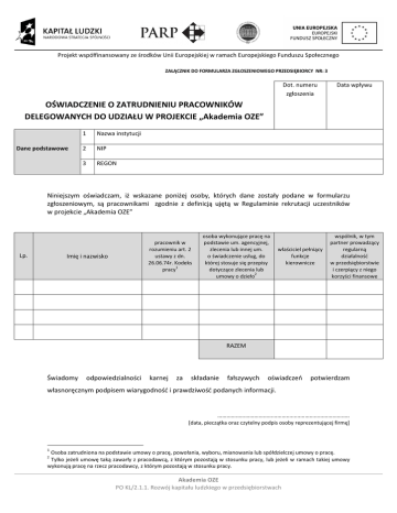 Projekt współfinansowany ze środków Unii Europejskiej w ramach Europejskiego Funduszu Społecznego ZAŁĄCZNIK DO FORMULARZA ZGŁOSZENIOWEGO PRZEDSIĘBIORCY NR: 3 Dot. numeru zgłoszenia Data wpływu OŚWIADCZENIE O ZATRUDNIENIU PRACOWNIKÓW DELEGOWANYCH DO UDZIAŁU W PROJEKCIE „Akademia OZE” Dane podstawowe 1 Nazwa instytucji 2 NIP 3 REGON Niniejszym oświadczam, iż wskazane poniżej osoby, których dane zostały podane w formularzu zgłoszeniowym, są pracownikami zgodnie z definicją ujętą w Regulaminie rekrutacji uczestników w projekcie „Akademia OZE” Lp. pracownik w rozumieniu art. 2 ustawy z dn. 26.06.74r. Kodeks 1 pracy Imię i nazwisko osoba wykonujące pracę na podstawie um. agencyjnej, zlecenia lub innej um. o świadczenie usług, do której stosuje się przepisy dotyczące zlecenia lub 2 umowy o dzieło właściciel pełniący funkcje kierownicze wspólnik, w tym partner prowadzący regularną działalność w przedsiębiorstwie i czerpiący z niego korzyści finansowe RAZEM Świadomy odpowiedzialności karnej za składanie fałszywych oświadczeń potwierdzam własnoręcznym podpisem wiarygodność i prawdziwość podanych informacji. ………………………………………………………………………….. [data, pieczątka oraz czytelny podpis osoby reprezentującej firmę] 1 Osoba zatrudniona na podstawie umowy o pracę, powołania, wyboru, mianowania lub spółdzielczej umowy o pracę. Tylko jeżeli umowę taką zawarły z pracodawcą, z którym pozostają w stosunku pracy, lub jeżeli w ramach takiej umowy wykonują pracę na rzecz pracodawcy, z którym pozostają w stosunku pracy. 2 Akademia OZE PO KL/2.1.1. Rozwój kapitału ludzkiego w przedsiębiorstwach