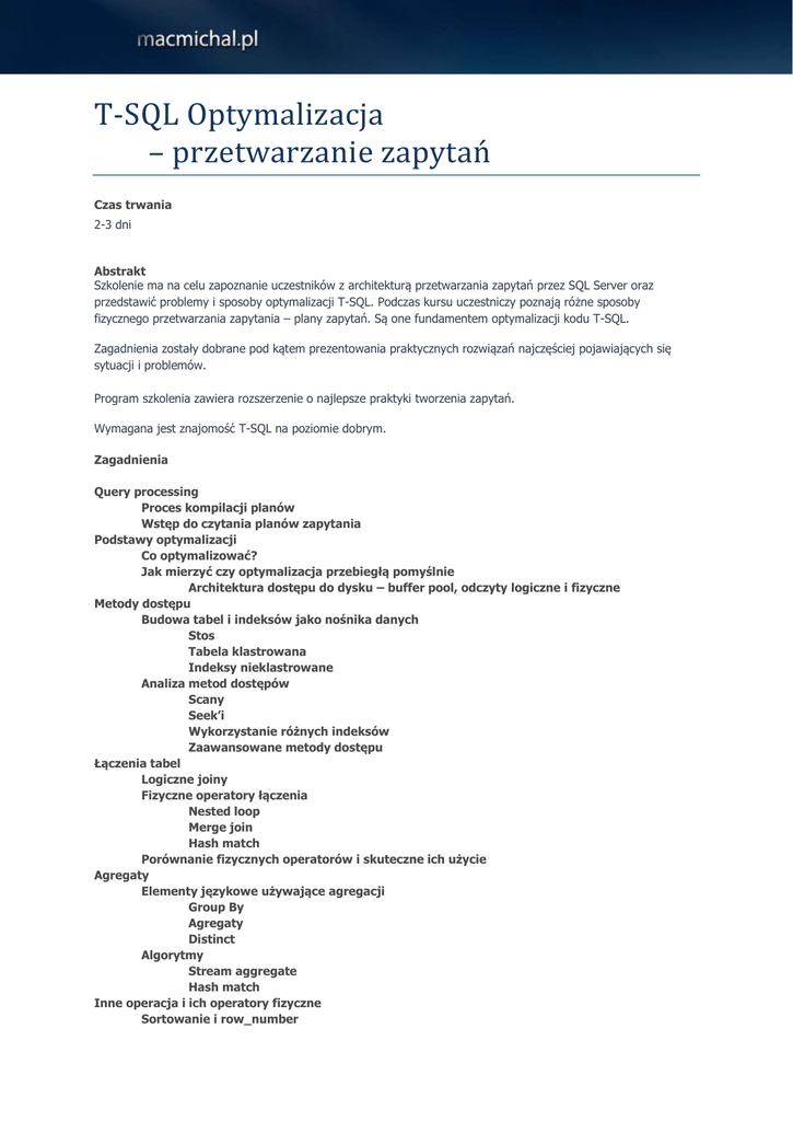 T-SQL Optymalizacja – przetwarzanie zapytań Czas trwania 2-3 dni Abstrakt Szkolenie ma na celu zapoznanie uczestników z architekturą przetwarzania zapytań przez SQL Server oraz przedstawić problemy i sposoby optymalizacji T-SQL. Podczas kursu uczestniczy poznają różne sposoby fizycznego przetwarzania zapytania – plany zapytań. Są one fundamentem optymalizacji kodu T-SQL. Zagadnienia zostały dobrane pod kątem prezentowania praktycznych rozwiązań najczęściej pojawiających się sytuacji i problemów. Program szkolenia zawiera rozszerzenie o najlepsze praktyki tworzenia zapytań. Wymagana jest znajomość T-SQL na poziomie dobrym. Zagadnienia Query processing Proces kompilacji planów Wstęp do czytania planów zapytania Podstawy optymalizacji Co optymalizować? Jak mierzyć czy optymalizacja przebiegłą pomyślnie Architektura dostępu do dysku – buffer pool, odczyty logiczne i fizyczne Metody dostępu Budowa tabel i indeksów jako nośnika danych Stos Tabela klastrowana Indeksy nieklastrowane Analiza metod dostępów Scany Seek’i Wykorzystanie różnych indeksów Zaawansowane metody dostępu Łączenia tabel Logiczne joiny Fizyczne operatory łączenia Nested loop Merge join Hash match Porównanie fizycznych operatorów i skuteczne ich użycie Agregaty Elementy językowe używające agregacji Group By Agregaty Distinct Algorytmy Stream aggregate Hash match Inne operacja i ich operatory fizyczne Sortowanie i row_number Wykrywanie dziur i wysp Agregacja warunkowa Rekursywne zapytania – CTE Operator CROSS APPLY Podzapytania skorelowane i nieskorelowane Różne funkcje tabelaryczne Cacheowanie planów Autoparametryzacja Parameter sniffing Plan reuse Problemy wynikające z cachowanie planów i sposoby ich rozwiazywania Dynamiczny sql, a kompilacja planów Pomocne narzędzia i techniki SQL Profiler Database Tuning Advisor Plan guides i hinty – sposoby na wymuszenie konkretnych planów jako ostatnia deska ratunku Blokady i obsługa transakcji Architektura blokad w SQL Serverze z uwzględnieniem poziomów izolacji Poziomy odzyskiwanie bazy i ich wpływ na wydajność Praktyczne tips & tricks Jak generować szybko dane przykładowe? Deadlock między 2 sesjami: SELECT i INSERT Kontakt W celu omówienia szczegółów i rezerwacji terminu prosimy o kontakt [email protected] 513 959379