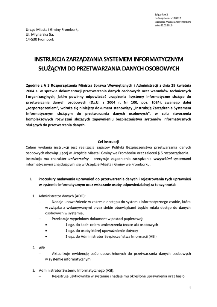 Urząd Miasta i Gminy Frombork, Ul. Młynarska 5a, 14-530 Frombork Załącznik nr 2 do Zarządzenia nr 17/2012 Burmistrza Miasta i Gminy Frombork z dnia 22.03.2012r. INSTRUKCJA ZARZĄDZANIA SYSTEMEM INFORMATYCZNYM SŁUŻĄCYM DO PRZETWARZANIA DANYCH OSOBOWYCH Zgodnie z § 3 Rozporządzenia Ministra Sprawa Wewnętrznych i Administracji z dnia 29 kwietnia 2004 r. w sprawie dokumentacji przetwarzania danych osobowych oraz warunków technicznych i organizacyjnych, jakim powinny odpowiadać urządzenia i systemy informatyczne służące do przetwarzania danych osobowych (Dz.U. z 2004 r. Nr 100, poz. 1024), zwanego dalej „rozporządzeniem”, wdraża się niniejszy dokument stanowiący „Instrukcję Zarządzania Systemem Informatycznym służącym do przetwarzania danych osobowych”, w celu stworzenia kompleksowych rozwiązań służących zapewnieniu bezpieczeństwa systemów informatycznych służących do przetwarzania danych. Cel instrukcji Celem wydania instrukcji jest realizacja zapisów Polityki Bezpieczeństwa przetwarzania danych osobowych obowiązującej w Urzędzie Miasta i Gminy we Fromborku oraz zaleceń § 5 rozporządzenia. Instrukcja ma charakter uniwersalny i precyzuje zagadnienia zarządzania wszystkimi systemami informatycznymi znajdującymi się w Urzędzie Miasta i Gminy we Fromborku. I. Procedury nadawania uprawnień do przetwarzania danych i rejestrowania tych uprawnień w systemie informatycznym oraz wskazanie osoby odpowiedzialnej za te czynności: 1. Administrator danych (ADO): Nadaje upoważnienie w zakresie dostępu do systemu informatycznego osobie, która w związku z wykonywanymi przez siebie obowiązkami będzie miała dostęp do danych osobowych w systemie, Przekazuje wypełniony dokument w postaci papierowej: · 1 egz. do kadr- celem umieszczenia teczce akt osobowych · 1 egz. do osoby której upoważnienie dotyczy · 1 egz. do Administrator Bezpieczeństwa Informacji (ABI) 2. ABI: - Aktualizuje ewidencję osób upoważnionych do przetwarzania danych osobowych w systemie informatycznym 3. Administrator Systemu Informatycznego (ASI): Rejestruje użytkownika w systemie i nadaje mu określone uprawnienia oraz hasło 1 INSTRUKCJA ZARZĄDZANIA SYSTEMEM INFORMATYCZNYM SŁUŻĄCYM DO PRZETWARZANIA DANYCH OSOBOWYCH 4. Użytkownik: Uwierzytelnia się w systemie po podaniu identyfikatora oraz hasła uzyskanego od Informatyka Użytkownik zmienia hasło na swoje, którego nie przekazuje nikomu i może rozpocząć pracę w aplikacji 5. Użytkownik jest wyrejestrowany z systemu informatycznego w każdym przypadku utraty przez niego uprawnień dostępu do danych osobowych, co ma miejsce w przypadku: Ustania zatrudnienia Zmiany zakresu obowiązków Utraty uprawnienia Informację pisemną o ustaniu zatrudnienia, zmianie zakresu obowiązków i utracie upoważnienia, przekazują kadry do ABI z chwilą ich zaistnienia II. Stosowane metody i środki uwierzytelnienia oraz procedury związane z ich zarządzeniem i użytkowaniem: 1. W systemie informatycznym stosuje się uwierzytelnienia dwustopniowe; na poziomie: - Dostępu do stacji roboczej - Dostępu do aplikacji 2. Do uwierzytelnienia użytkownika w systemie na obu poziomach stosuje się hasła. 3. Hasło dostępu do stacji roboczej składa się, co najmniej z 8 znaków, zawiera małe i wielkie litery oraz cyfry i znaki specjalne. 4. Hasła nie mogą być powszechnie używanymi słowami. W szczególności nie należy jako haseł wykorzystywać: dat, imion, nazwisk, inicjałów, numerów rejestracyjnych samochodów, numerów telefonów. 5. Hasło nie może być ujawnione nawet po utracie przez nie ważności. 6. Zmiana hasła do systemu następuje nie rzadziej, niż co 30 dni oraz niezwłocznie w przypadku podejrzenia, że hasło mogło zostać ujawnione. 7. Dla każdej osoby upoważnionej instalowany jest odrębny identyfikator i hasło, tak, aby bezpośredni dostęp do danych osobowych przetwarzanych w systemie informatycznym mogła mieć tylko ta osoba, która poda właściwy identyfikator i hasło. 8. Identyfikator użytkownika jest wpisywany do ewidencji osób upoważnionych do przetwarzania danych osobowych w systemie informatycznym wraz z zakresem upoważnienia oraz datą nadania uprawnień. 9. System zostanie zablokowany po trzykrotnej próbie nieudanego logowania się. III. Procedury rozpoczęcia, zawieszenia i zakończenia pracy przeznaczone dla użytkowników systemu: 1. Rozpoczęcia pracy: - Uruchomienie komputera w systemie podając hasło - Uruchomić komputer i zalogować się podając swój identyfikator dostępu do stacji 2 INSTRUKCJA ZARZĄDZANIA SYSTEMEM INFORMATYCZNYM SŁUŻĄCYM DO PRZETWARZANIA DANYCH OSOBOWYCH - roboczej Uruchomić aplikację, wpisując swój identyfikator i hasło dostępu - uzależnione od programu Rozpocząć pracę 2. Procedura zawieszenia pracy w systemie: - Przy każdym opuszczeniu stanowiska komputerowego, dopilnować, aby na ekranie nie były wyświetlone dane osobowe - Przed opuszczeniem miejsca pracy na dłuższy czas użytkownik obowiązany jest poczekać, aż zaktywizuje się wygaszacz ekranu 3. Procedura zakończenia pracy w systemie: - Zarchiwizować dane - Zamknąć aplikację - Zamknąć system - Wyłączyć monitor i drukarkę IV. Procedury tworzenia kopii zapasowych i zbiorów danych oraz programów i narzędzi programowych służących do ich przetwarzania: 1. W cyklu cotygodniowym kopie wykonywane są w serwerze oraz na odrębnym stanowisku komputerowym pełniącym funkcję archiwum. 2. W cyklu miesięcznym kopie zapisywane są na płytach cd. 3. W razie potrzeby kopie zapasowe wykonywane są przez użytkowników aplikacji na płytach lub innych nośnikach pamięci w cyklu codziennym. 4. ASI sprawuje nadzór nad wykonywaniem kopii zapasowych oraz weryfikuje ich poprawność. V. Sposób, miejsce i okres przechowywania: 1. Wydruki archiwalne lub bieżące przechowywane mogą być wyłącznie w pomieszczeniach uniemożliwiających dostęp do nich przez osoby nieupoważn