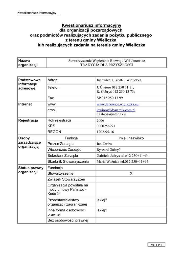 Kwestionariusz informacyjny Kwestionariusz informacyjny dla organizacji pozarządowych oraz podmiotów realizujących zadania pożytku publicznego z terenu gminy Wieliczka lub realizujących zadania na terenie gminy Wieliczka Nazwa organizacji Podstawowe informacje adresowe Internet Rejestracja Osoby zarządzające organizacją Status prawny organizacji Stowarzyszenie Wspierania Rozwoju Wsi Janowice TRADYCJA DLA PRZYSZŁOŚCI Adres Janowice 1, 32-020 Wieliczka Telefon J. Ćwioro 012 250 11 11; R. Gabryś 012 250 13 73; Fax SP 012 250 13 99 www www.Janowice.wieliczka.eu email [email protected] [email protected] Rok rejestracji 2006 KRS 0000256993 REGON 1202-95-16 Funkcja Imię i nazwisko Prezes Zarządu Jan Ćwiro Wiceprezes Zarządu Ryszard Gabryś Sekretarz Zarządu Gabriela Jedrys tel.o12 250+11+54 Skarbnik Stowarzyszenia Maria Woźniak tel.012 250+11+94 Fundacja Stowarzyszenie X Związek Stowarzyszeń Organizacja powstała na mocy umowy Państwo Kościół Przedstawicielstwo organizacji zagranicznej jakiej? Inna forma osobowości prawnej jakiej? Bez osobowości prawnej str. 1 z 5 Kwestionariusz informacyjny Czy Tak data uzyskania: organizacja Jesteśmy w takcie procedury posiada status Nie pożytku publicznego? X Historia organizacji (początek działalności oraz najważniejsze osiągnięcia) 4.12.2205r.Założenie Stowarzyszenia- zebranie założycielskie - nieodpłatne zajęcia dla dzieci 2006r. (1 grupa) -nieodpłatne zajęcia dla dzieci 2007r. (2 grupa) - wykonanie sieci komputerowej dla SP. Janowice - nieodpłatne przekazanie komputerów SP. Janowice - konkursy ,, Mój ogród”- dwie edycje r. 2006 i 2007r. - konkurs na Najładniejsza Palmę + edycja r. 2007 - organizacja zajęć rozrywkowych dla mieszkańców - pomoc materialna polskiej parafii w Stobodce Rachniwieckiej k. Kamienica Podlaskiego (ok.3000zł) Misja organizacji (ew. główne cele statutowe) - poprawę życia mieszkańców wsi Janowice - kultywowanie kultury regionalnej - organizacje wypoczynku dla dzieci i młodzieży - organizacje kulturalnego spędzania wolnego czasu - ochrona środowiska naturalnego - promocje zdrowego trybu życia - prowadzenie działalności gospodarczej - wymiana międzynarodowa dzieci i młodzieży str. 2 z 5 Kwestionariusz informacyjny Najważniejsze aktualnie realizowane działania, programy Nazwa projektu oraz forma jego realizacji Opis odbiorców -konkurs ,”Mój ogród” edycje 2008r. - konkurs „Najładniejsza Palma”edycja 2008r. - pomoc materialna polskim dzieciom na Ukrainie (zakup przyborów i inna pomoc dla dzieci z miejscowości Stobódkla Rachniwicka z okolicy Kamieńca Podlaskiego - podjęcie organizacji wymiany dzieci. W roku 2008 zorganizowanie 10 – dniowych ferii dla dzieci, w okresie wakacji dla 20 – 30 dzieci z okolic Kamieńca Podlaskiego - organizacja wypoczynku dla dzieci i dorosłych( zabawy, festyny, dyskoteki, wspólny śpiew, inne) - zorganizowanie wspólnie z parafią,, świetlicy dla gier portowych( pingpong, piłkarzyki, bilard, siłownie w trakcie organizacji) str. 3 z 5 Kwestionariusz informacyjny Na jakim terenie prowadzone są działania organizacji? Czy organizacja prowadzi działalność gospodarczą? Sołectwo Janowice- Koźmice W.- Rzeszotary Gmina Wieliczka Powiat wielicki Województwo małopolskie Cały kraj Stowarzyszenie obejmuje cały kraj Po za granicami kraju Ukraina Inne jakie? Tak jaką? Nie X POLA DZIAŁAŃ ORGANIZACJI 1. KULTURA a. krzewienie kultury i tradycji; X b. organizacja imprez kulturalnych; X c. ochrona zabytków i miejsc pamięci narodowej; d. dbałość o dziedzictwo kulturowe regionu; e. popularyzacja tradycji regionalnych; X f. organizacja zajęć kulturalnych dla dzieci i młodzieży oraz mieszkańców gminy; X g. inne działania w tej dziedzinie (jakie?).................................................................................. 2. SPORT, TURYSTYKA, REKREACJA, HOBBY a. upowszechnianie kultury fizycznej wśród dzieci, młodzieży i dorosłych, poprzez prowadzenie zajęć w różnych dyscyplinach sportu; X b. organizacja imprez sportowych i sportowo – rekreacyjnych oraz turystycznych dla dzieci i młodzieży oraz mieszkańców gminy, w szczególności zawodów sportowych, festynów, turniejów; c. krzewienie kultury fizycznej; d. działalność hobbystyczna, kluby i koła zainteresowań kierujące działania do własnych członków; e. inne działania w tej dziedzinie (jakie?) .......................................................... 3. EDUKACJA I WYCHOWANIE a. edukacja i prowadzenie placówek oświatowych; b. prowadzenie działalności wychowawczej i formacyjnej dzieci i młodzieży; c. inne działania w tej dziedzinie (jakie?) ........................................................... str. 4 z 5 Kwestionariusz informacyjny 4. PROFILAKTYKA I OCHRONA ZDROWIA a. promocja zdrowia i edukacja zdrowotna; X b. prowadzenie interwencji kryzysowej; c. profilaktyka uzależnień; d. pomoc osobom uzależnionym i ich rodzinom; e. inne działania w tej dziedzinie (jakie?)............................................................................. 5. USŁUGI SOCJALNE, POMOC SPOŁECZNA a. działania wspomagające rodziny niewydolne wychowawczo, zagrożone dysfunkcjami społecznymi, pomoc rodziną ubogim oraz wielodzietnym; b. działania w obszarze przeciwdziałania przemocy w rodzinie; c. pomoc osobom skrajnie ubogim; X d. pomoc osobom bezdomnym; e. pomoc osobom niepełnosprawnym lub chorym; f. pomoc osobom w podeszłym wieku; g. organizacja dystrybucji darów rzeczowych, żywności oraz wsparcia finansowego; X h. inne działania w tej dziedzinie (jakie?)............................................................................. 6. OCHRONA ŚRODOWISKA a. edukacja ekologiczna; b. promocja idei ochrony środowiska; c. inne działania w tej dziedzinie (jakie?)............................................................................. 7. ROZWÓJ LOKALNY a. wspieranie działań wspólnot lokalnych, działań sąsiedzkich; X b.