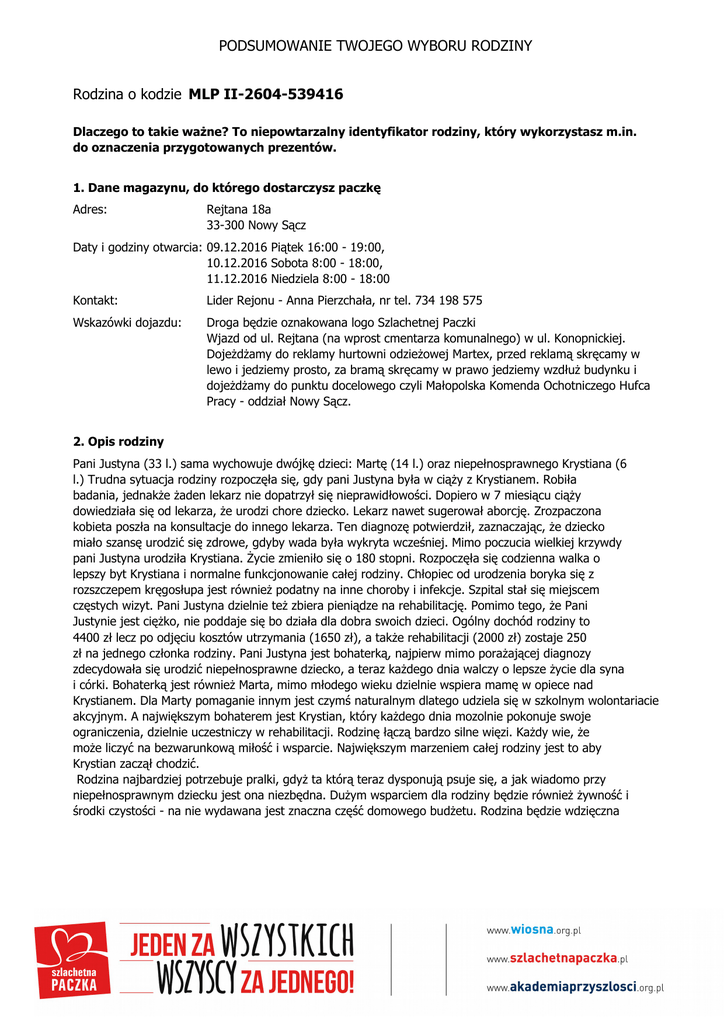 PODSUMOWANIE TWOJEGO WYBORU RODZINY Rodzina o kodzie MLP II-2604-539416 Dlaczego to takie ważne? To niepowtarzalny identyfikator rodziny, który wykorzystasz m.in. do oznaczenia przygotowanych prezentów. 1. Dane magazynu, do którego dostarczysz paczkę Adres: Rejtana 18a 33-300 Nowy Sącz Daty i godziny otwarcia: 09.12.2016 Piątek 16:00 - 19:00, 10.12.2016 Sobota 8:00 - 18:00, 11.12.2016 Niedziela 8:00 - 18:00 Kontakt: Lider Rejonu - Anna Pierzchała, nr tel. 734 198 575 Wskazówki dojazdu: Droga będzie oznakowana logo Szlachetnej Paczki Wjazd od ul. Rejtana (na wprost cmentarza komunalnego) w ul. Konopnickiej. Dojeżdżamy do reklamy hurtowni odzieżowej Martex, przed reklamą skręcamy w lewo i jedziemy prosto, za bramą skręcamy w prawo jedziemy wzdłuż budynku i dojeżdżamy do punktu docelowego czyli Małopolska Komenda Ochotniczego Hufca Pracy - oddział Nowy Sącz. 2. Opis rodziny Pani Justyna (33 l.) sama wychowuje dwójkę dzieci: Martę (14 l.) oraz niepełnosprawnego Krystiana (6 l.) Trudna sytuacja rodziny rozpoczęła się, gdy pani Justyna była w ciąży z Krystianem. Robiła badania, jednakże żaden lekarz nie dopatrzył się nieprawidłowości. Dopiero w 7 miesiącu ciąży dowiedziała się od lekarza, że urodzi chore dziecko. Lekarz nawet sugerował aborcję. Zrozpaczona kobieta poszła na konsultacje do innego lekarza. Ten diagnozę potwierdził, zaznaczając, że dziecko miało szansę urodzić się zdrowe, gdyby wada była wykryta wcześniej. Mimo poczucia wielkiej krzywdy pani Justyna urodziła Krystiana. Życie zmieniło się o 180 stopni. Rozpoczęła się codzienna walka o lepszy byt Krystiana i normalne funkcjonowanie całej rodziny. Chłopiec od urodzenia boryka się z rozszczepem kręgosłupa jest również podatny na inne choroby i infekcje. Szpital stał się miejscem częstych wizyt. Pani Justyna dzielnie też zbiera pieniądze na rehabilitację. Pomimo tego, że Pani Justynie jest ciężko, nie poddaje się bo działa dla dobra swoich dzieci. Ogólny dochód rodziny to 4400 zł lecz po odjęciu kosztów utrzymania (1650 zł), a także rehabilitacji (2000 zł) zostaje 250 zł na jednego członka rodziny. Pani Justyna jest bohaterką, najpierw mimo porażającej diagnozy zdecydowała się urodzić niepełnosprawne dziecko, a teraz każdego dnia walczy o lepsze życie dla syna i córki. Bohaterką jest również Marta, mimo młodego wieku dzielnie wspiera mamę w opiece nad Krystianem. Dla Marty pomaganie innym jest czymś naturalnym dlatego udziela się w szkolnym wolontariacie akcyjnym. A największym bohaterem jest Krystian, który każdego dnia mozolnie pokonuje swoje ograniczenia, dzielnie uczestniczy w rehabilitacji. Rodzinę łączą bardzo silne więzi. Każdy wie, że może liczyć na bezwarunkową miłość i wsparcie. Największym marzeniem całej rodziny jest to aby Krystian zaczął chodzić. Rodzina najbardziej potrzebuje pralki, gdyż ta którą teraz dysponują psuje się, a jak wiadomo przy niepełnosprawnym dziecku jest ona niezbędna. Dużym wsparciem dla rodziny będzie również żywność i środki czystości - na nie wydawana jest znaczna część domowego budżetu. Rodzina będzie wdzięczna PODSUMOWANIE TWOJEGO WYBORU RODZINY Rodzina o kodzie MLP II-2604-539416 za każdą pomoc, dzięki której będzie można oszczędzić trochę środków na rehabilitację Krystiana. 3. Potrzeby rodziny Pralka stara popsuta, a przy niepełnosprawnym dziecku jest niezbędna Żywność na nią przeznaczana jest spora część domowego budżetu Środki czystości na nią przeznaczana jest spora część domowego budżetu - Żywność trwała: Jakich produktów żywnościowych potrzebuje rodzina: Herbata, Cukier, Kawa, Makaron, Olej, Ryż, Mąka, Dżem Produkty dla niemowląt: -- Wymagania żywieniowe: -- Inne produkty żywnościowe: -- - Środki czystości Jakich środków czystości potrzebuje rodzina: Proszek do prania, Płyn do mycia naczyń, Mydło/żel myjący, Szampon Artykuły dziecięce: --- Inne: ---- - Odzież -Rodzaj odzieży: Kategoria: Rozmiar: Sylwetka: Uwagi: - Obuwie --Rodzaj obuwia: PODSUMOWANIE TWOJEGO WYBORU RODZINY Rodzina o kodzie MLP II-2604-539416 Kategoria: Rozmiar: Uwagi: - Pomoce szkolne Inne: ---- - Wyposażenie mieszkania Inne: ---- Brakujące sprzęty: Pralka , psująca się pralka brak funduszy na naprawę i zakup nowej pralki . - Inne potrzeby kurs przedłużania paznokci dla pani Justyny , lub sprzęt do robienia paznokci hybrydowych.Kobieta pragnie nauczyć się robić paznokcie, dzięki którym mogłaby dodatkowo zarabiać na rehabilitacje dla syna - Specjalne upominki Pani Justyna; słodycze lub sprzęt do robienia hybryd Krystian: wóz strażacki Marta: kosmetyki, perfumy 4. Osoby opiekujące sie rodziną - Wolontariusz opiekun rodziny E-mail: [email protected] - Lider Rejonu Imię i nazwisko: Anna Pierzchała 5. Mamy dla Ciebie kilka wskazówek, ważnych w przygotowaniu Paczki. * Paczki możesz dostarczyć wyłącznie do tego magazynu, z którego wybrana została rodzina. Wyjątkiem jest sytuacja, kiedy wybierzesz rodzinę z innego województwa, wtedy możesz dostarczyć paczkę do Magazynu Zastępczego znajdującego się w Twoim województwie (dane adresowe zamieszczone są na stronie wyboru rodziny). PODSUMOWANIE TWOJEGO WYBORU RODZINY Rodzina o kodzie MLP II-2604-539416 * Pamiętaj, że po wybraniu przez Ciebie rodziny nikt inny nie będzie już dla niej przygotowywał paczki. * Nie musisz zakupić wszystkich rzeczy z listy. Pamiętaj jednak, że wybierając rodzinę decydujesz się w pierwszej kolejności zaspokoić 3 najważniejsze potrzeby, które rodzina wymieniła w opisie. Zwróć jednak uwagę, że wszystkie wymienione rzeczy są dla rodziny bardzo ważne. * Rzeczy, które podarujesz rodzinie powinny być dla niej prezentem. Nie muszą być one nowe, a jeśli są używane – niech będą zadbane. Paczka przygotowywana jest z myślą o drugim człowieku – jest jak prezent. Przygotuj paczkę tak,