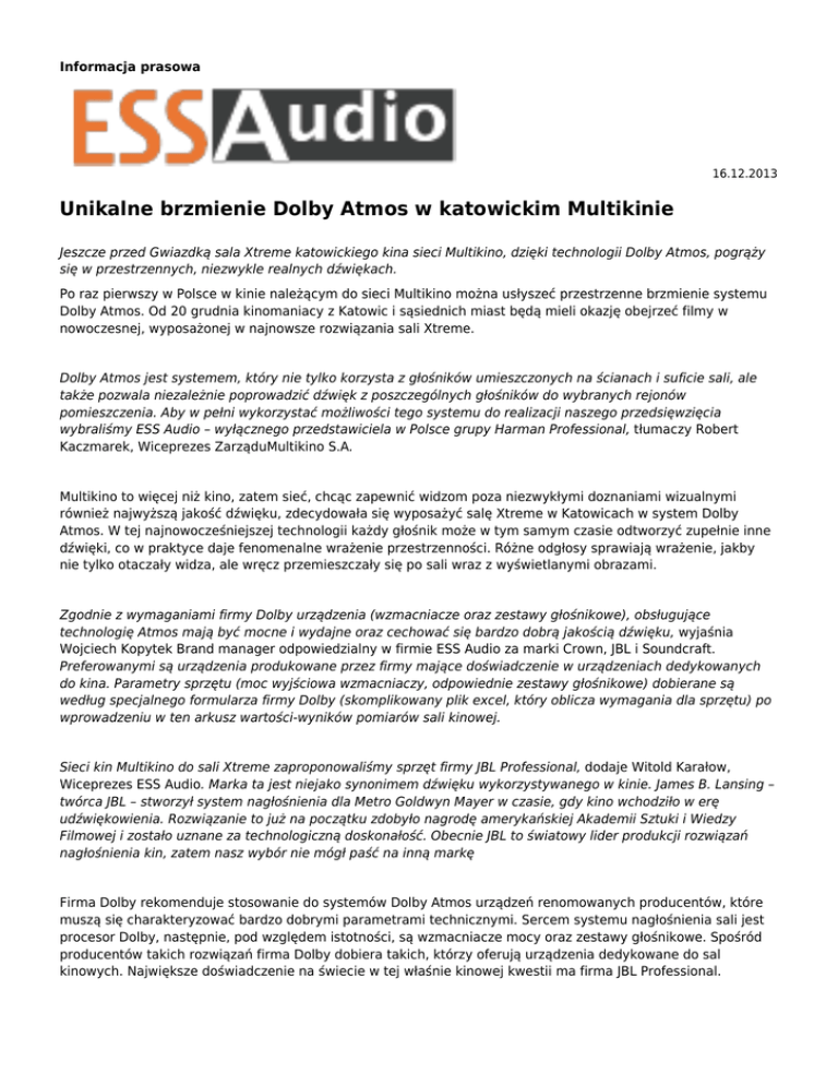 Informacja prasowa 16.12.2013 Unikalne brzmienie Dolby Atmos w katowickim Multikinie Jeszcze przed Gwiazdką sala Xtreme katowickiego kina sieci Multikino, dzięki technologii Dolby Atmos, pogrąży się w przestrzennych, niezwykle realnych dźwiękach. Po raz pierwszy w Polsce w kinie należącym do sieci Multikino można usłyszeć przestrzenne brzmienie systemu Dolby Atmos. Od 20 grudnia kinomaniacy z Katowic i sąsiednich miast będą mieli okazję obejrzeć filmy w nowoczesnej, wyposażonej w najnowsze rozwiązania sali Xtreme. Dolby Atmos jest systemem, który nie tylko korzysta z głośników umieszczonych na ścianach i suficie sali, ale także pozwala niezależnie poprowadzić dźwięk z poszczególnych głośników do wybranych rejonów pomieszczenia. Aby w pełni wykorzystać możliwości tego systemu do realizacji naszego przedsięwzięcia wybraliśmy ESS Audio – wyłącznego przedstawiciela w Polsce grupy Harman Professional, tłumaczy Robert Kaczmarek, Wiceprezes ZarząduMultikino S.A. Multikino to więcej niż kino, zatem sieć, chcąc zapewnić widzom poza niezwykłymi doznaniami wizualnymi również najwyższą jakość dźwięku, zdecydowała się wyposażyć salę Xtreme w Katowicach w system Dolby Atmos. W tej najnowocześniejszej technologii każdy głośnik może w tym samym czasie odtworzyć zupełnie inne dźwięki, co w praktyce daje fenomenalne wrażenie przestrzenności. Różne odgłosy sprawiają wrażenie, jakby nie tylko otaczały widza, ale wręcz przemieszczały się po sali wraz z wyświetlanymi obrazami. Zgodnie z wymaganiami firmy Dolby urządzenia (wzmacniacze oraz zestawy głośnikowe), obsługujące technologię Atmos mają być mocne i wydajne oraz cechować się bardzo dobrą jakością dźwięku, wyjaśnia Wojciech Kopytek Brand manager odpowiedzialny w firmie ESS Audio za marki Crown, JBL i Soundcraft. Preferowanymi są urządzenia produkowane przez firmy mające doświadczenie w urządzeniach dedykowanych do kina. Parametry sprzętu (moc wyjściowa wzmacniaczy, odpowiednie zestawy głośnikowe) dobierane są według specjalnego formularza firmy Dolby (skomplikowany plik excel, który oblicza wymagania dla sprzętu) po wprowadzeniu w ten arkusz wartości-wyników pomiarów sali kinowej. Sieci kin Multikino do sali Xtreme zaproponowaliśmy sprzęt firmy JBL Professional, dodaje Witold Karałow, Wiceprezes ESS Audio. Marka ta jest niejako synonimem dźwięku wykorzystywanego w kinie. James B. Lansing – twórca JBL – stworzył system nagłośnienia dla Metro Goldwyn Mayer w czasie, gdy kino wchodziło w erę udźwiękowienia. Rozwiązanie to już na początku zdobyło nagrodę amerykańskiej Akademii Sztuki i Wiedzy Filmowej i zostało uznane za technologiczną doskonałość. Obecnie JBL to światowy lider produkcji rozwiązań nagłośnienia kin, zatem nasz wybór nie mógł paść na inną markę Firma Dolby rekomenduje stosowanie do systemów Dolby Atmos urządzeń renomowanych producentów, które muszą się charakteryzować bardzo dobrymi parametrami technicznymi. Sercem systemu nagłośnienia sali jest procesor Dolby, następnie, pod względem istotności, są wzmacniacze mocy oraz zestawy głośnikowe. Spośród producentów takich rozwiązań firma Dolby dobiera takich, którzy oferują urządzenia dedykowane do sal kinowych. Największe doświadczenie na świecie w tej właśnie kinowej kwestii ma firma JBL Professional. W katowickim Multikinie we wnętrzu sali Xtreme zamontowanych zostanie 49 głośników firmy JBL, tym 40 surroundów JBL 8350 wysokiej jakości i mocy umieszczonych nie tylko na ścianach, jak w zwykłych kinach, ale i na suficie. W odróżnieniu od standardowych sal kinowych, na wyposażeniu będzie również pięć (nie zwyczajowych trzy) kolumn głośnikowych frontowych typu screen array JBL 3732 i aż cztery subwoofery (normalnie w klasycznych systemach są dwa): dwa JBL 4645C na pojedynczych przetwornikach 18-calowych i dwa na dwóch 18-calowych przetwornikach. Ponadto w szafie rack znajdzie się 16 wzmacniaczy Crown (4 i 8 kanałowych). Cały materiał dźwiękowy z filmu jest dostarczany do procesora Dolby CP850 z serwera, audio jest w postaci cyfrowej, każdy kanał jest osobnym "śladem" – opowiada Wojciech Kopytek, wyjaśniając działanie systemu Atmos. Dźwięk jest transportowany z serwera do procesora dwukanałowymi połączeniami AES/EBU, ilość par jest zależna od wielkości systemu Dolby Atmos zainstalowanego w danym kinie. Maksymalna ilość kanałów w systemie Dolby Atmos to 64. Umiejscowienie nagłośnienia w salach obsługujących nową technologię firmy Atmos musi spełniać wymagania Dolby. Sala taka wyposażana jest w pięćgłównych kanałów zaekranowych, kanał subniskotonowy zaekranowy, kanały efektowe subniskotonowe na tylnej ścianie sali, głośniki kanałów efektowych rozmieszczone na bocznych ścianach, na tylnej ścianie sali oraz w dwóch rzędach nad głowami widzów. Co jest szalenie istotne, to fakt, iż każdy głośnik efektowy jest zasilany osobnym sygnałem (jeśli głośników efektowych w sali jest np. 40, to jest to 40 odrębnych kanałów audio). Rozmieszczenie głośników w sali odbywa się na podstawie pomiarów sali (na etapie budowlanym) i wykorzystuje się w tym procesie szczegółowe wytyczne zawarte w "specyfikacji technicznej" dla systemów Dolby Atmos. Projektowaniem systemów Dolby Atmos zajmują się przeszkoleni przez firmę Dolby w tej dziedzinie ludzie. Wzmacniacze mocy zasilające zestawy głośnikowe umieszczone są w szafie aparaturowej w pomieszczeniu kabiny projekcyjnej. Ze względu na dużą ilość niezależnych kanałów audio w systemie Dolby Atmos instaluje się wiele wzmacniaczy. Informacje o firmie ESS Audio jest wyłącznym przedstawicielem handlowym w Polsce grupy Harman Professional będącej jednym z największych na świecie producentów w branży audio. Do Grupy Harman Professional należą marki: JBL, Crown, dbx, Soundcraft, BS