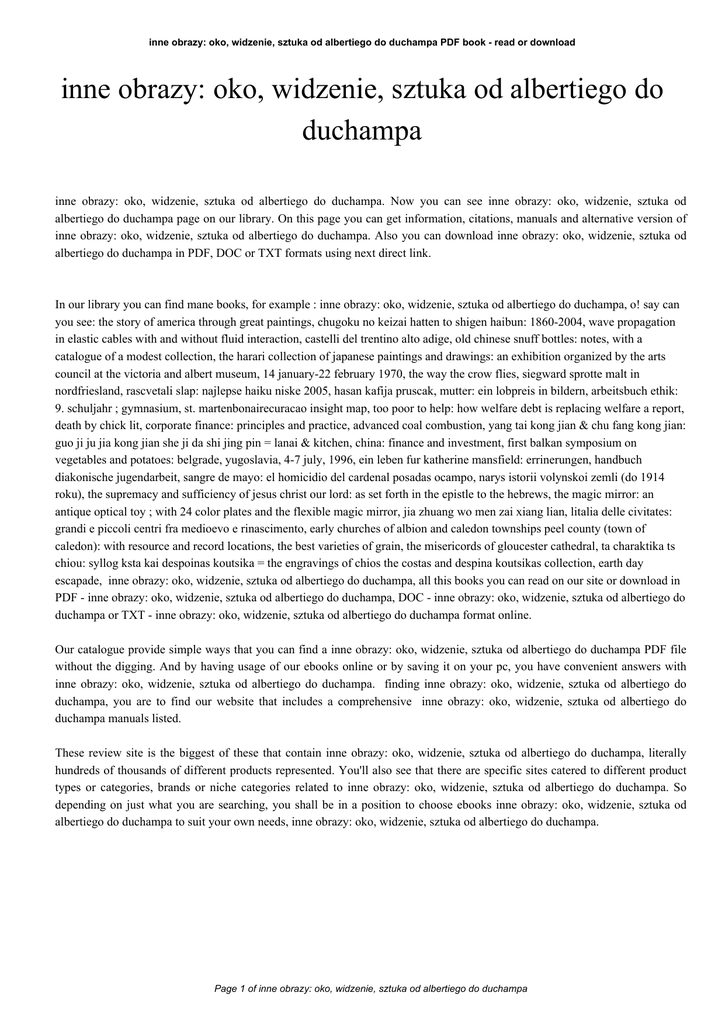 inne obrazy: oko, widzenie, sztuka od albertiego do duchampa PDF book - read or download inne obrazy: oko, widzenie, sztuka od albertiego do duchampa inne obrazy: oko, widzenie, sztuka od albertiego do duchampa. Now you can see inne obrazy: oko, widzenie, sztuka od albertiego do duchampa page on our library. On this page you can get information, citations, manuals and alternative version of inne obrazy: oko, widzenie, sztuka od albertiego do duchampa. Also you can download inne obrazy: oko, widzenie, sztuka od albertiego do duchampa in PDF, DOC or TXT formats using next direct link. In our library you can find mane books, for example : inne obrazy: oko, widzenie, sztuka od albertiego do duchampa, o! say can you see: the story of america through great paintings, chugoku no keizai hatten to shigen haibun: 1860-2004, wave propagation in elastic cables with and without fluid interaction, castelli del trentino alto adige, old chinese snuff bottles: notes, with a catalogue of a modest collection, the harari collection of japanese paintings and drawings: an exhibition organized by the arts council at the victoria and albert museum, 14 january-22 february 1970, the way the crow flies, siegward sprotte malt in nordfriesland, rascvetali slap: najlepse haiku niske 2005, hasan kafija pruscak, mutter: ein lobpreis in bildern, arbeitsbuch ethik: 9. schuljahr ; gymnasium, st. martenbonairecuracao insight map, too poor to help: how welfare debt is replacing welfare a report, death by chick lit, corporate finance: principles and practice, advanced coal combustion, yang tai kong jian & chu fang kong jian: guo ji ju jia kong jian she ji da shi jing pin = lanai & kitchen, china: finance and investment, first balkan symposium on vegetables and potatoes: belgrade, yugoslavia, 4-7 july, 1996, ein leben fur katherine mansfield: errinerungen, handbuch diakonische jugendarbeit, sangre de mayo: el homicidio del cardenal posadas ocampo, narys istorii volynskoi zemli (do 1914 roku), the supremacy and sufficiency of jesus christ our lord: as set forth in the epistle to the hebrews, the magic mirror: an antique optical toy ; with 24 color plates and the flexible magic mirror, jia zhuang wo men zai xiang lian, litalia delle civitates: grandi e piccoli centri fra medioevo e rinascimento, early churches of albion and caledon townships peel county (town of caledon): with resource and record locations, the best varieties of grain, the misericords of gloucester cathedral, ta charaktika ts chiou: syllog ksta kai despoinas koutsika = the engravings of chios the costas and despina koutsikas collection, earth day escapade, inne obrazy: oko, widzenie, sztuka od albertiego do duchampa, all this books you can read on our site or download in PDF - inne obrazy: oko, widzenie, sztuka od albertiego do duchampa, DOC - inne obrazy: oko, widzenie, sztuka od albertiego do duchampa or TXT - inne obrazy: oko, widzenie, sztuka od albertiego do duchampa format online. Our catalogue provide simple ways that you can find a inne obrazy: oko, widzenie, sztuka od albertiego do duchampa PDF file without the digging. And by having usage of our ebooks online or by saving it on your pc, you have convenient answers with inne obrazy: oko, widzenie, sztuka od albertiego do duchampa. finding inne obrazy: oko, widzenie, sztuka od albertiego do duchampa, you are to find our website that includes a comprehensive inne obrazy: oko, widzenie, sztuka od albertiego do duchampa manuals listed. These review site is the biggest of these that contain inne obrazy: oko, widzenie, sztuka od albertiego do duchampa, literally hundreds of thousands of different products represented. You'll also see that there are specific sites catered to different product types or categories, brands or niche categories related to inne obrazy: oko, widzenie, sztuka od albertiego do duchampa. So depending on just what you are searching, you shall be in a position to choose ebooks inne obrazy: oko, widzenie, sztuka od albertiego do duchampa to suit your own needs, inne obrazy: oko, widzenie, sztuka od albertiego do duchampa. Page 1 of inne obrazy: oko, widzenie, sztuka od albertiego do duchampa