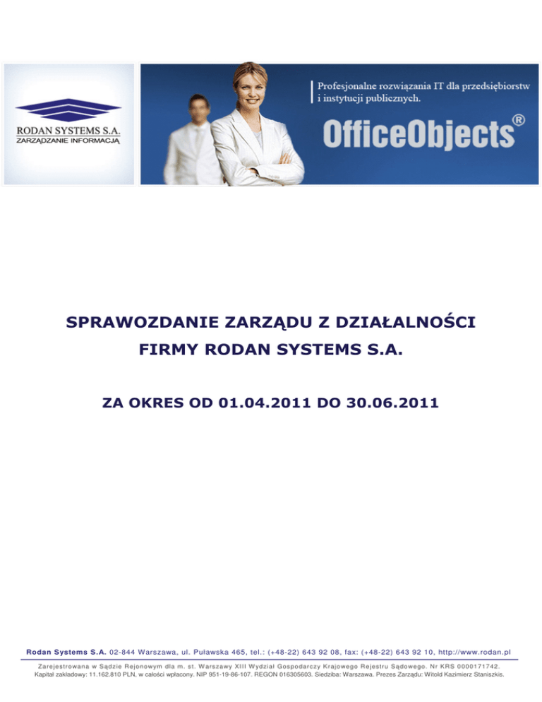 SPRAWOZDANIE ZARZĄDU Z DZIAŁALNOŚCI FIRMY RODAN SYSTEMS S.A. ZA OKRES OD 01.04.2011 DO 30.06.2011 Rodan Systems S.A. 02-844 W arszawa, ul. Puławska 465, tel.: (+48-22) 643 92 08, fax: (+48-22) 643 92 10, http://www.rodan.pl Zarejestrowana w Sądzie R ejonowym dla m. s t. W arszawy XI II W ydział Gos podarc zy Krajowego R ejestru Sądowego. N r KRS 0000171742. Kapitał zakładowy: 11.162.810 PLN, w całości wpłacony. NIP 951-19-86-107. REGON 016305603. Siedziba: Warszawa. Prezes Zarządu: Witold Kazimierz Staniszkis. List Prezesa Zarządu Rodan Systems S.A. Szanowni Państwo, oddajemy w Państwa ręce raport obejmujący drugi kwartał 2011. W tym okresie pozyskaliśmy dwóch nowych klientów: Urząd do Spraw Cudzoziemców oraz Urząd Miasta i Gminy Krotoszyn oraz zakończyliśmy ostatni etap projektu Budowa Zintegrowanego Systemu Centralnego dla Agencji Nieruchomości Rolnych o łącznej wartości 1 387 506 PLN brutto. Zainspirowani sukcesem Platformy Zarządzania Wiedzą wdrożonej dla Fundacji Technology Partners oraz wykorzystywanej przez 9 instytutów naukowo-badawczych, na bieżąco podejmujemy działania związane z promocją tego typu rozwiązań w środowisku naukowym i biznesowym. W drugim kwartale 2011 roku intensywnie promowaliśmy nasz nowy produkt na kilku konferencjach krajowych i międzynarodowych w tym między innymi na europejskiej konferencji EARTO (European Association of Research and Technology Organisations) – stowarzyszenia organizacji naukowo-badawczych z obszaru zaawansowanych technologii. Miło mi również poinformować, że w maju 2011 roku Spółka zrealizowała pierwszy projekt komercyjny dla uczelni – wdrożenie platformy obiegu dokumentów OfficeObjects®Document Manager na Wydziale Zarządzania Politechniki Warszawskiej. Udana współpraca z tym klientem pozwoliła na uzyskanie referencji ważnych i przydatnych w środowisku akademickim. Ponadto wzrastające zapotrzebowanie uczelni na systemy obiegu dokumentów, zarządzania wiedzą a przede wszystkim cyfrowe repozytoria efektów prac naukowobadawczych, daje duże perspektywy zwiększania udziału Spółki w tym rynku w kolejnych kwartałach 2011 roku. Z wyrazami szacunku, Warszawa, 4 sierpnia 2011 Rodan Systems S.A. 02-844 W arszawa, ul. Puławska 465, tel.: (+48-22) 643 92 08, fax: (+48-22) 643 92 10, http://www.rodan.pl Zarejestrowana w Sądzie R ejonowym dla m. s t. W arszawy XI II W ydział Gos podarc zy Krajowego R ejestru Sądowego. N r KRS 0000171742. Kapitał zakładowy: 11.162.810 PLN, w całości wpłacony. NIP 951-19-86-107. REGON 016305603. Siedziba: Warszawa. Prezes Zarządu: Witold Kazimierz Staniszkis. SPRAWOZDANIE ZA II KWARTAŁ 2011 ROKY Z DZIAŁALNOŚCI EMITETNTA 1. DANE ORGANIZACYJNE SPÓŁKI Nazwa Spółki: Rodan Systems S.A. Forma prawna: Spółka Akcyjna Siedziba: ul. Puławska 465, 02 - 844, Warszawa, Polska Telefon: +48 (22) 643 92 08 Faks: +48 (22) 643 92 10 Strona www: www.rodan.pl Data rejestracji: 11.09.2003 r. Sąd: Sąd Rejonowy dla m.st. Warszawy w Warszawie, XIII Wydział Gospodarczy Krajowego Rejestru Sądowego Numer KRS: 0000171742 Regon: 016305603 NIP: 9511986107 2. KAPITAŁ ZAKŁADOWY Kapitał zakładowy Spółki wynosi 11.162.810,00 /jedenaście milionów sto sześćdziesiąt dwa tysiące osiemset dziesięć/ złotych i dzieli się na: a) 3.206.000 /trzy miliony dwieście sześć tysięcy/ akcji zwykłych, na okaziciela serii A o wartości nominalnej 1,00 /jeden/ złoty każda akcja, b) 400.000 /czterysta tysięcy/ akcji zwykłych, na okaziciela serii B o wartości nominalnej 1,00 /jeden/złoty każda akcja, c) 859.124 /osiemset pięćdziesiąt dziewięć tysięcy sto dwadzieścia cztery/ akcji zwykłych, na okaziciela serii C o wartości nominalnej 1,00 /jeden/ złoty każda akcja, d) 6.697.686 /sześć milionów sześćset dziewięćdziesiąt siedem tysięcy sześćset osiemdziesiąt sześć/ akcji zwykłych, na okaziciela serii D o wartości nominalnej 1,00 /jeden/ złoty każda akcja. 3. PODSTAWOWE INFORMACJE NA TEMAT POWIĄZAŃ ORGANIZACYJNYCH LUB KAPITAŁOWYCH SPÓŁKI Podmiot zależny. Spółka OfficeObjects Sp. z o.o. z siedzibą w Sopocie, w którym Rodan Systems objęła 100 % udziałów, wnosząc aportem zorganizowaną część przedsiębiorstwa w postaci Oddziału Sopot. Spółka OfficeObjects Sp. z o.o. zajmuje się rozwijaniem produktów i narzędzi programistycznych z rodziny OfficeObjects. Spółka została zarejestrowana 19 marca 2010. Rodan Systems Sp. z o.o., wspólnikami Spółki Rodan System Sp. z o.o. są Witold Kazimierz Staniszkis i Witold Jeremi Staniszkis, posiadający odpowiednio 75% i 25% łącznej liczby udziałów tej spółki, uprawniających do wykonywania 75% i 25% głosów na Zgromadzeniu Wspólników. Jedynym członkiem Zarządu Spółki Rodan System Sp. z o.o. jest Witold Kazimierz Staniszkis. Pomiędzy Spółką a Rodan System Sp. z o.o. istnieją również powiązania osobowe wynikające z faktu, iż Witold Kazimierz Staniszkis będąc jednym członkiem Zarządu Spółki Rodan System Sp. z o.o. pełni jednocześnie funkcję Prezesa Zarządu Spółki, a także powiązania gospodarcze polegające na realizowaniu między Spółkami i Rodan System Sp. z o.o. współpracy operacyjnej w pokrywającym się zakresie prowadzonej przez oba podmioty Rodan Systems S.A. 02-844 W arszawa, ul. Puławska 465, tel.: (+48-22) 643 92 08, fax: (+48-22) 643 92 10, http://www.rodan.pl Zarejestrowana w Sądzie R ejonowym dla m. s t. W arszawy XI II W ydział Gos podarc zy Krajowego R ejestru Sądowego. N r KRS 0000171742. Kapitał zakładowy: 11.162.810 PLN, w całości wpłacony. NIP 951-19-86-107. REGON 016305603. Siedziba: Warszawa. Prezes Zarządu: Witold Kazimierz Staniszkis. działalności gospodarczej Rodan System Sp. z o.o. prowadzi działalność gospodarczą pod tym samym adresem co Spółka. 4. STRUKTURA AKCJONARIATU Tabela 1 Struktura akcjonariatu Spółki Akcjonariusz Rodan System Sp. z o.o. SANTONESSA Limited (Cypr) DEPCORER INTER