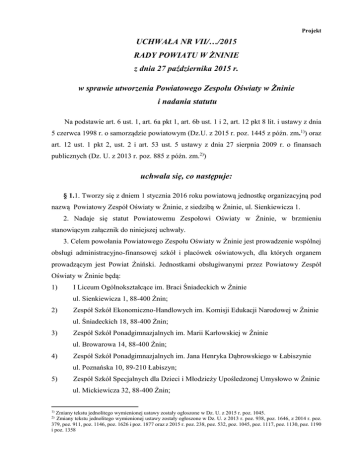 Projekt UCHWAŁA NR VII/…/2015 RADY POWIATU W ŻNINIE z dnia 27 października 2015 r. w sprawie utworzenia Powiatowego Zespołu Oświaty w Żninie i nadania statutu Na podstawie art. 6 ust. 1, art. 6a pkt 1, art. 6b ust. 1 i 2, art. 12 pkt 8 lit. i ustawy z dnia 5 czerwca 1998 r. o samorządzie powiatowym (Dz.U. z 2015 r. poz. 1445 z późn. zm.1)) oraz art. 12 ust. 1 pkt 2, ust. 2 i art. 53 ust. 5 ustawy z dnia 27 sierpnia 2009 r. o finansach publicznych (Dz. U. z 2013 r. poz. 885 z późn. zm.2)) uchwala się, co następuje: § 1.1. Tworzy się z dniem 1 stycznia 2016 roku powiatową jednostkę organizacyjną pod nazwą Powiatowy Zespół Oświaty w Żninie, z siedzibą w Żninie, ul. Sienkiewicza 1. 2. Nadaje się statut Powiatowemu Zespołowi Oświaty w Żninie, w brzmieniu stanowiącym załącznik do niniejszej uchwały. 3. Celem powołania Powiatowego Zespołu Oświaty w Żninie jest prowadzenie wspólnej obsługi administracyjno-finansowej szkół i placówek oświatowych, dla których organem prowadzącym jest Powiat Żniński. Jednostkami obsługiwanymi przez Powiatowy Zespół Oświaty w Żninie będą: 1) I Liceum Ogólnokształcące im. Braci Śniadeckich w Żninie ul. Sienkiewicza 1, 88-400 Żnin; 2) Zespół Szkół Ekonomiczno-Handlowych im. Komisji Edukacji Narodowej w Żninie ul. Śniadeckich 18, 88-400 Żnin; 3) Zespół Szkół Ponadgimnazjalnych im. Marii Karłowskiej w Żninie ul. Browarowa 14, 88-400 Żnin; 4) Zespół Szkół Ponadgimnazjalnych im. Jana Henryka Dąbrowskiego w Łabiszynie ul. Poznańska 10, 89-210 Łabiszyn; 5) Zespół Szkół Specjalnych dla Dzieci i Młodzieży Upośledzonej Umysłowo w Żninie ul. Mickiewicza 32, 88-400 Żnin; Zmiany tekstu jednolitego wymienionej ustawy zostały ogłoszone w Dz. U. z 2015 r. poz. 1045. Zmiany tekstu jednolitego wymienionej ustawy zostały ogłoszone w Dz. U. z 2013 r. poz. 938, poz. 1646, z 2014 r. poz. 379, poz. 911, poz. 1146, poz. 1626 i poz. 1877 oraz z 2015 r. poz. 238, poz. 532, poz. 1045, poz. 1117, poz. 1130, poz. 1190 i poz. 1358 1) 2) 6) Centrum Kształcenia Ustawicznego w Żninie ul. Sienkiewicza 1A, 88-400 Żnin; 7) Poradnia Psychologiczno-Pedagogiczna w Żninie ul. Browarowa 14, 88-400 Żnin. 4. Prowadzenie przez Powiatowy Zespół Oświaty w Żninie wspólnej obsługi dla jednostek obsługiwanych wymienionych w ust. 3 w zakresie określonym w statucie następuje z dniem 1 lutego 2016 r. 5. Powiatowy Zespół Oświaty w Żninie prowadzi gospodarkę finansową według zasad określonych w ustawie o finansach publicznych. § 2. Traci moc uchwała Nr IV/46/2015 Rady Powiatu w Żninie z dnia 24 kwietnia 2015r. w sprawie utworzenia Powiatowego Zespołu Oświaty w Żninie i nadania statutu. § 3. Wykonanie uchwały powierza się Zarządowi Powiatu w Żninie. § 4. Uchwała wchodzi w życie z dniem 1 stycznia 2016 r. z wyjątkiem § 2, który wchodzi w życie z dniem podjęcia. Uzasadnienie Ustawa z dnia 25 czerwca 2015 r. o zmianie ustawy o samorządzie gminnym oraz niektórych innych ustaw (Dz.U. poz. 1045) uregulowała zasady tworzenia przez jednostki samorządu terytorialnego wspólnej obsługi administracyjnej, finansowej i organizacyjnej podległych jednostek w celu poprawy funkcjonowania i organizacji wykonywania zadań publicznych przez JST. Zasady te wchodzą w życie z dniem 1 stycznia 2016r. Jednocześnie uniemożliwiła jednostkom samorządu terytorialnego tworzenie zespołów obsługi ekonomiczno-administracyjnej szkół na mocy art. 5 ust. 9 ustawy z dnia 7 września 1991 r. o systemie oświaty. Istniejące w tej formie jednostki obsługi szkół ulegają likwidacji w terminie 12 miesięcy od dnia wejścia w życie niniejszej ustawy. Na mocy uchwały 24 kwietnia 2015r. Nr IV/46/2015 Rady Powiatu w Żninie z dnia zaplanowano utworzenie z dniem 1 grudnia 2015r. Powiatowego Zespołu Oświaty w Żninie w formule przewidzianej w art. 5 ust. 9 ustawy o systemie oświaty. W związku z tym, że PZO w Żninie jeszcze nie rozpoczął swojej działalności, w celu uniknięcia jego likwidacji w terminie przewidzianym przez ustawę o zmianie ustawy o samorządzie gminnym oraz niektórych innych ustaw, uchyla się uchwałę Nr IV/46/2015 Rady Powiatu w Żninie z dnia 24 kwietnia 2015r. Jednocześnie tworzy się Powiatowy Zespół Oświaty w Żninie jako jednostkę organizacyjną, której celem jest prowadzenie wspólnej obsługi administracyjno-finansowej szkół i placówek oświatowych w formule przewidzianej w ustawie z dnia 25 czerwca 2015 r. o zmianie ustawy o samorządzie gminnym oraz niektórych innych ustaw. Zgodnie z wprowadzoną zmianą ustawy o samorządzie powiatowym, w art. 6b ust. 2 upoważniono Radę Powiatu do określenia w ramach wspólnej obsługi: jednostki obsługujące, jednostki obsługiwane oraz zakres obowiązków powierzonych jednostkom obsługującym. Organ prowadzący szkoły lub placówki odpowiada za ich działalność. Do zadań organu prowadzącego w szczególności należy zapewnienie warunków działania szkoły lub placówki, w tym bezpiecznych i higienicznych warunków nauki, wychowania i opieki; wykonywanie remontów obiektów szkolnych oraz zadań inwestycyjnych w tym zakresie; wyposażenie szkoły lub placówki w pomoce dydaktyczne i sprzęt niezbędny do pełnej realizacji programów nauczania, programów wychowawczych, przeprowadzania sprawdzianów i egzaminów, wykonywania innych zadań statutowych oraz zapewnienie obsługi administracyjnej, finansowej i organizacyjnej szkół i placówek oświatowych. Obsługa finansowa jednostki obejmuje m.in. prowadzenie - na podstawie dowodów księgowych - ksiąg rachunkowych, ujmujących zapisy zdarzeń w porządku chronologicznym i systematycznym; okresowe ustalanie lub sprawdzanie drogą inwentaryzacji rzeczywistego stanu aktywów i pasywów, wycenę aktywów i pasywów oraz ustalanie wyniku finansowego; sporządzanie sprawozdań finansowych; gromadzenie i przechowywanie dowodów księgowych oraz pozostałej dokumentacji